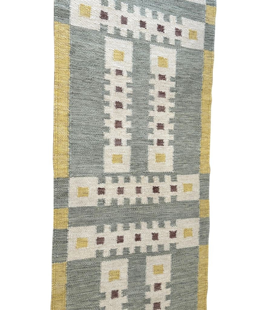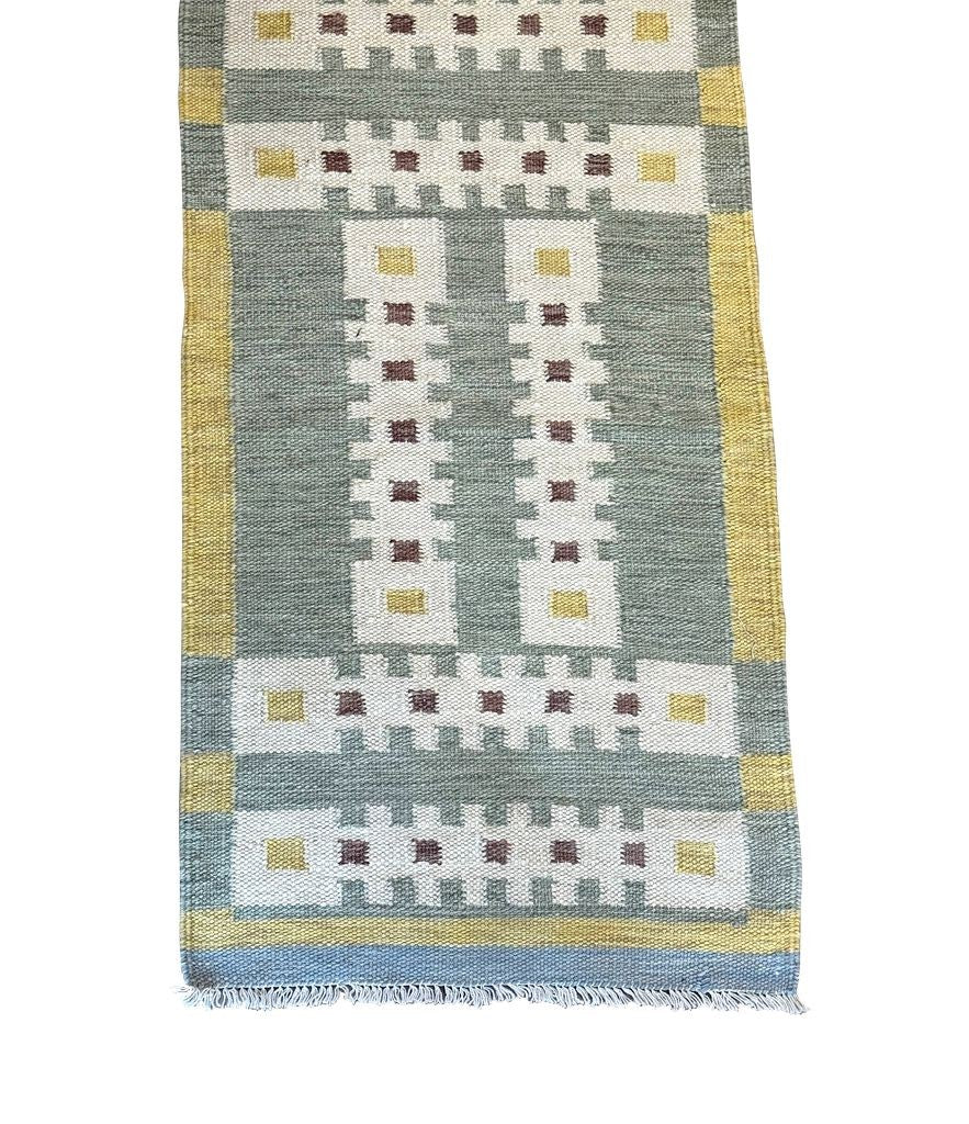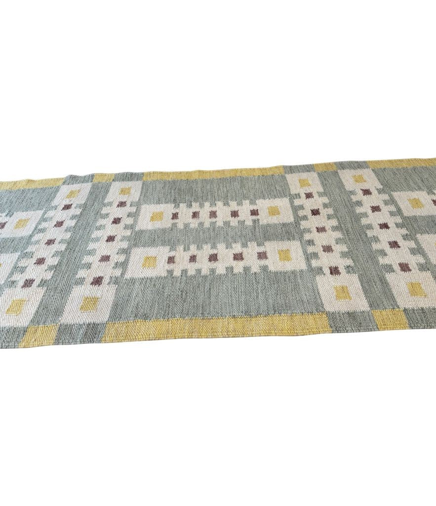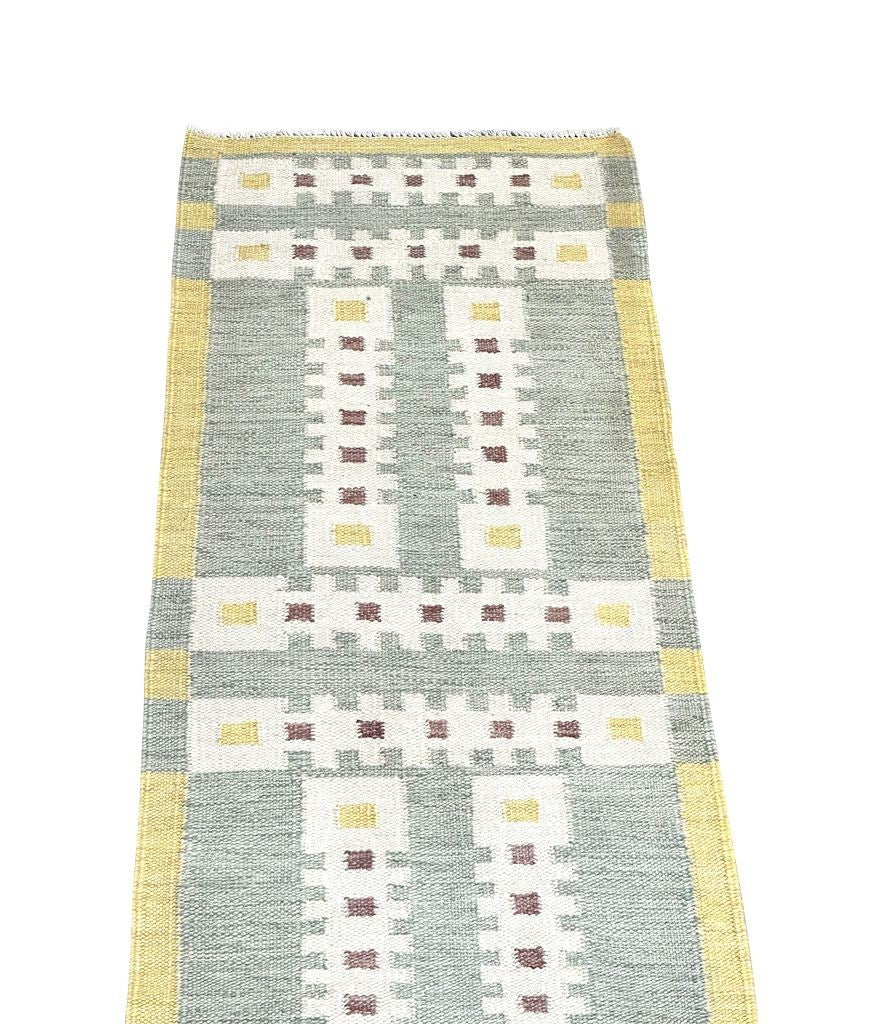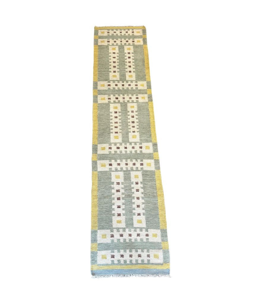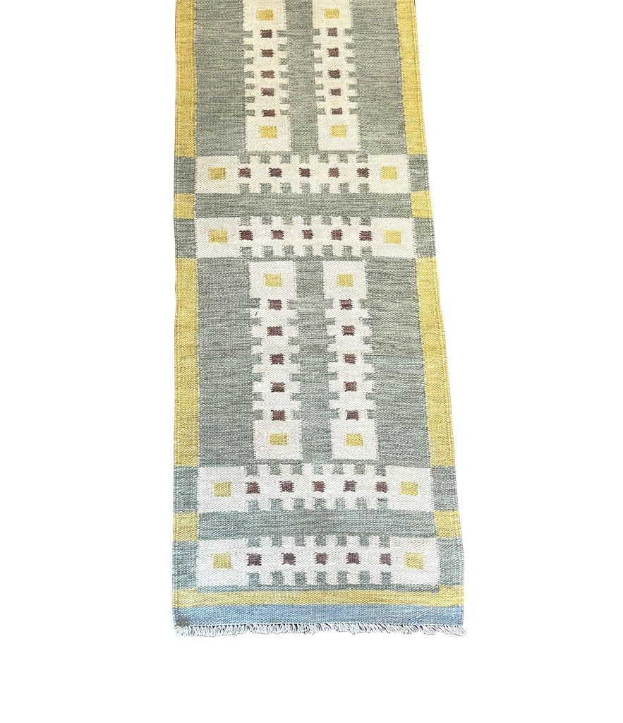 A Babro Nilsson inspired Scandinavian design style, handwoven flat weave wool rug runner, in green and yellow mid century tones.