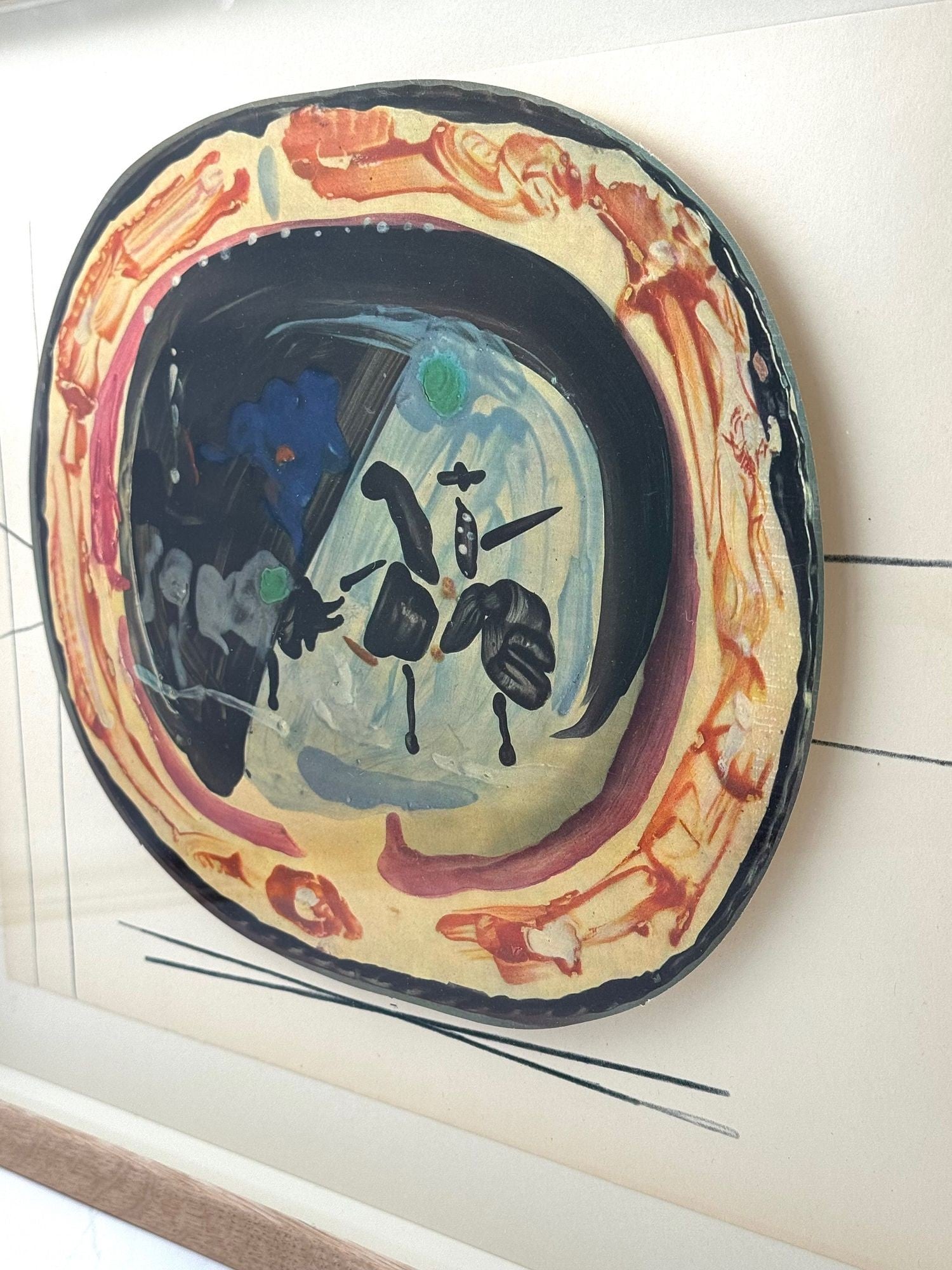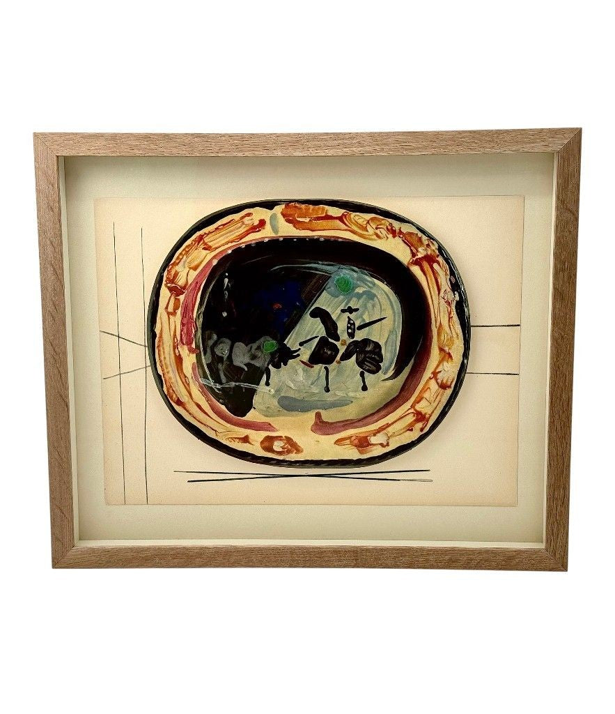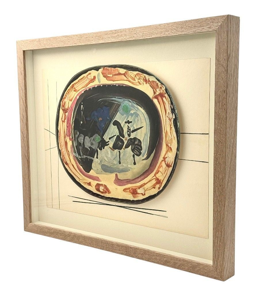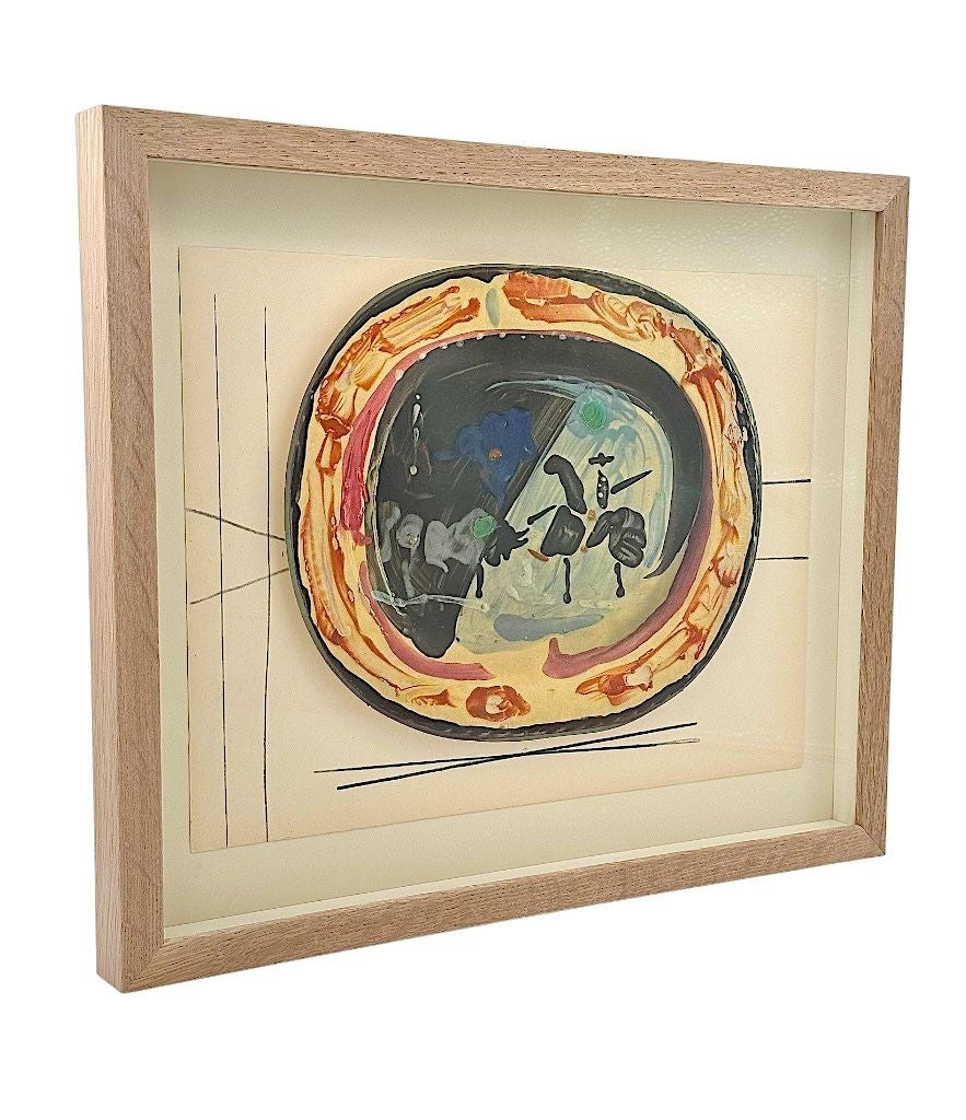 A framed lithographic plate from the 1948 Swedish, numbered limited edition portfolio of only 200 “Ceramiques de Picasso” by Albert Skira, framed, with the die-cut, gloss coloured lithograph of a ceramic plate with Picasso painting of a bull and picador. The “plate” is float mounted in natural oak box frame and glazed with UV protective art glass.