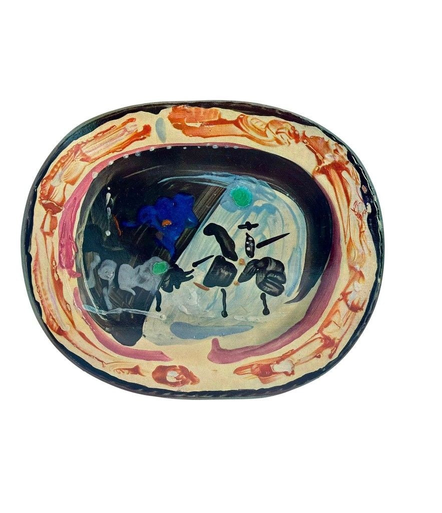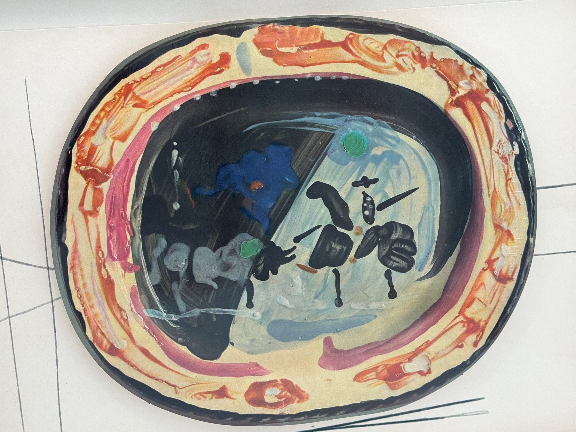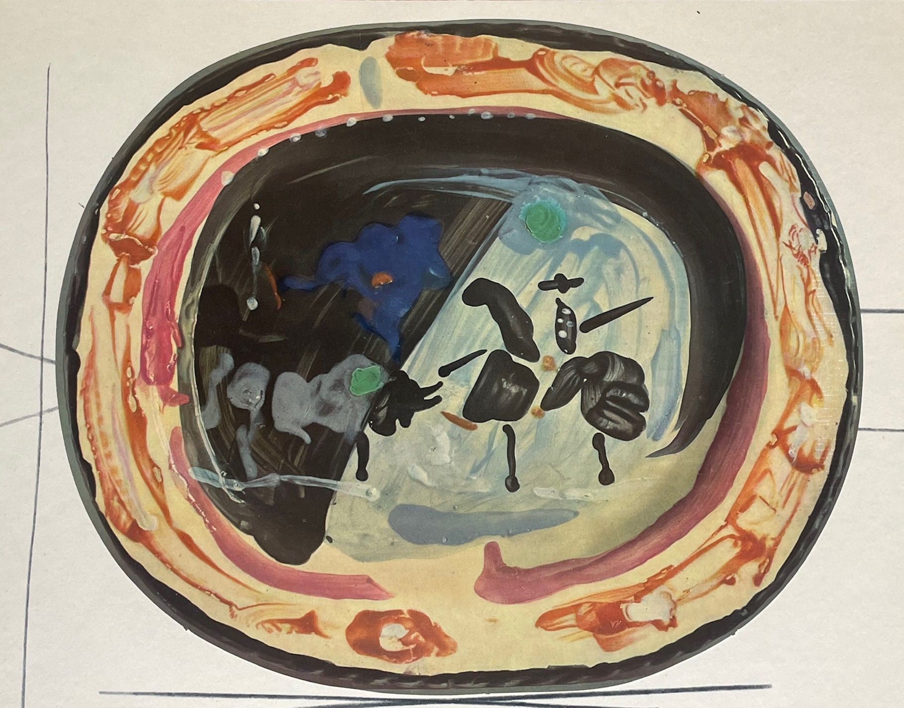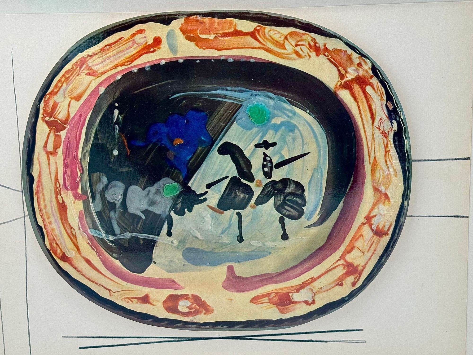 A framed lithographic plate from the 1948 Swedish, numbered limited edition portfolio of only 200 “Ceramiques de Picasso” by Albert Skira, framed, with the die-cut, gloss coloured lithograph of a ceramic plate with Picasso painting of a bull and picador. The “plate” is float mounted in natural oak box frame and glazed with UV protective art glass.