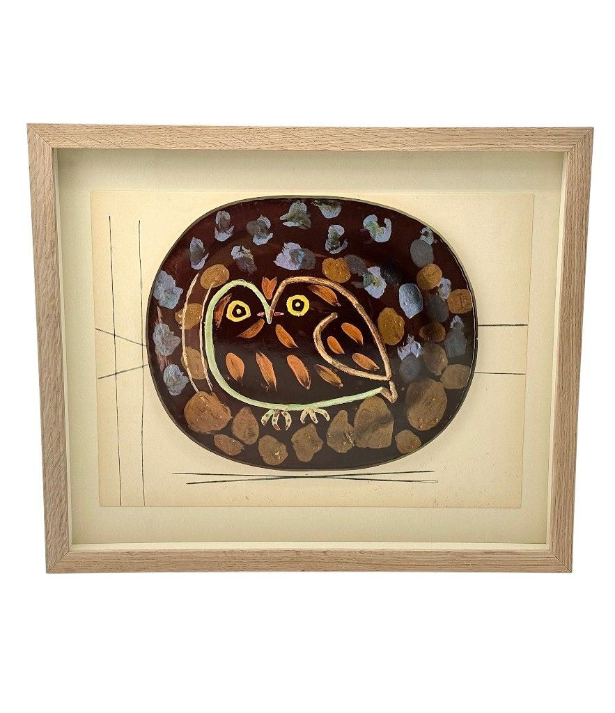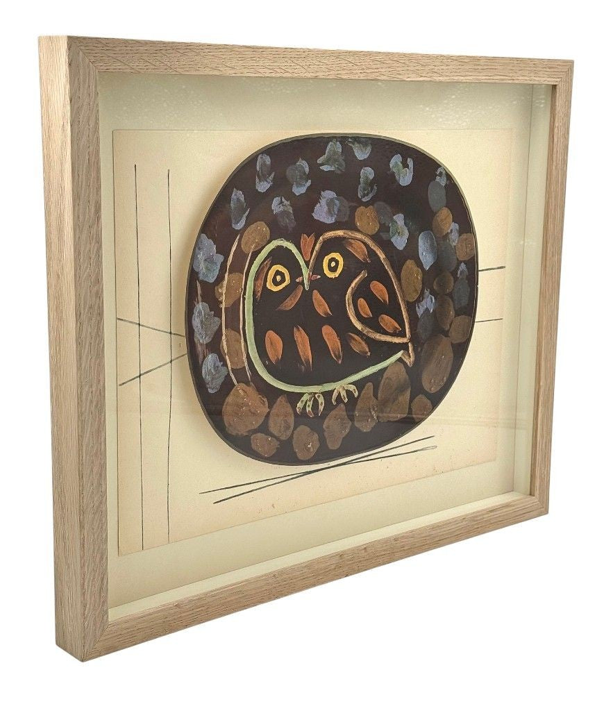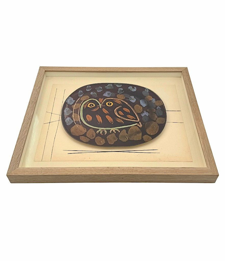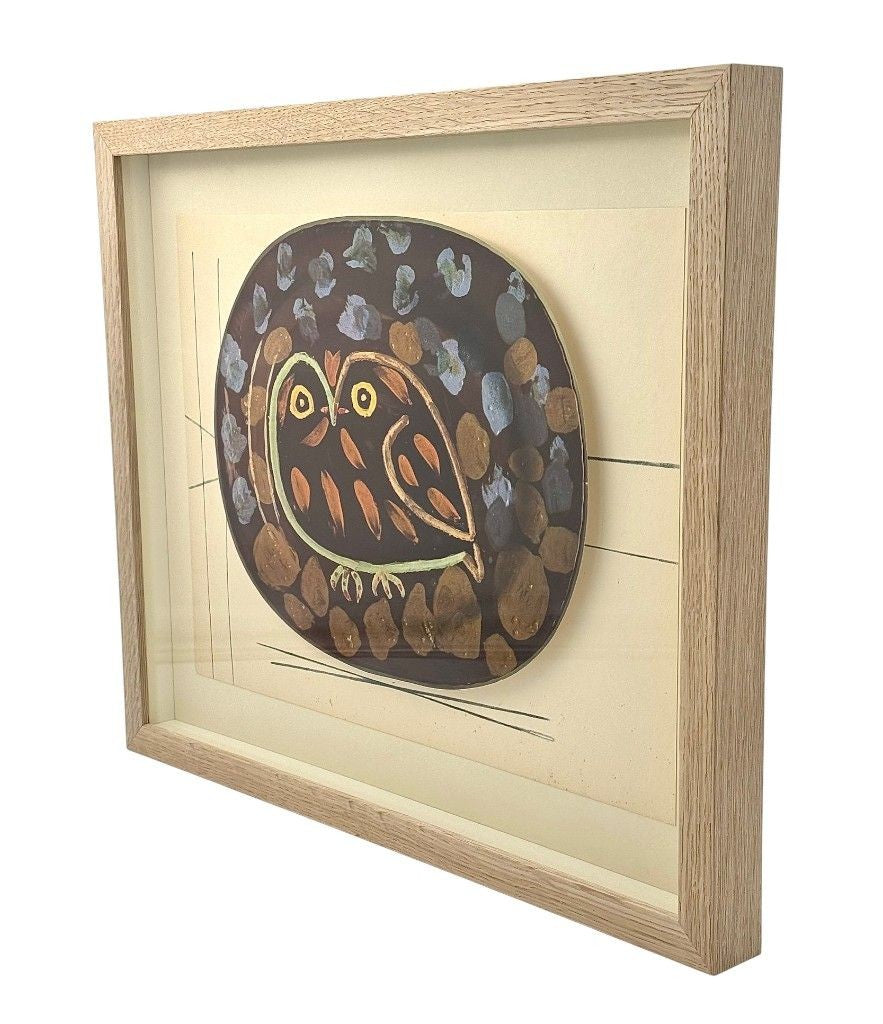 A framed lithographic plate from the 1948 Swedish, numbered limited edition portfolio of only 200 “Ceramiques de Picasso” by Albert Skira, framed, with the die-cut, gloss coloured lithograph of a ceramic plate with Picasso painting of an owl. The “plate” is float mounted in natural oak box frame and glazed with UV protective art glass.