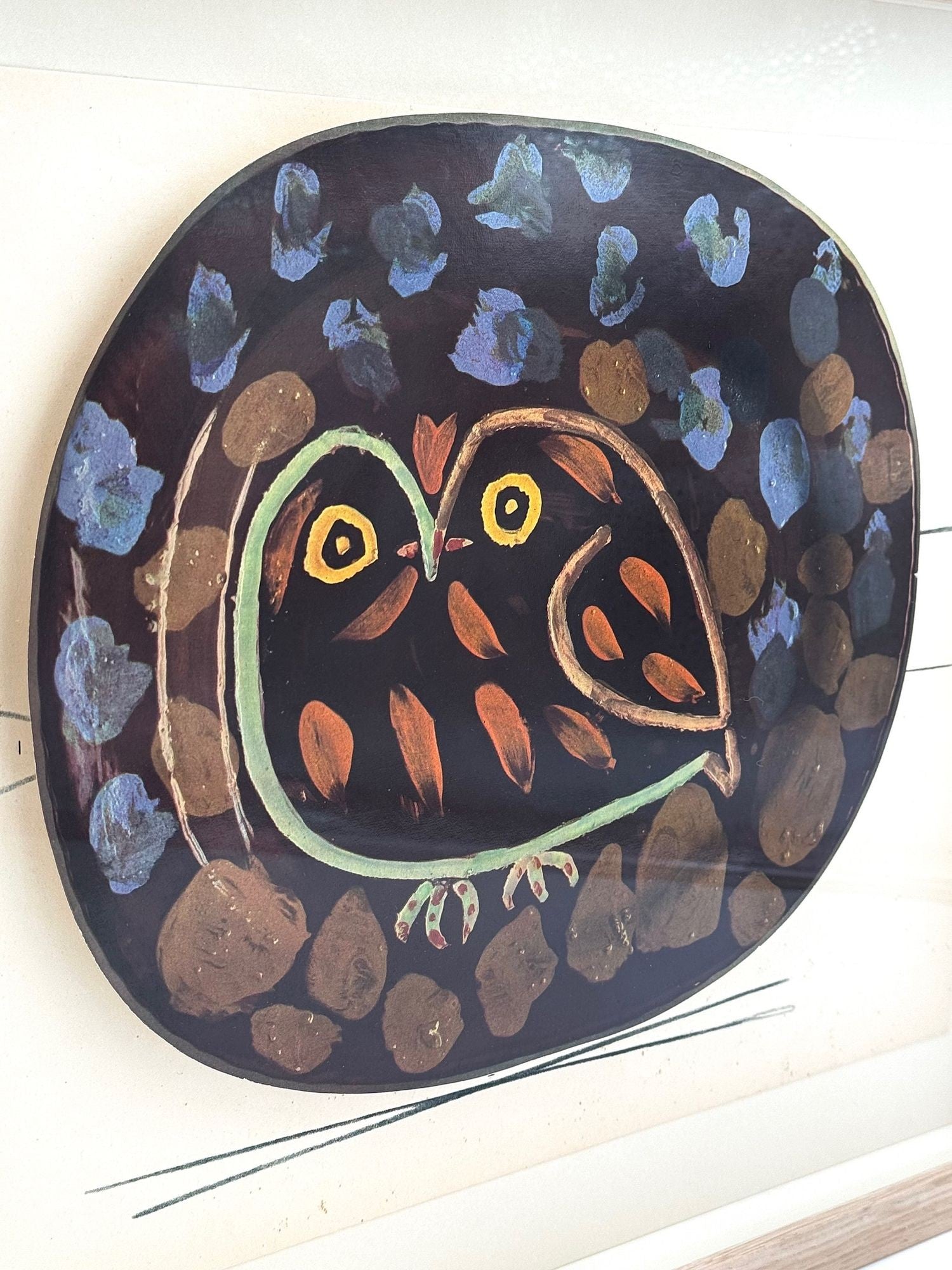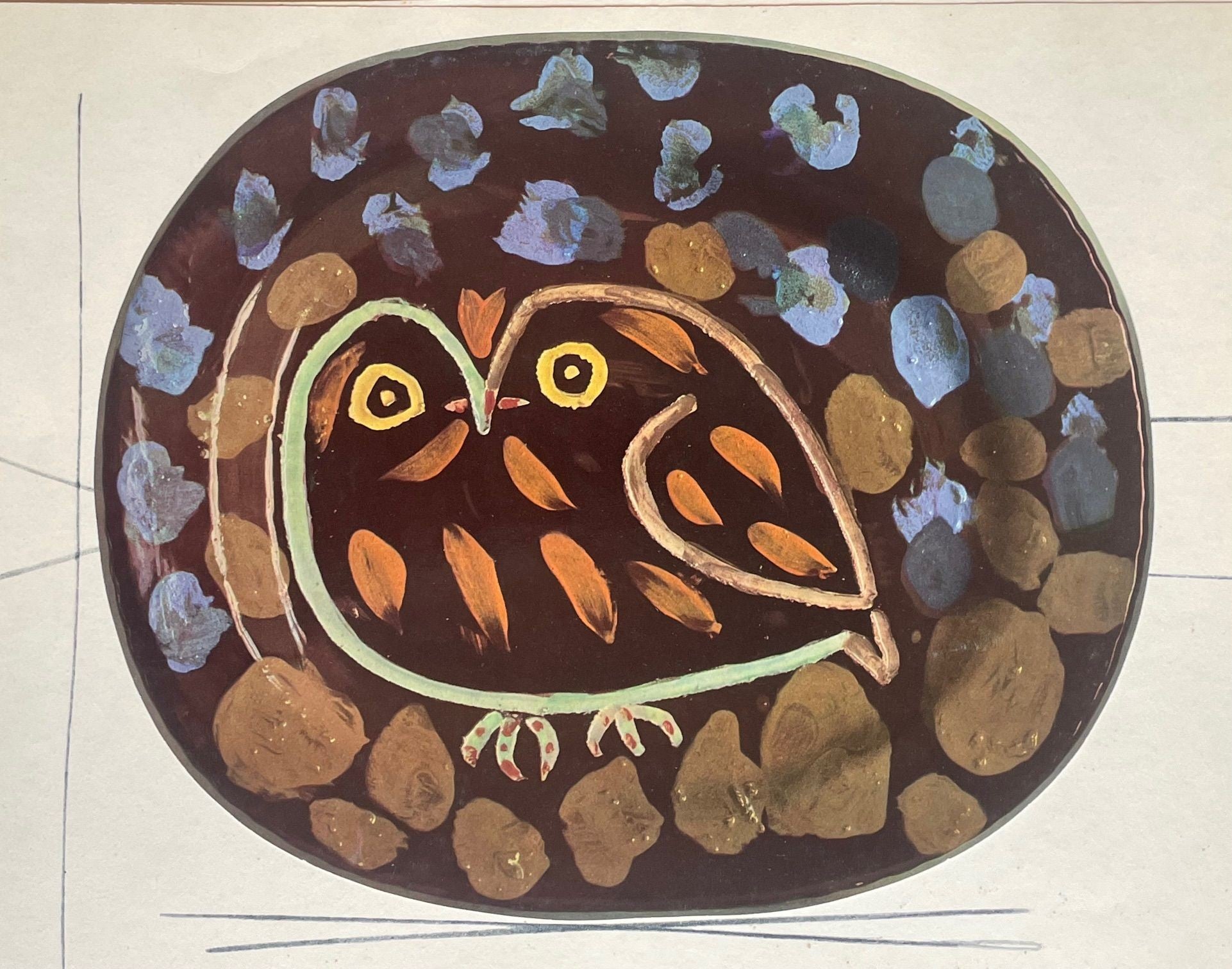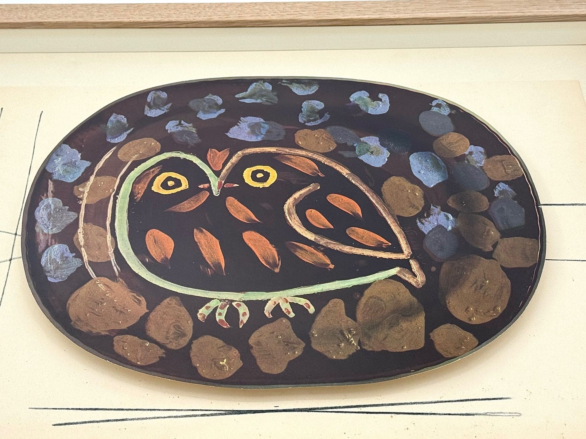 A framed lithographic plate from the 1948 Swedish, numbered limited edition portfolio of only 200 “Ceramiques de Picasso” by Albert Skira, framed, with the die-cut, gloss coloured lithograph of a ceramic plate with Picasso painting of an owl. The “plate” is float mounted in natural oak box frame and glazed with UV protective art glass.