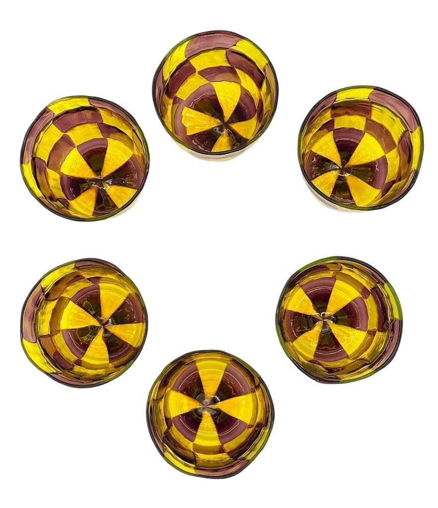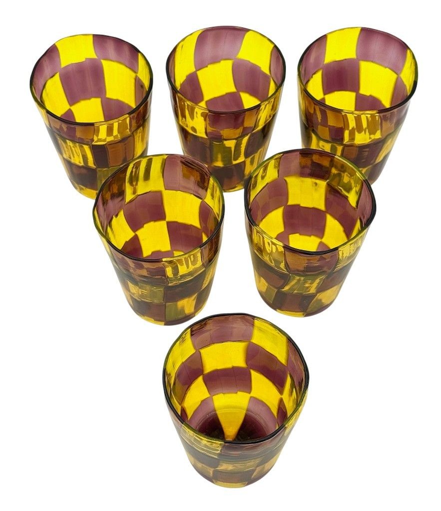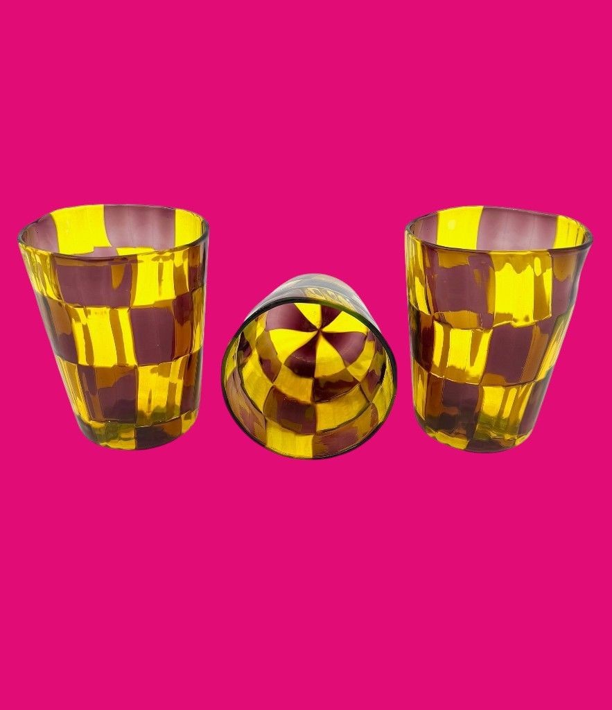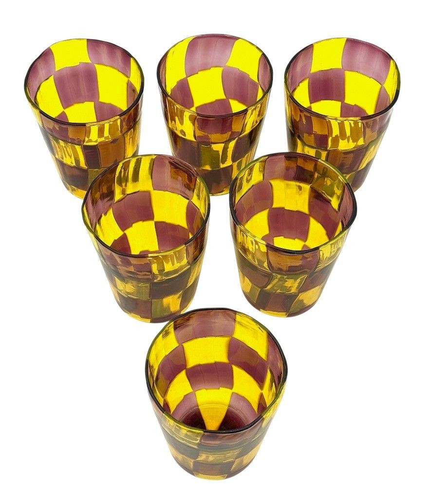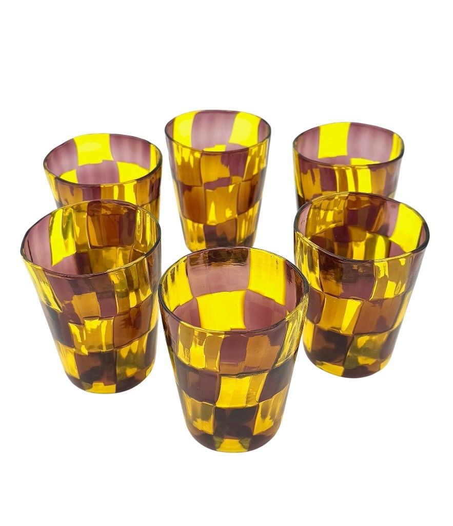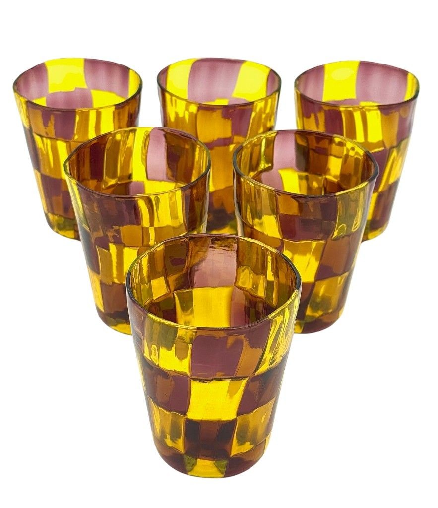 A set of six Italian handblown Murano glass tumblers with yellow and brown chequerboard pattern