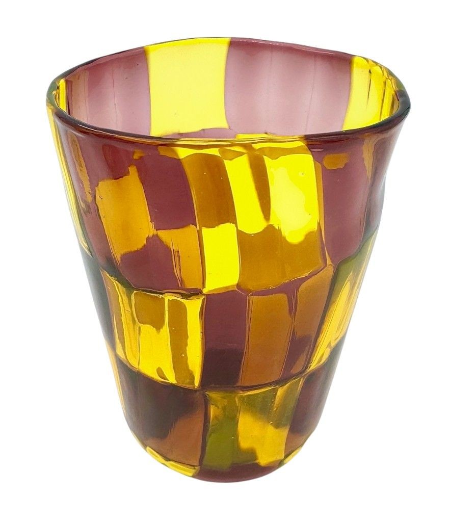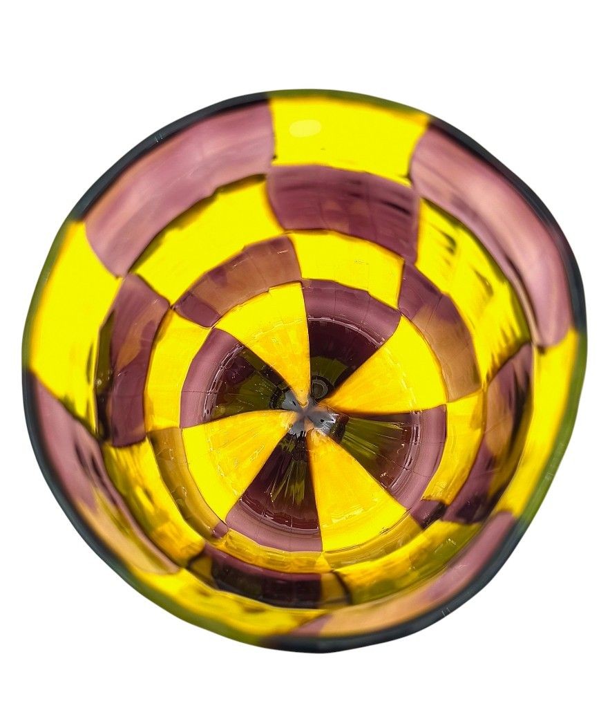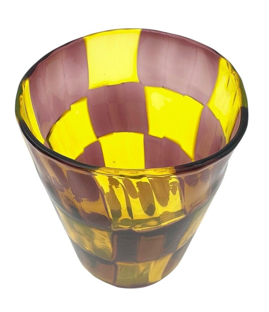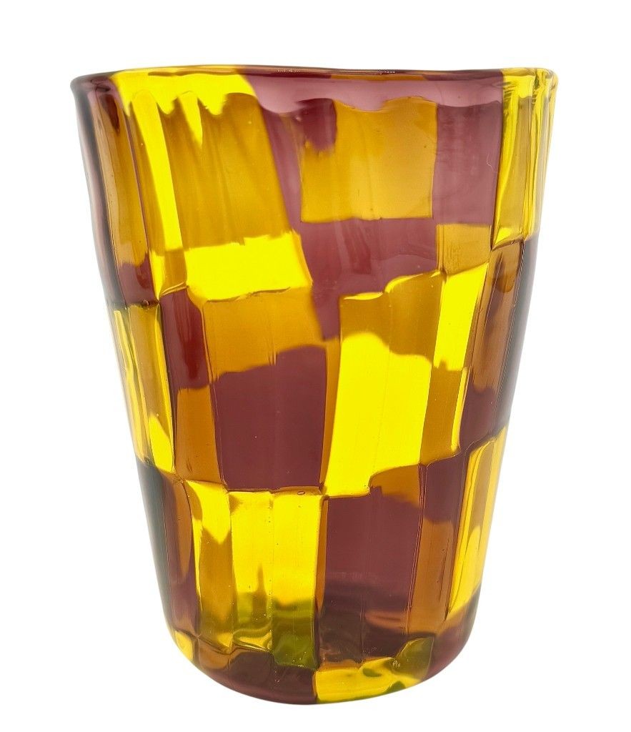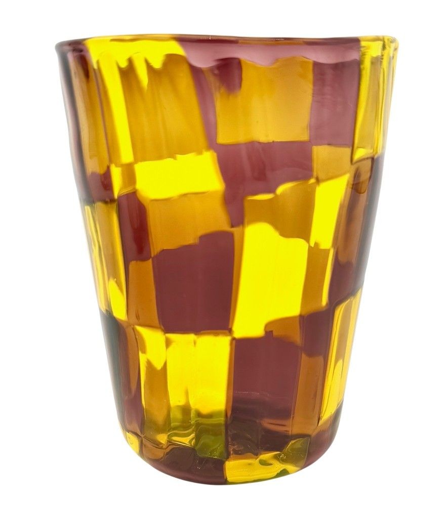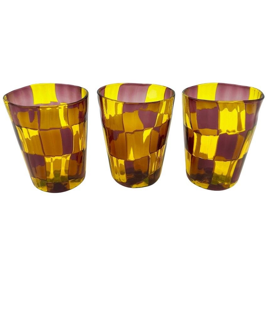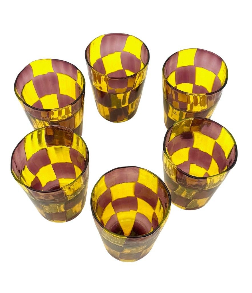 A set of six Italian handblown Murano glass tumblers with yellow and brown chequerboard pattern