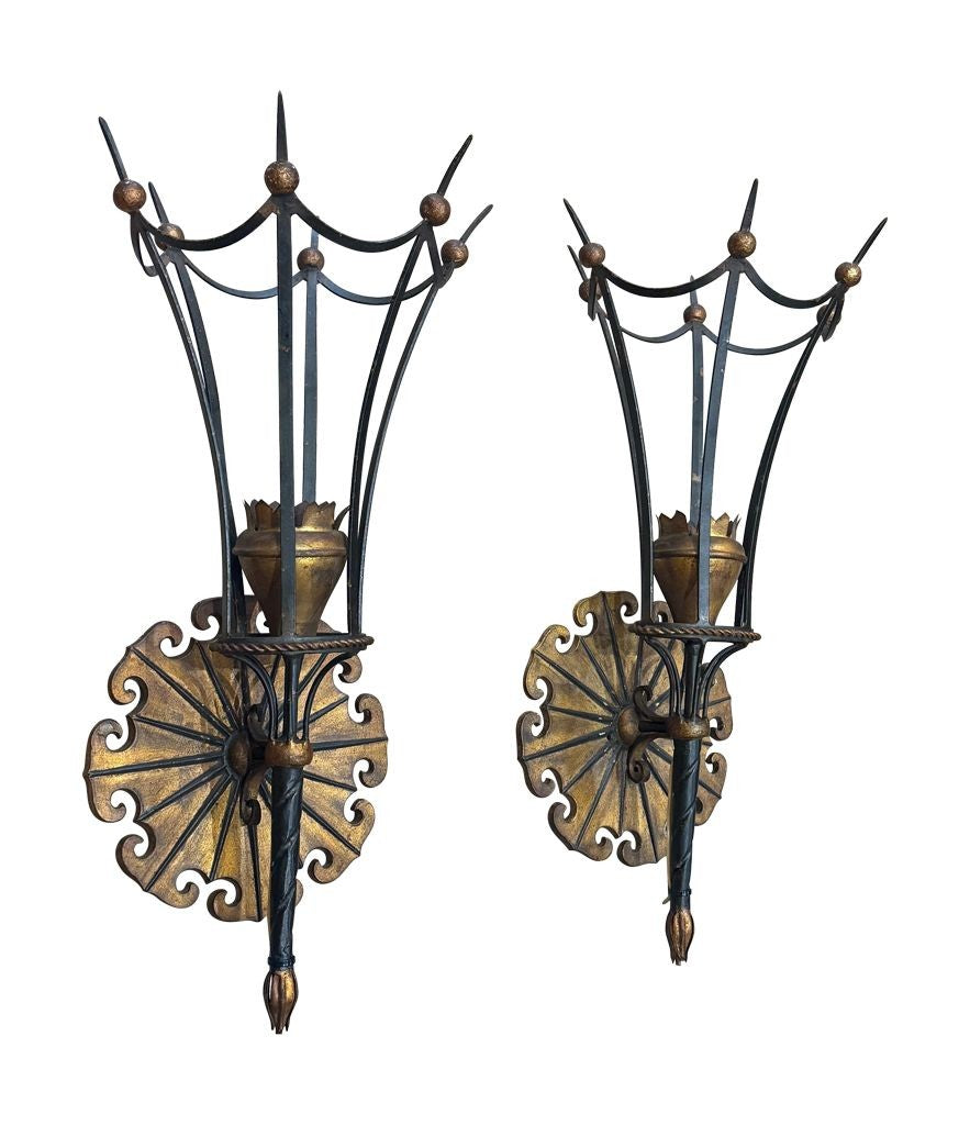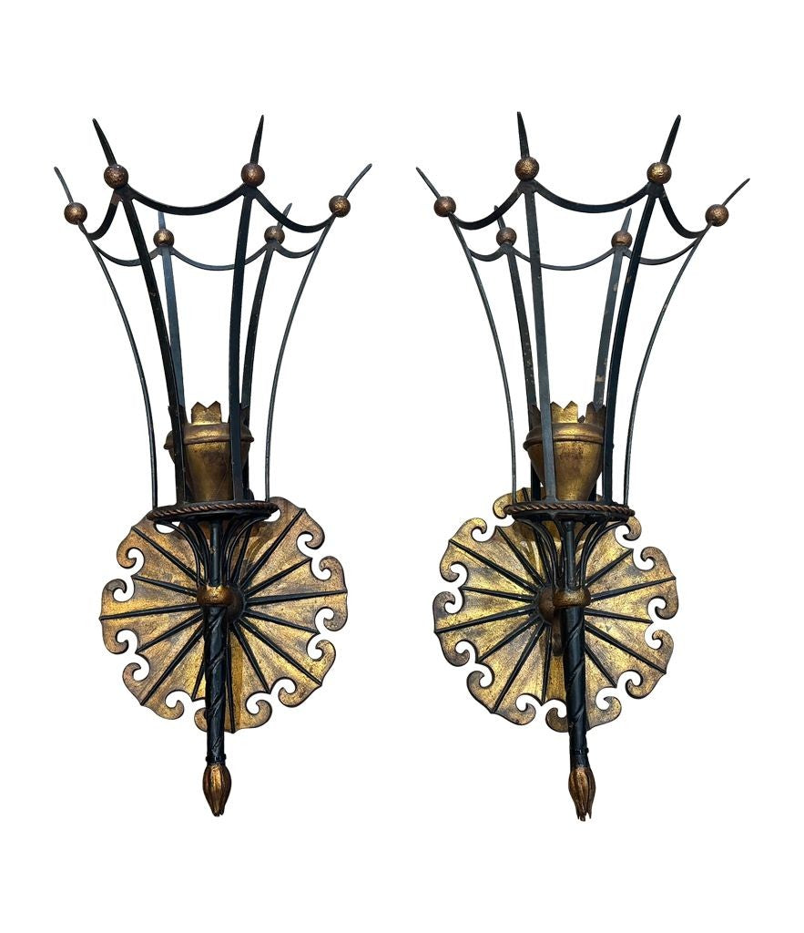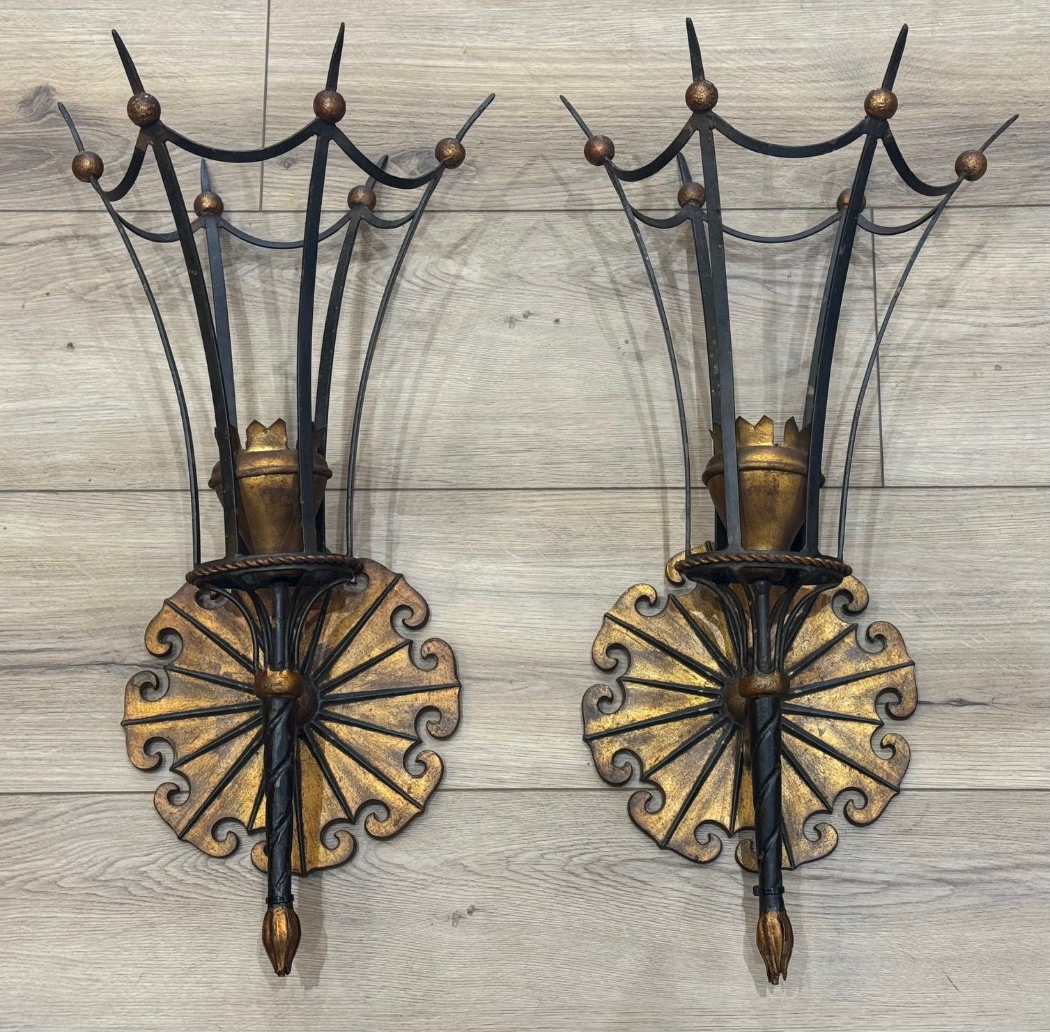A large pair of Italian 1940s torchiere gilt and black metal wall sconces