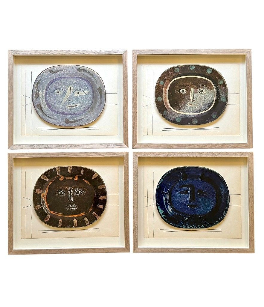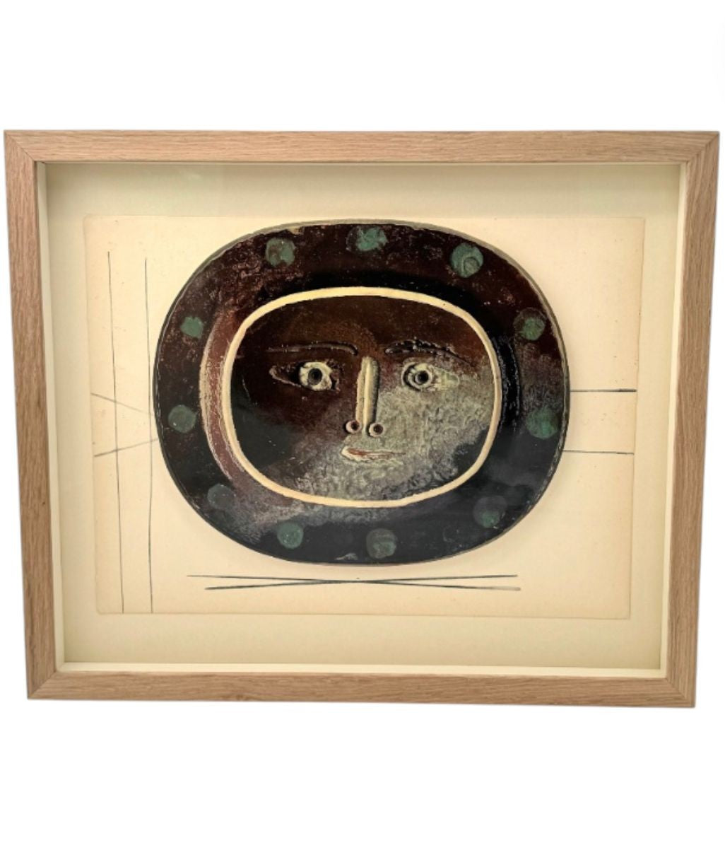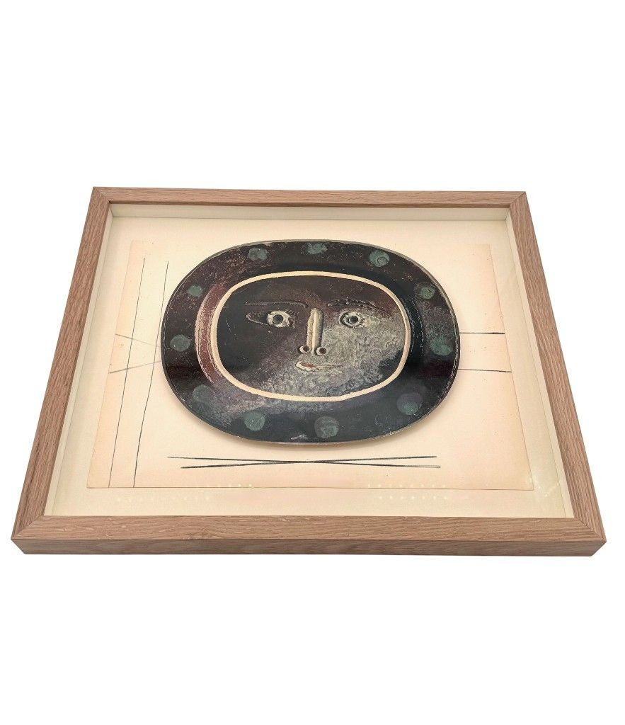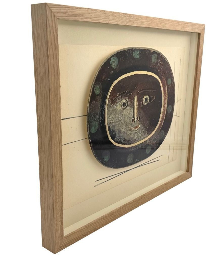 A framed lithographic plate from the 1948 Swedish, limited edition portfolio of only 200 “Ceramiques de Picasso” by Albert Skira, framed, with the die-cut, gloss coloured lithograph of a ceramic plate with a Picasso face. The “plate” is float mounted in natural oak box frame and glazed with UV protective art glass.