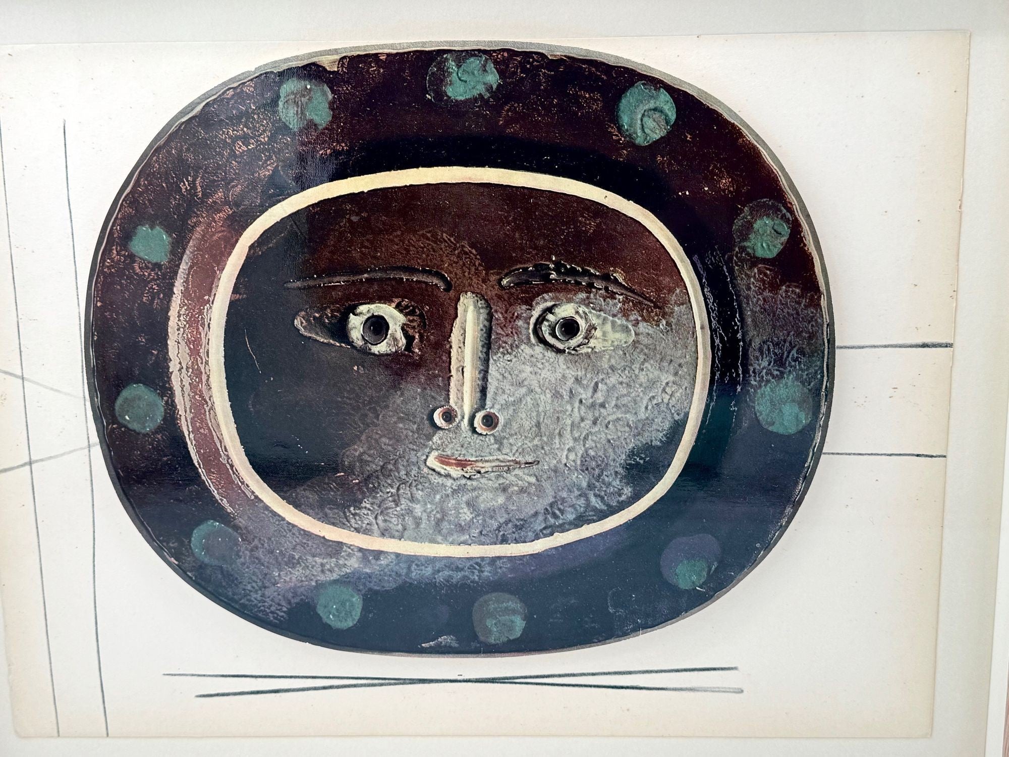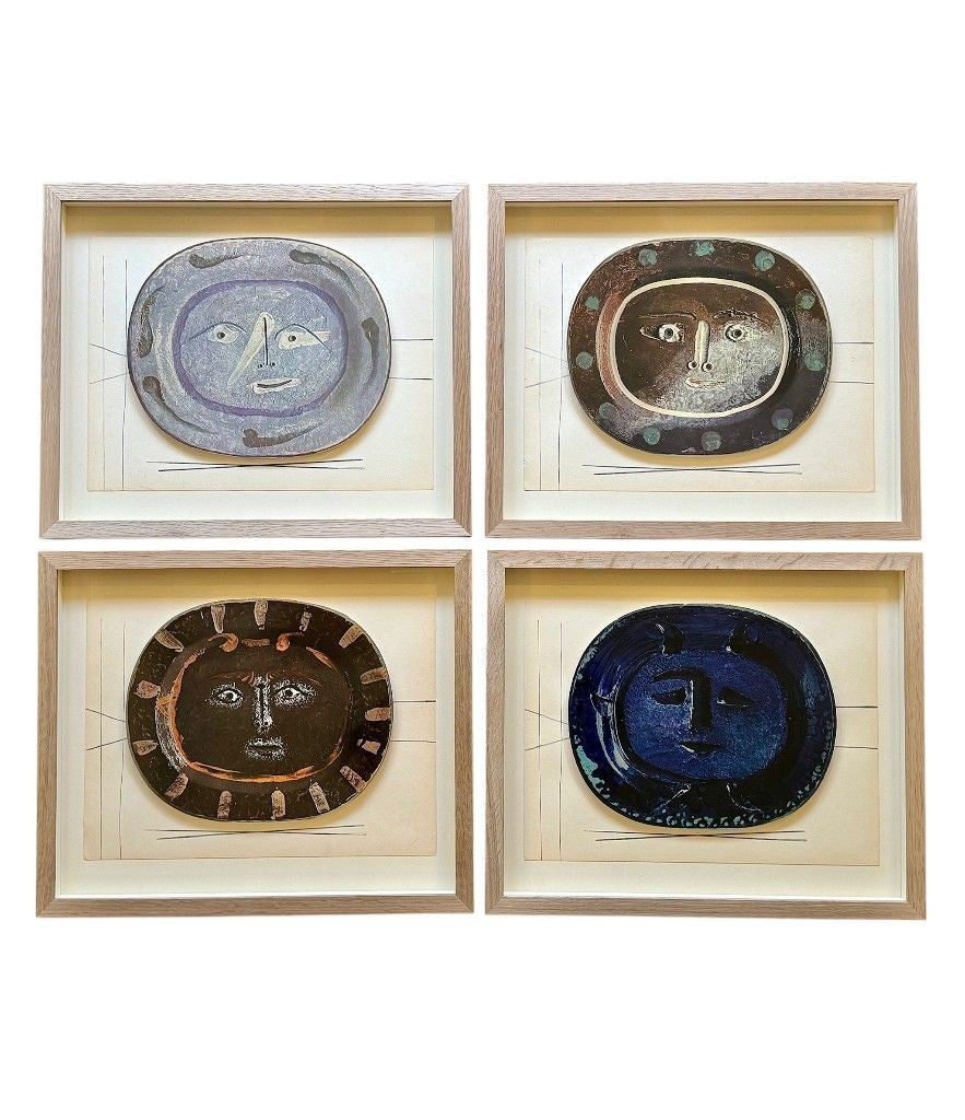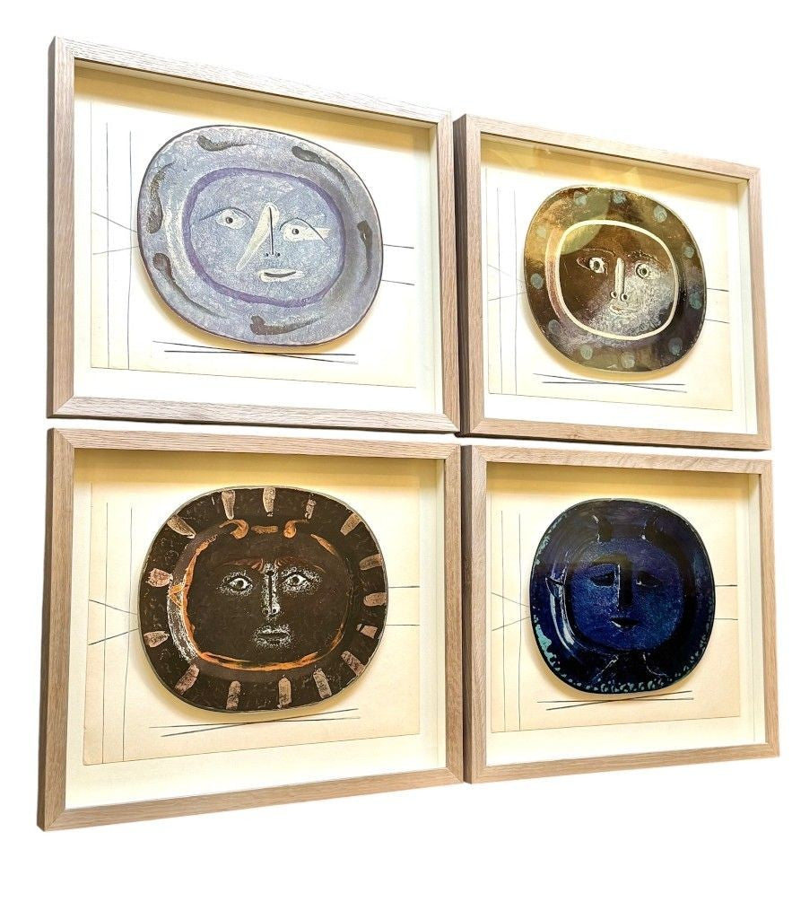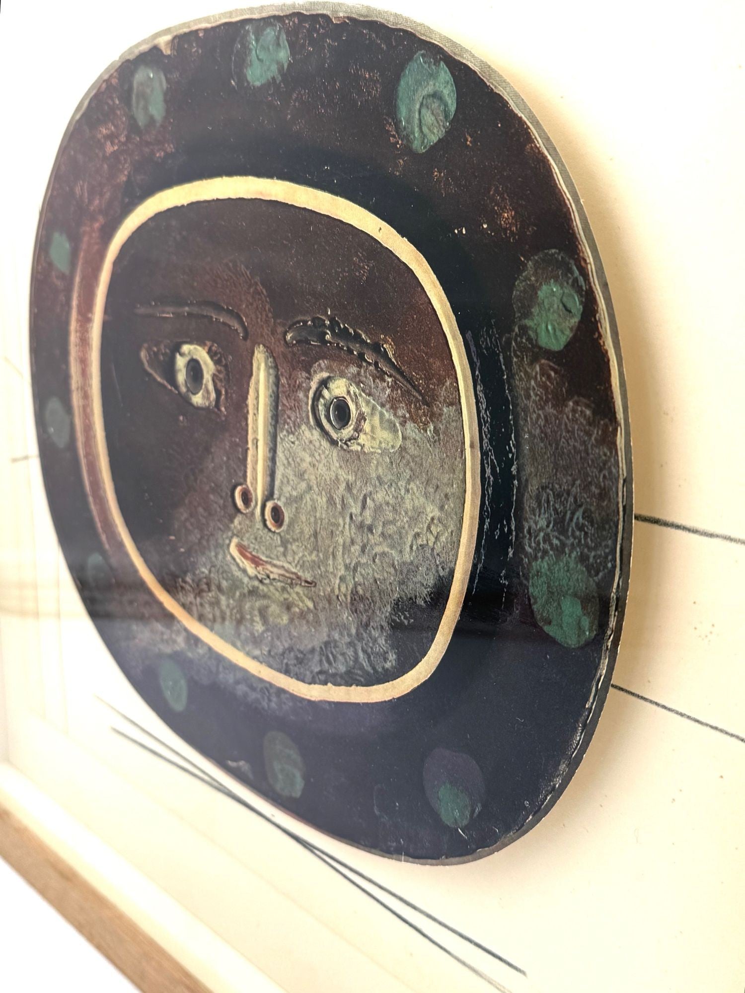 A framed lithographic plate from the 1948 Swedish, limited edition portfolio of only 200 “Ceramiques de Picasso” by Albert Skira, framed, with the die-cut, gloss coloured lithograph of a ceramic plate with a Picasso face. The “plate” is float mounted in natural oak box frame and glazed with UV protective art glass.