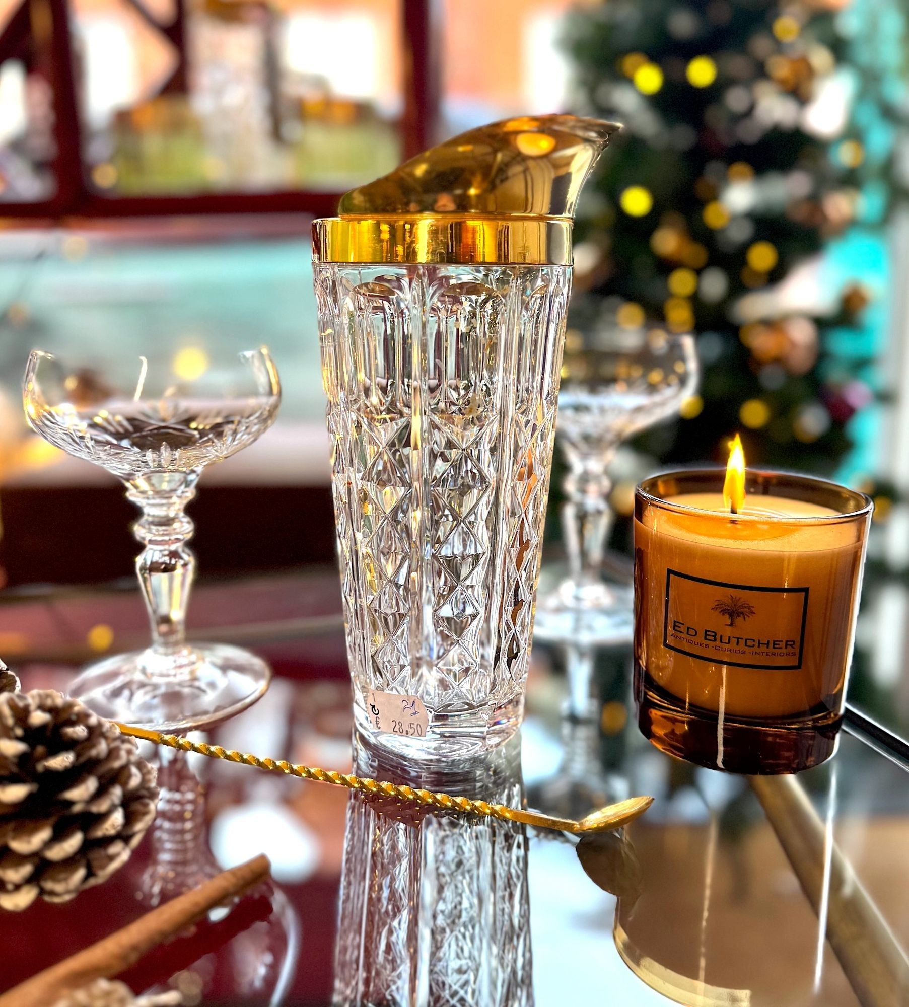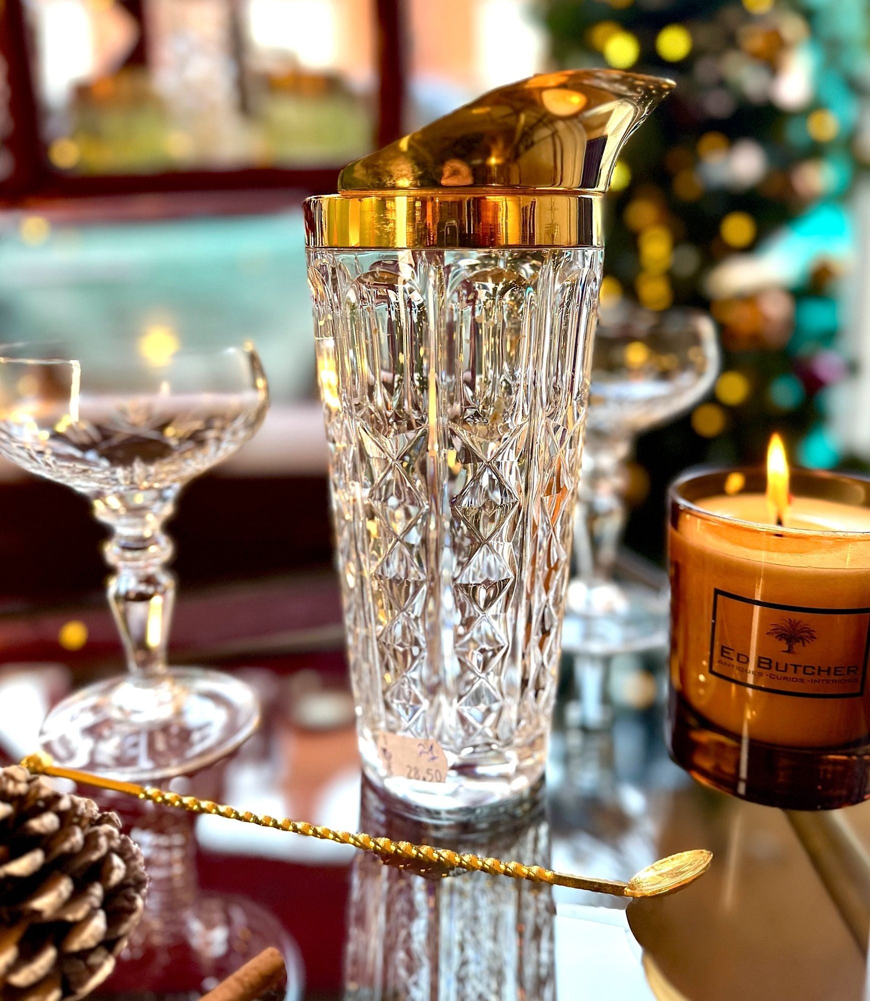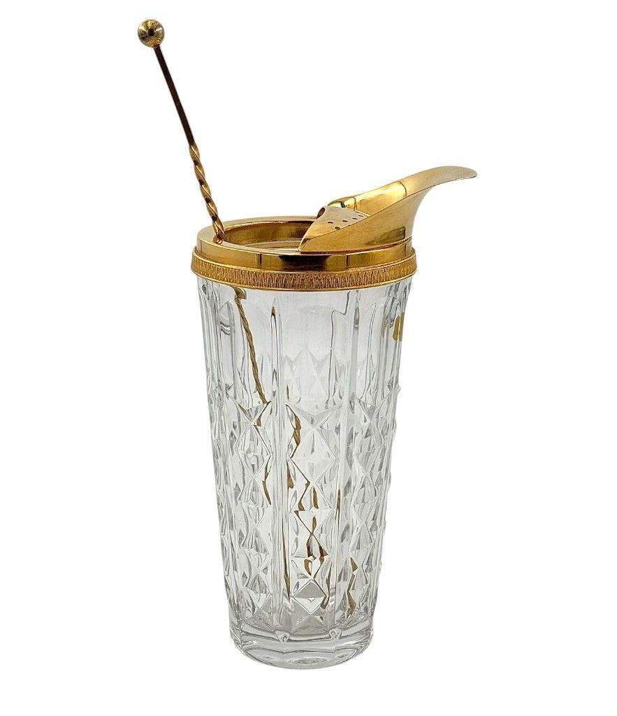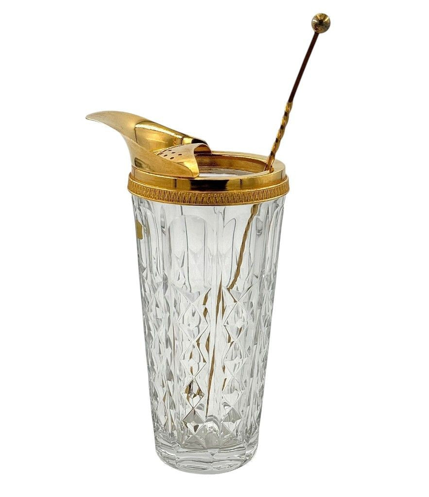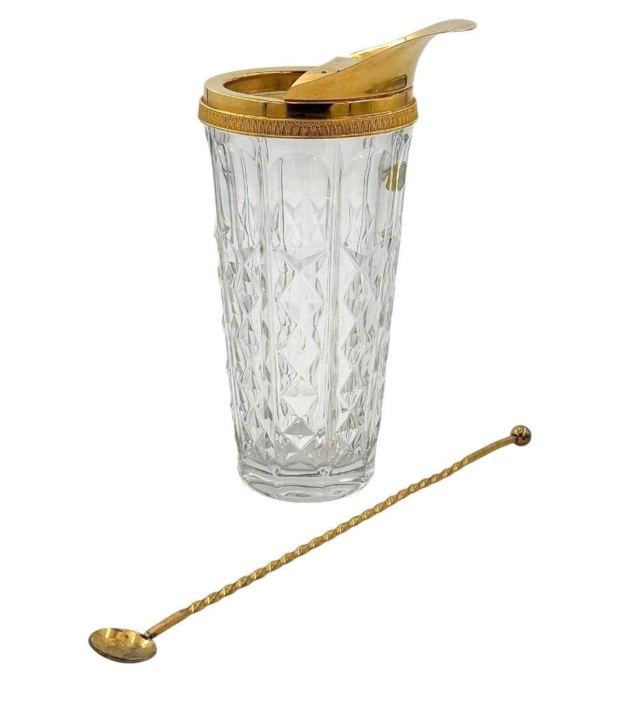 A 1950s Val Saint Lambert crystal and gold plated cocktail jug with gilt metal muddling spoon. Still with original Val St Lambert label on the front
