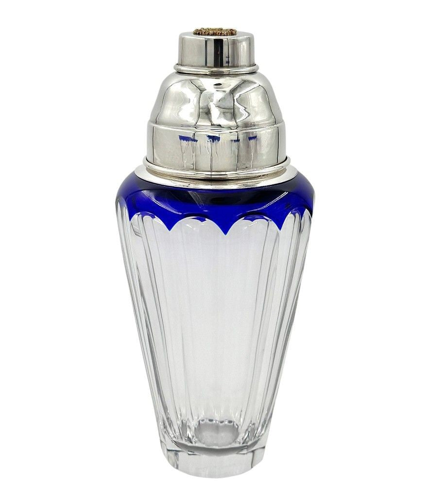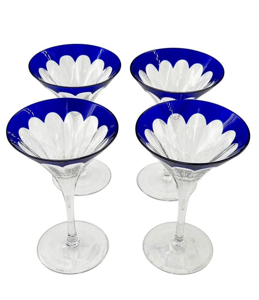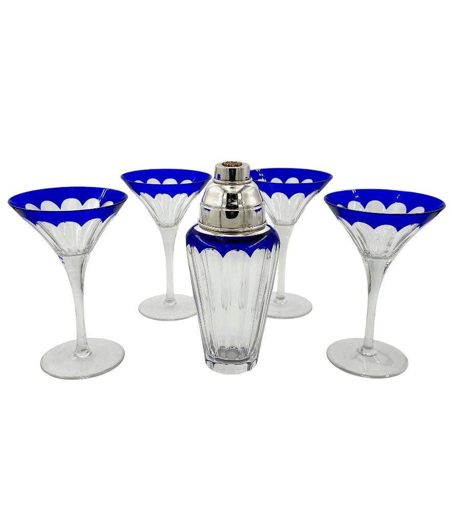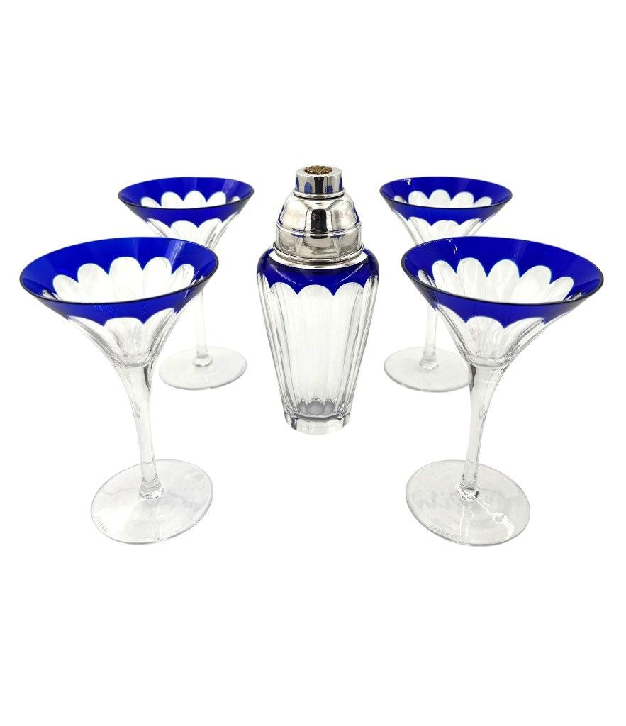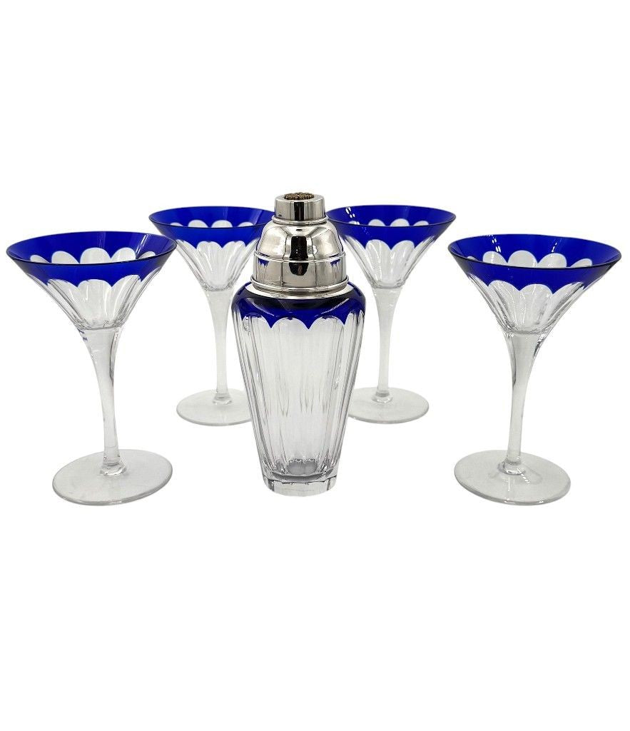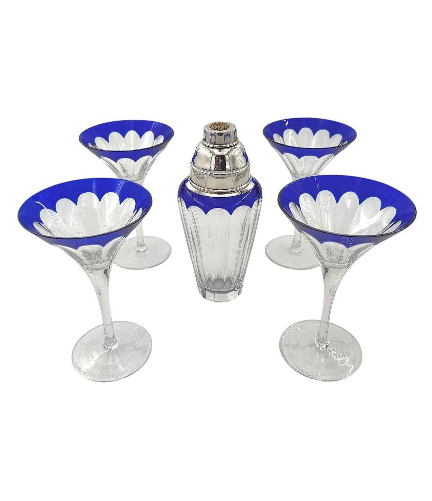 A Faberge crystal "Grand Duke" cocktail set with a blue cut crystal and silver plated cocktail shaker, embossed with brass Faberge crest in relief in wonderful deep blue cut crystal, with four cut blue crystal glasses. All etched "Faberge" on the base