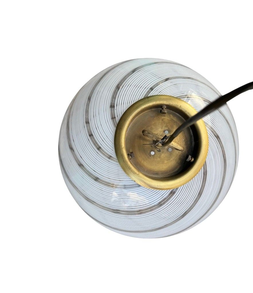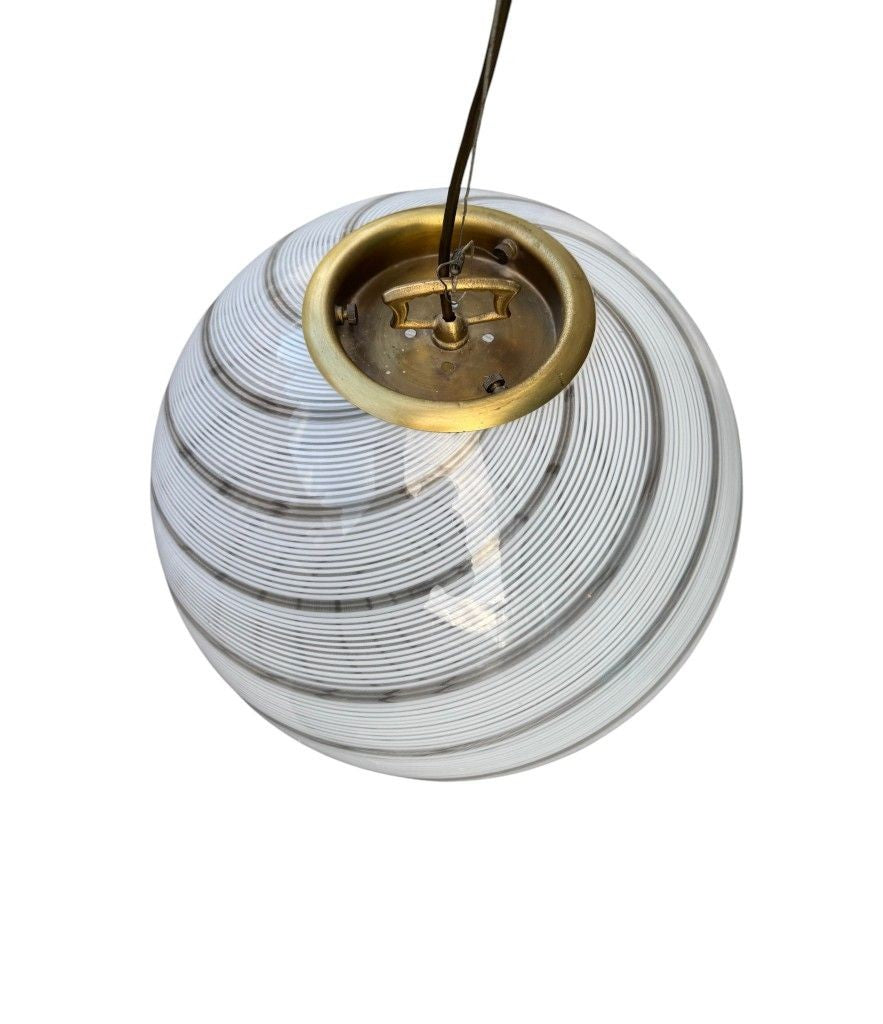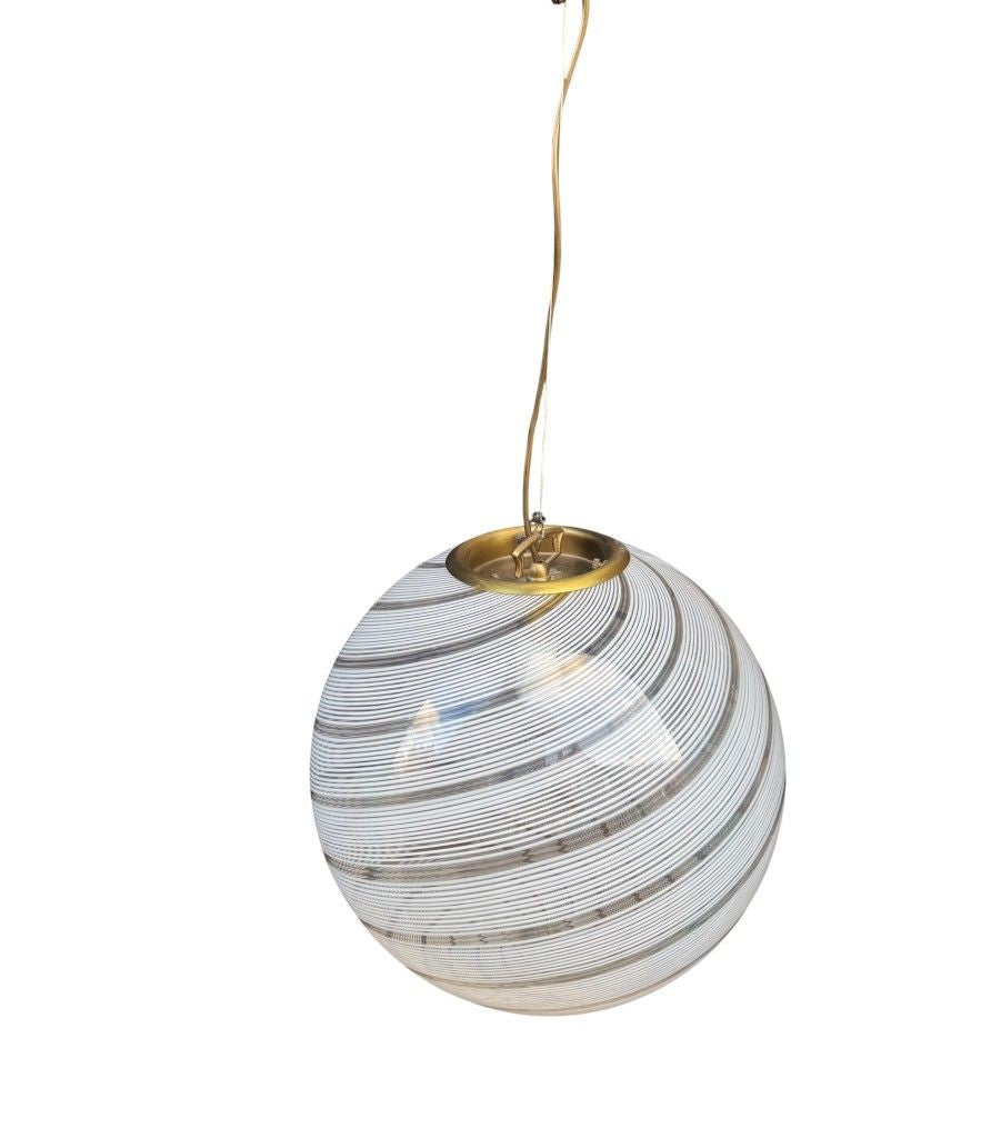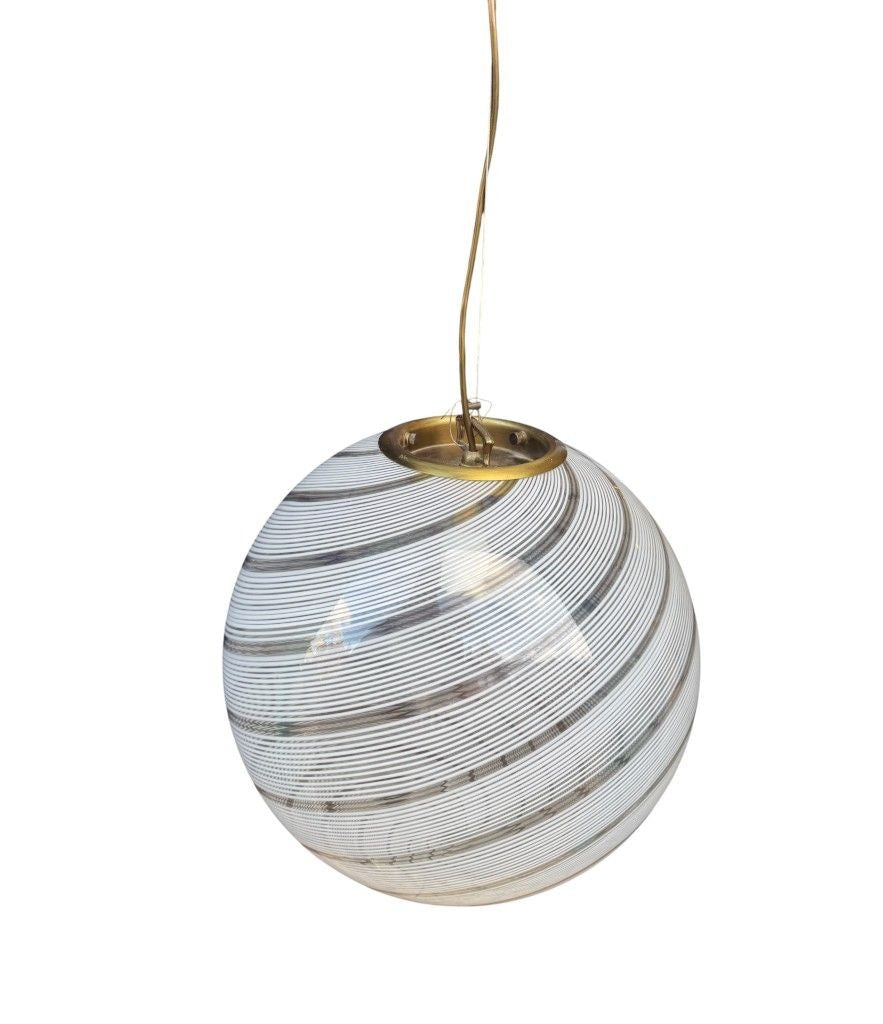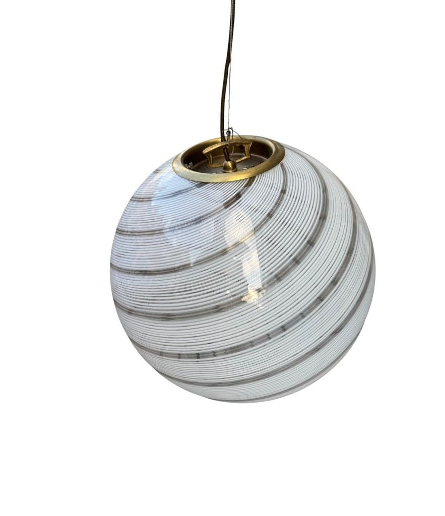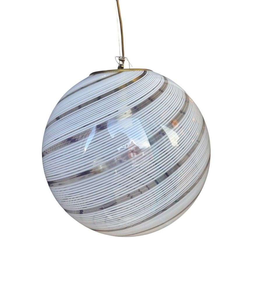 A large 1960s Venini Murano glass ball “Tessuto” swirl pendant light white swirling line design