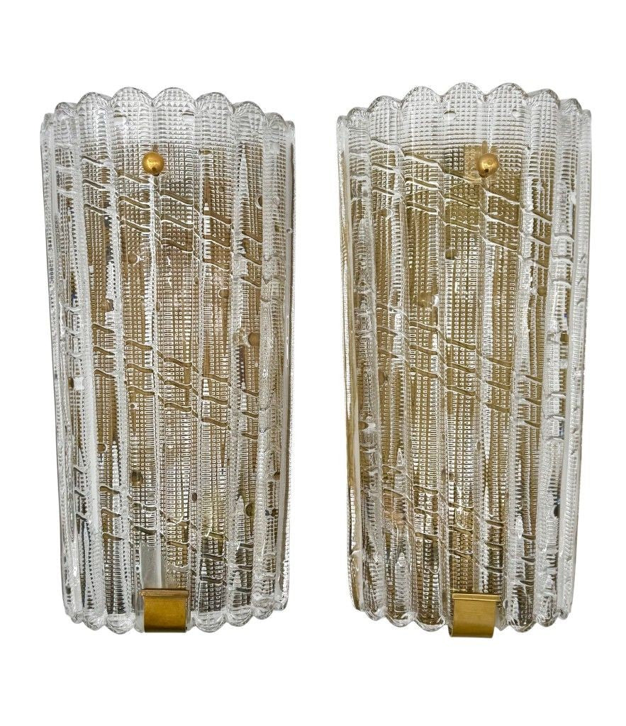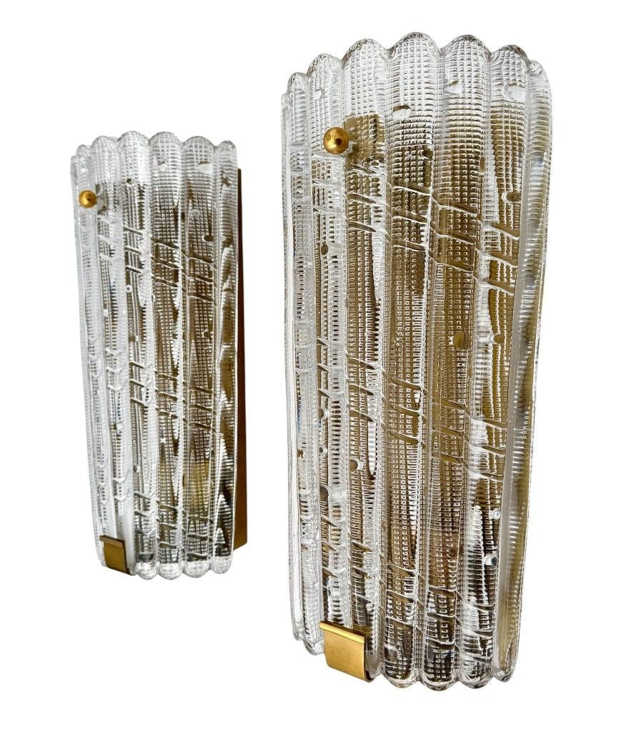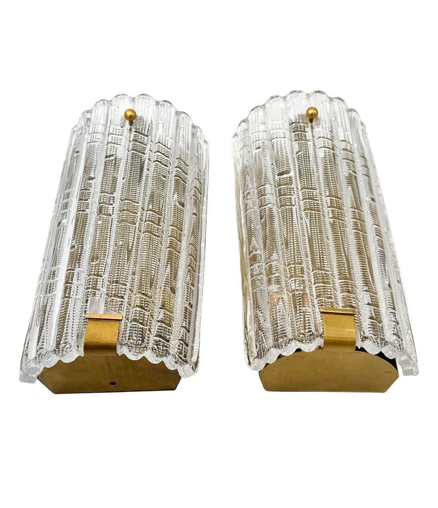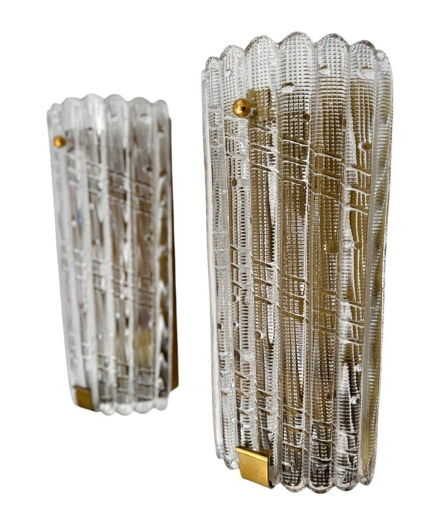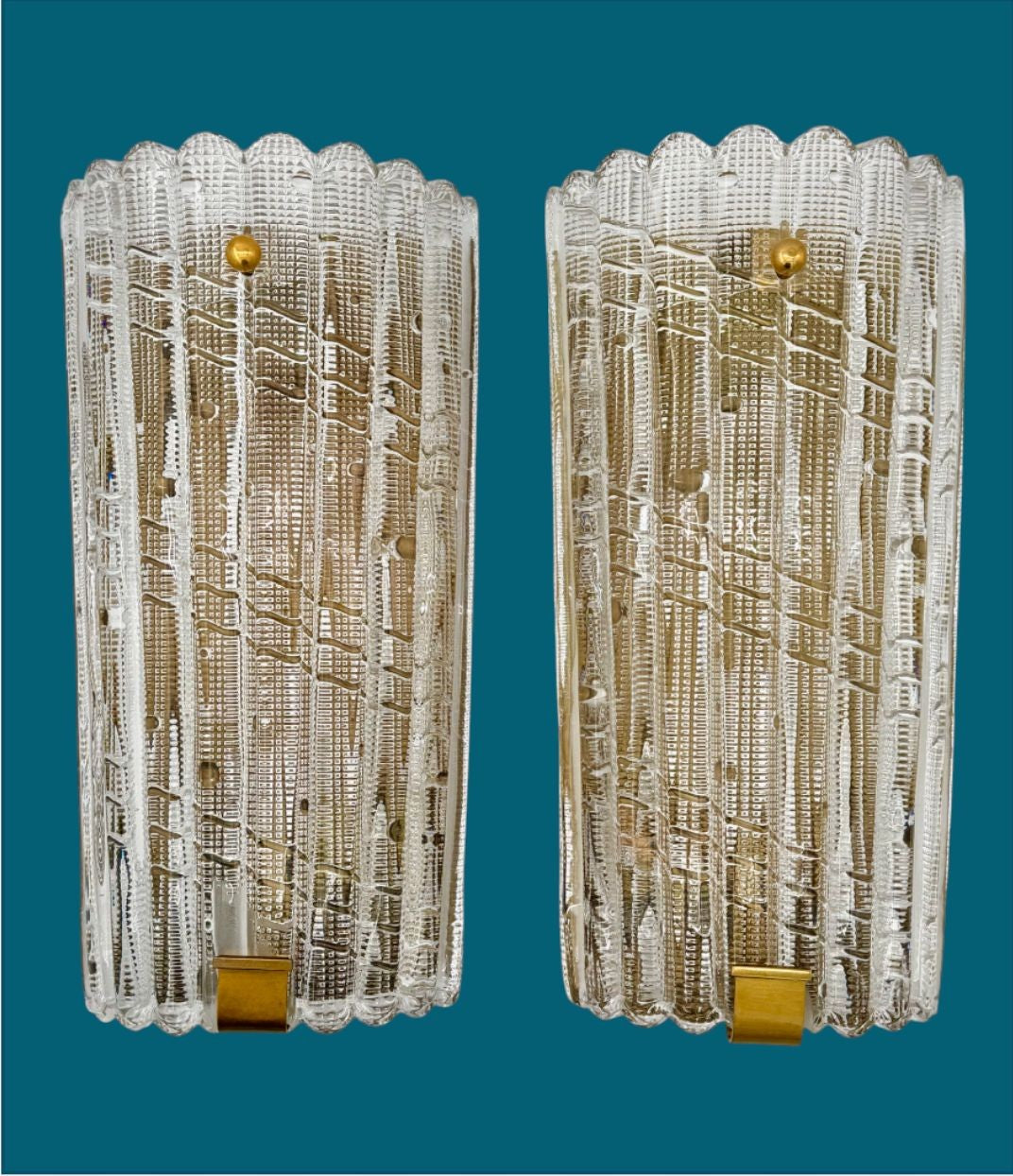 A large pair of Swedish 1960s Orrefors glass and brass wall sconces by Carl Fagerlund