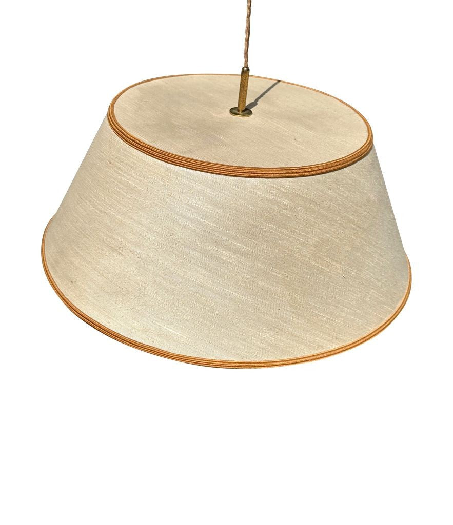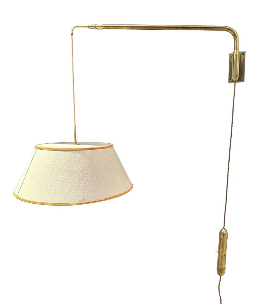 A 1950s Italian telescopic solid brass wall light attributed to Stilnovo, with solid brass lozenge shaped counter weight / switch and solid brass wall bracket. With orignal fabric shade, we can supply new bespoke linen shades if required, please enquire for price. A very fine quality constructed and designed light, in good orignal condition, rewired with antique cord flex and PAT tested.