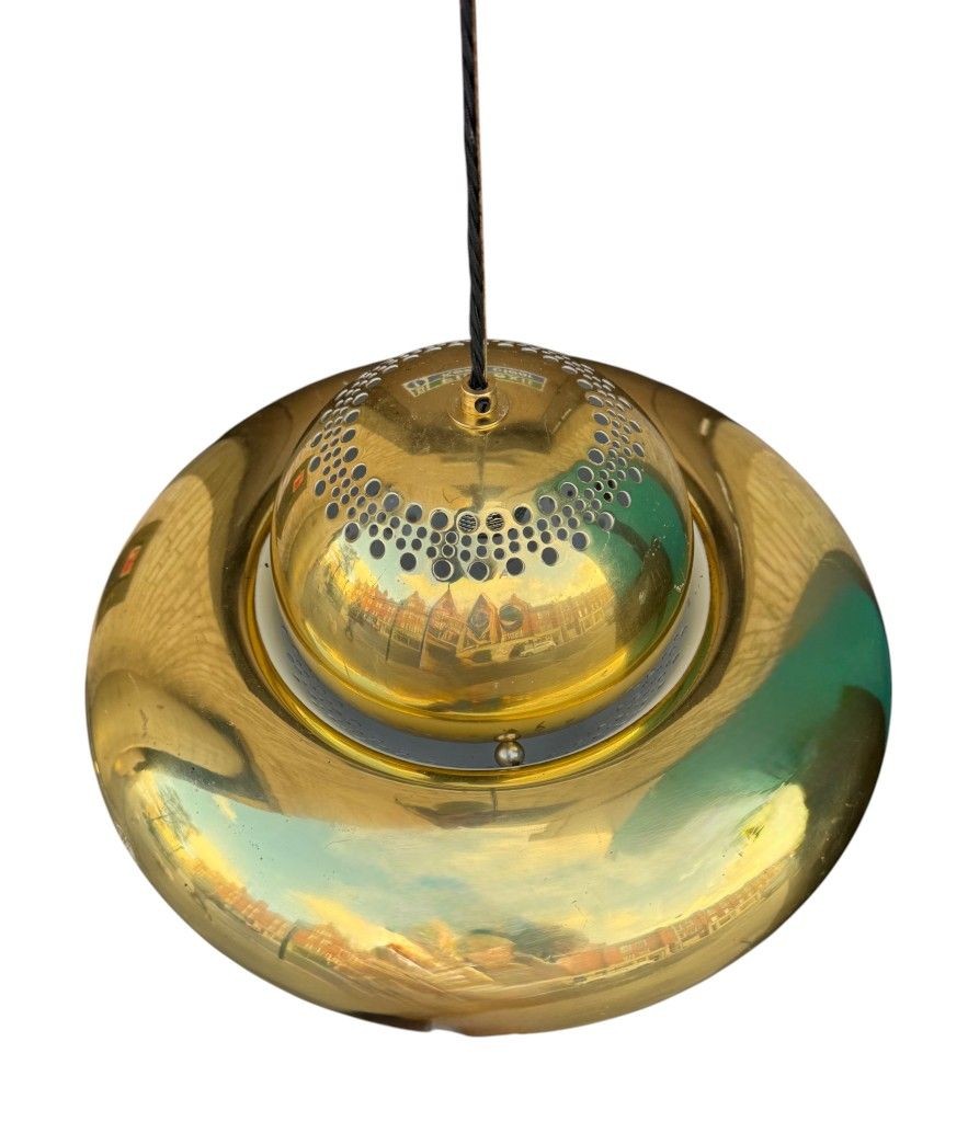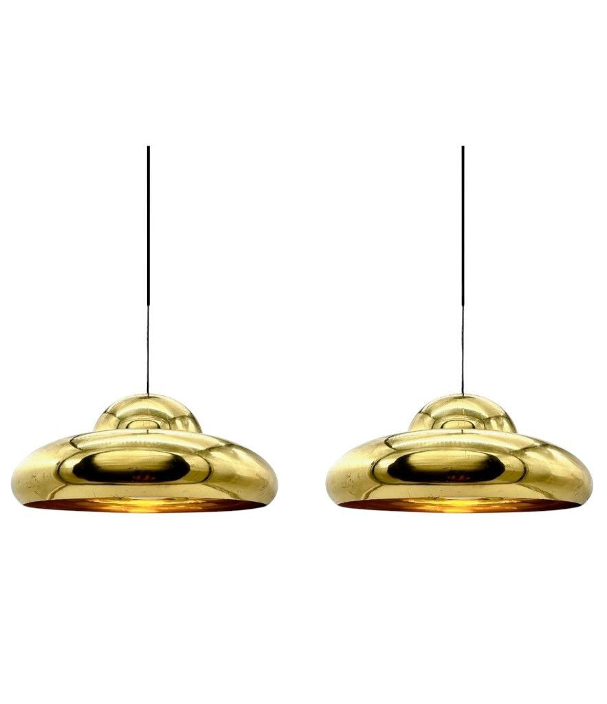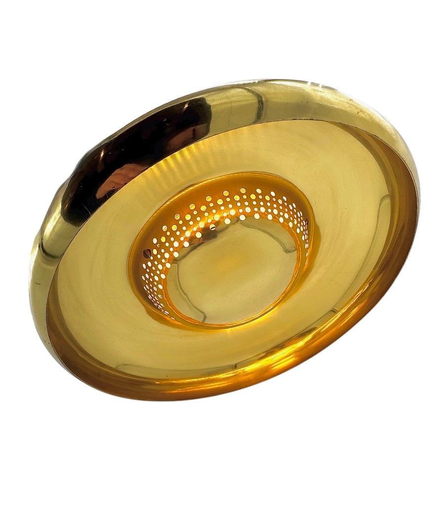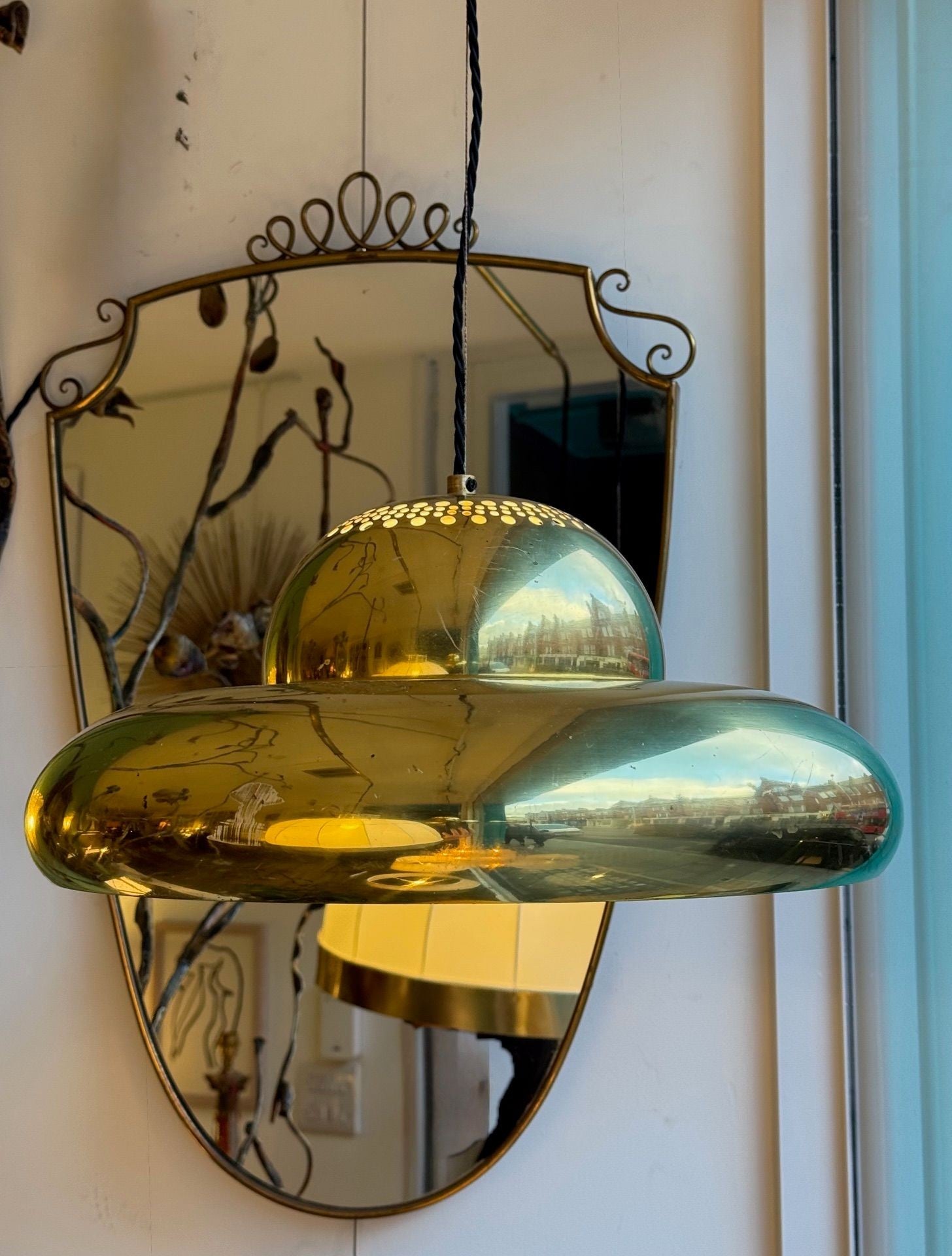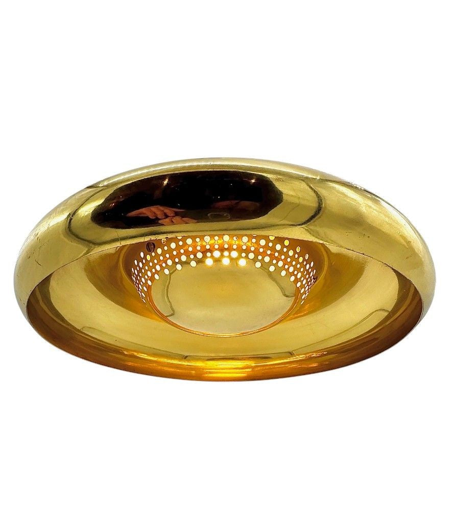 A pair of 1960s "Fior di Loto" brass ceiling lights by Afra and Tobia Scarpa. Designed in 1962 and produced by Italian lighting company Flos, The polished brass space age shaped light has a central bulb, with perforation in the base and around the top that reflects the inside of the curved shade. Re wired with black cord flex and PAT tested, both with orignal white acrylic ceiling rose stamped "Flos Art 31, Design Registered Made in Italy" The length of the hanging flex can be altered to suit,