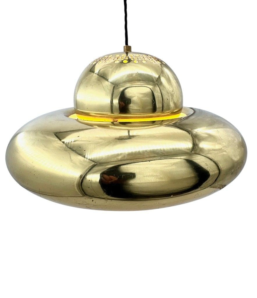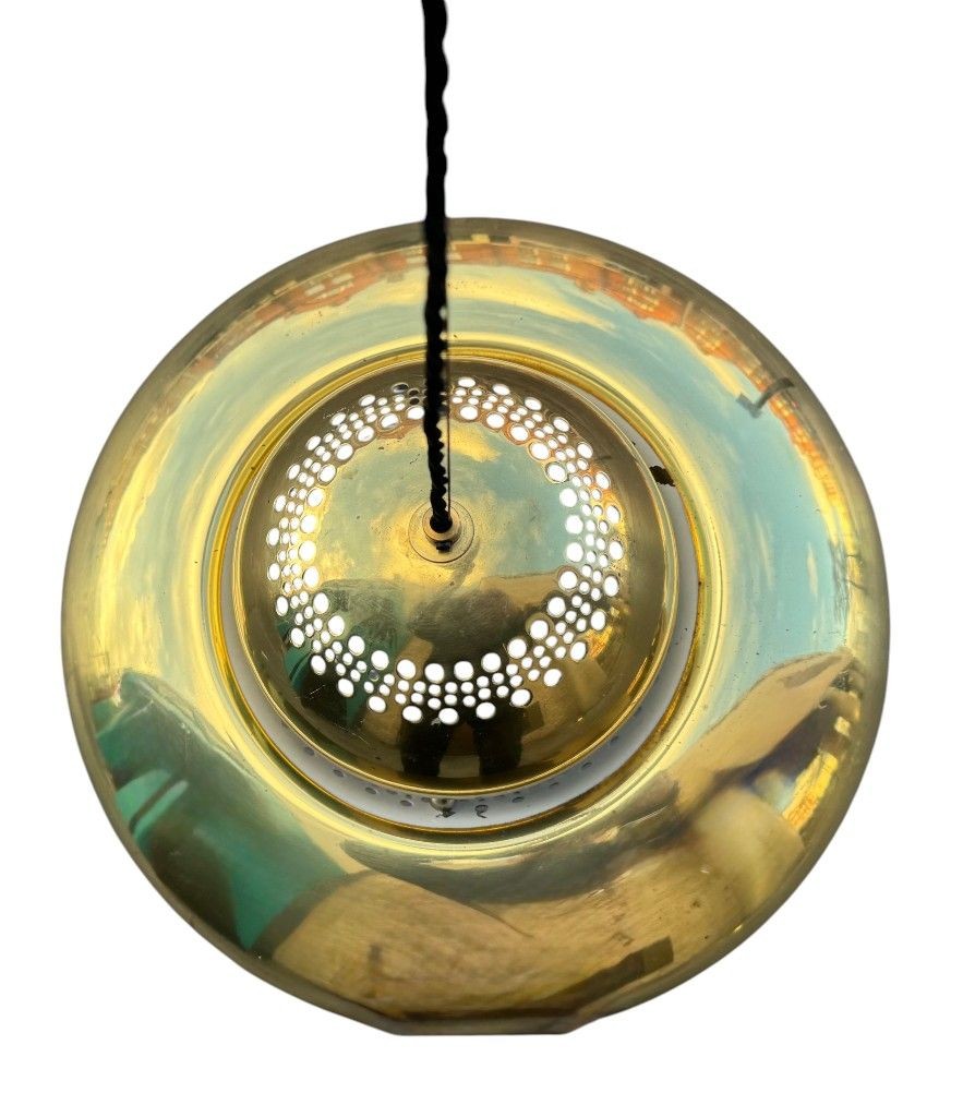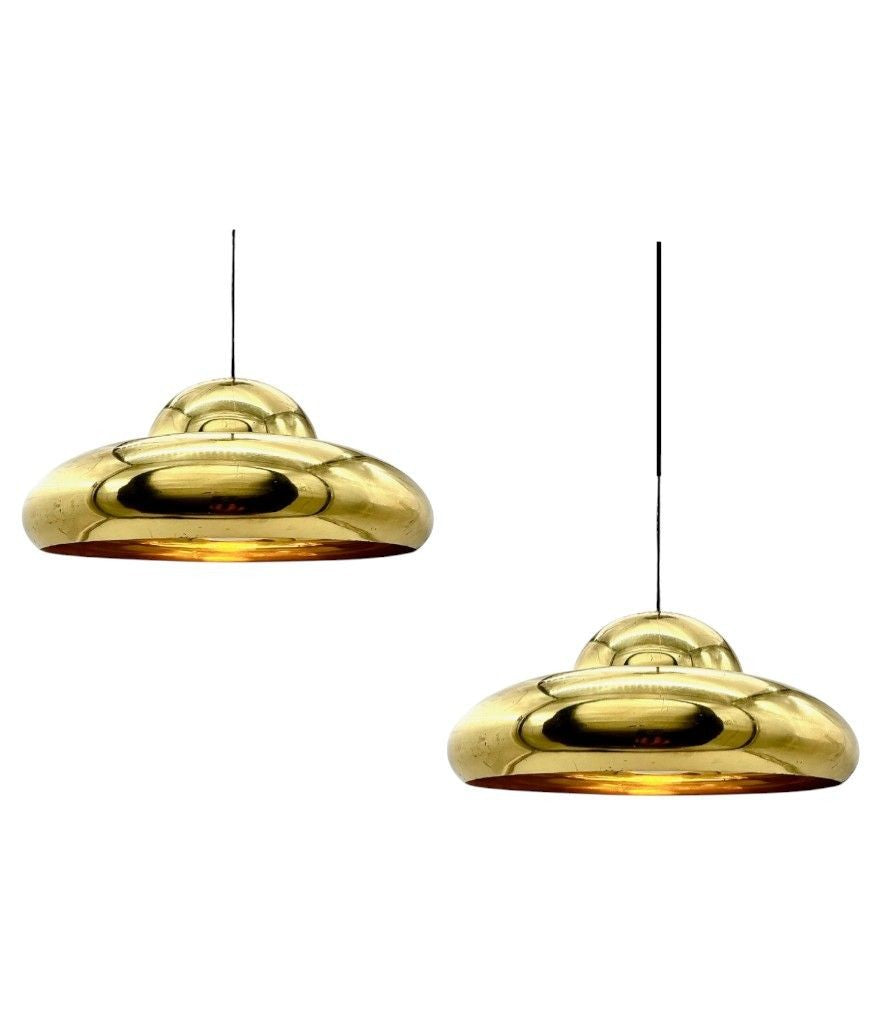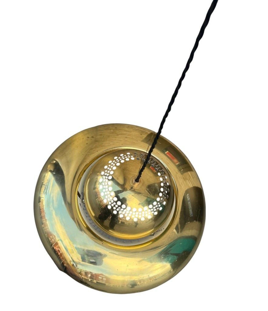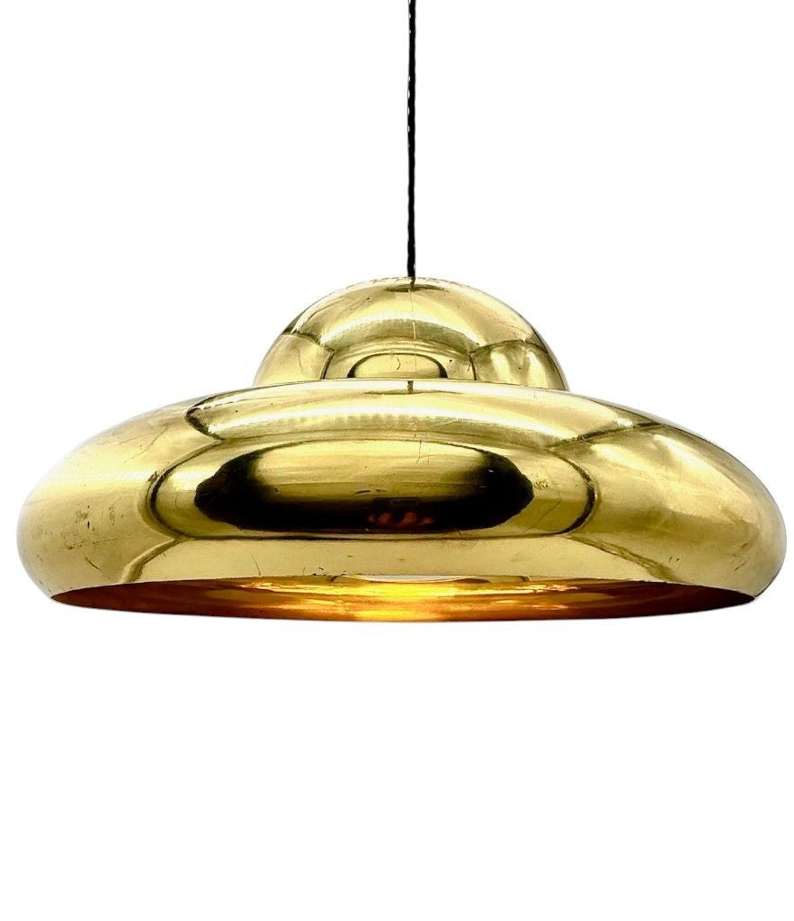 A pair of 1960s "Fior di Loto" brass ceiling lights by Afra and Tobia Scarpa. Designed in 1962 and produced by Italian lighting company Flos, The polished brass space age shaped light has a central bulb, with perforation in the base and around the top that reflects the inside of the curved shade. Re wired with black cord flex and PAT tested, both with orignal white acrylic ceiling rose stamped "Flos Art 31, Design Registered Made in Italy" The length of the hanging flex can be altered to suit,