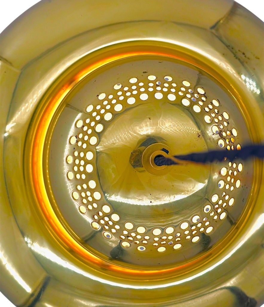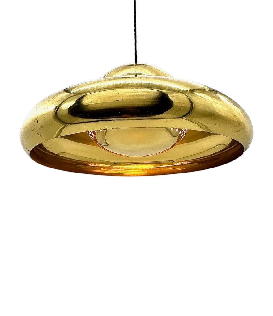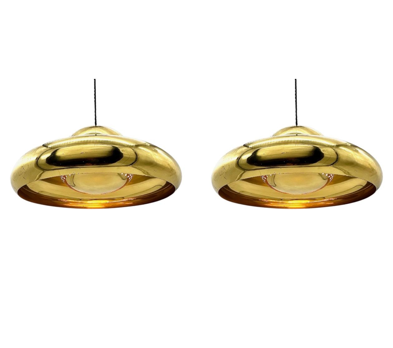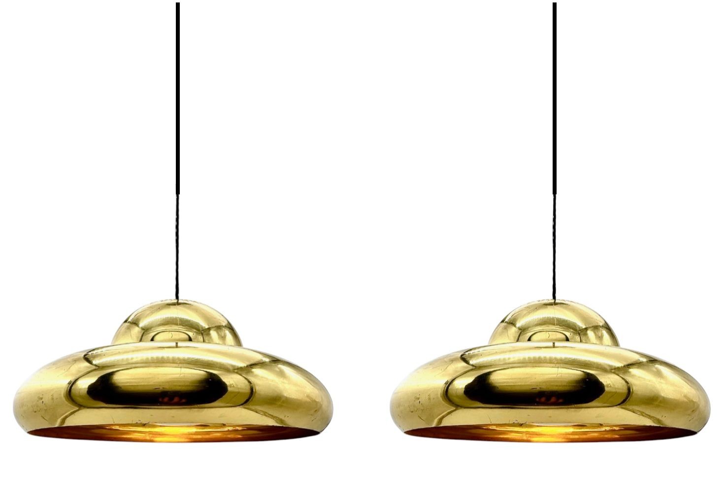 A pair of 1960s "Fior di Loto" brass ceiling lights by Afra and Tobia Scarpa. Designed in 1962 and produced by Italian lighting company Flos, The polished brass space age shaped light has a central bulb, with perforation in the base and around the top that reflects the inside of the curved shade. Re wired with black cord flex and PAT tested, both with orignal white acrylic ceiling rose stamped "Flos Art 31, Design Registered Made in Italy" The length of the hanging flex can be altered to suit,