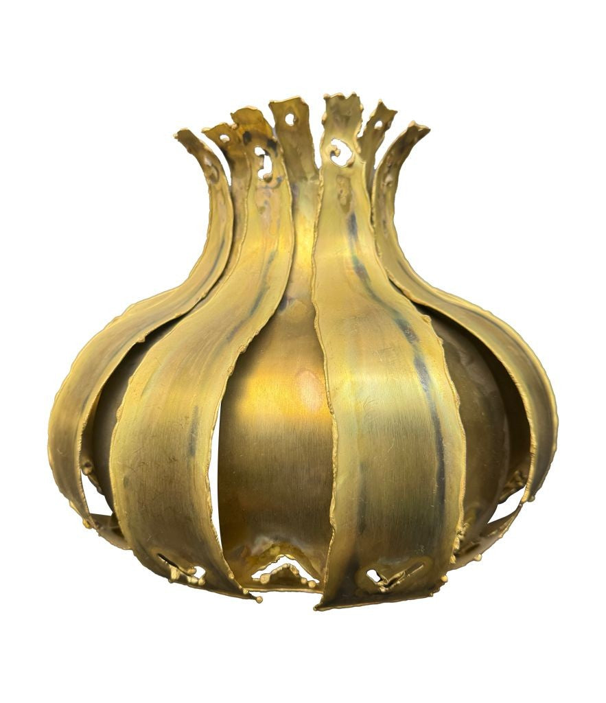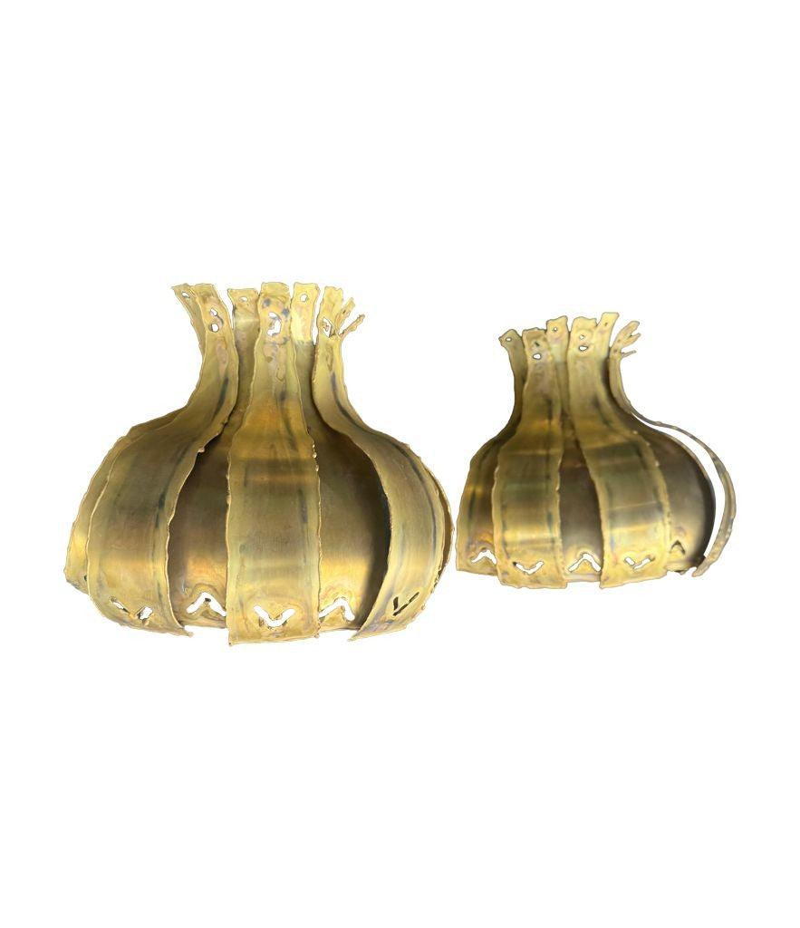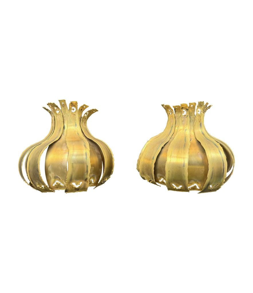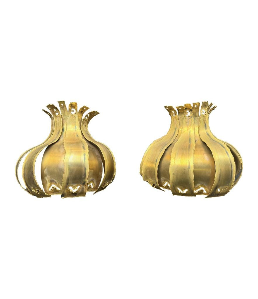 A pair of 1960s Holm Sorensen torch cut brass artichoke shaped wall sconces, with white enamel back plates and re-wired with new brass fittings.