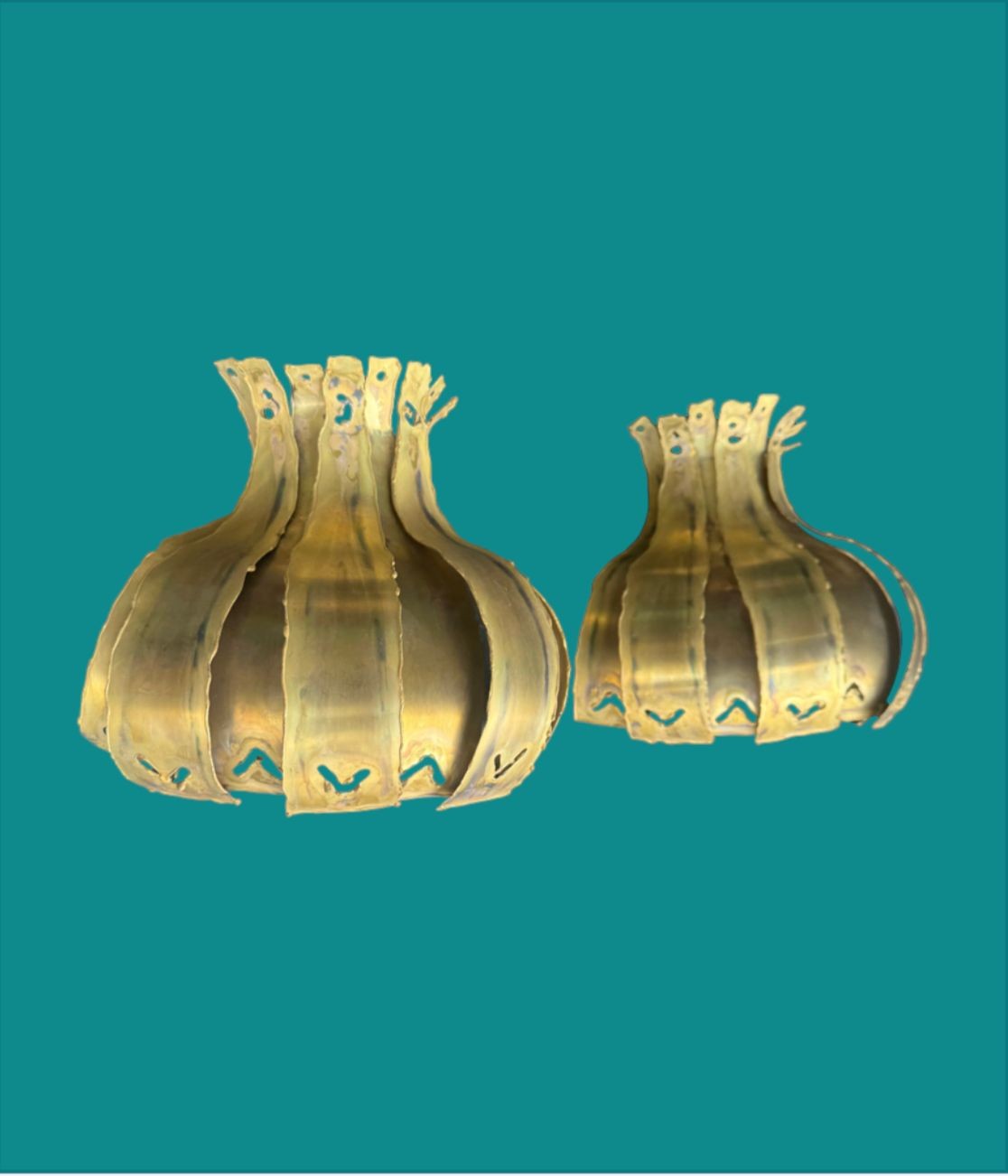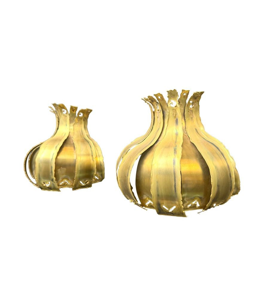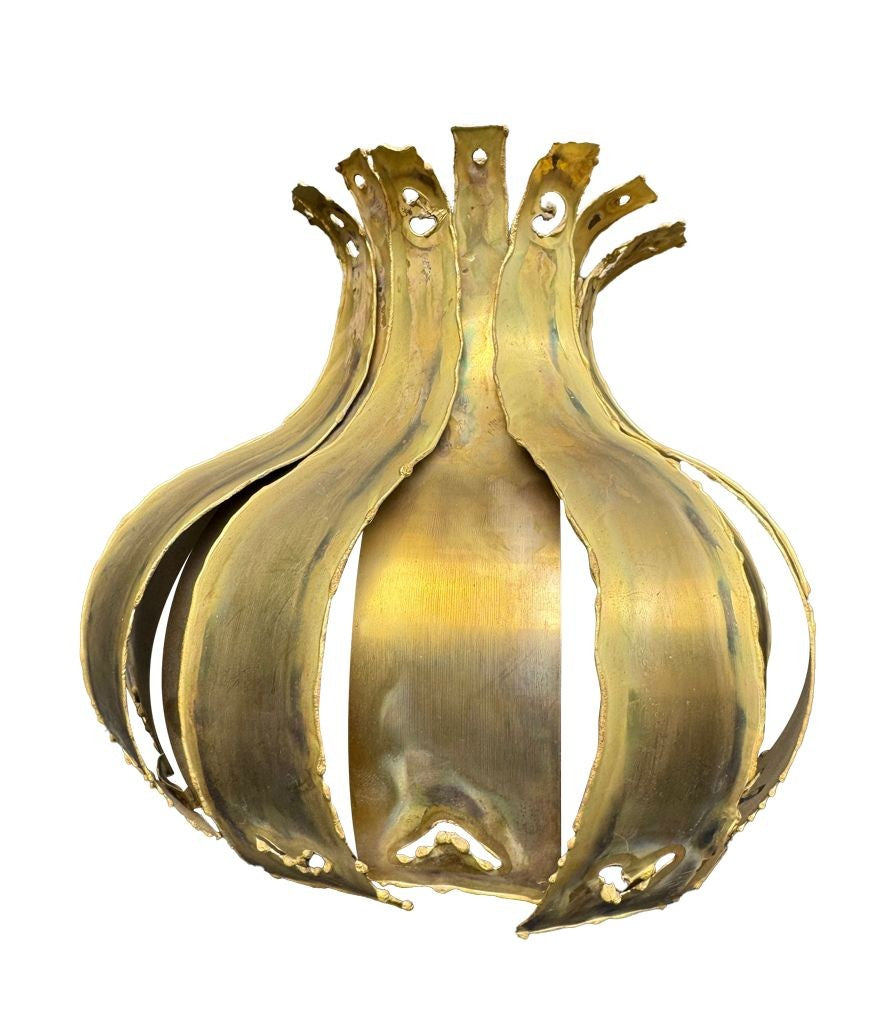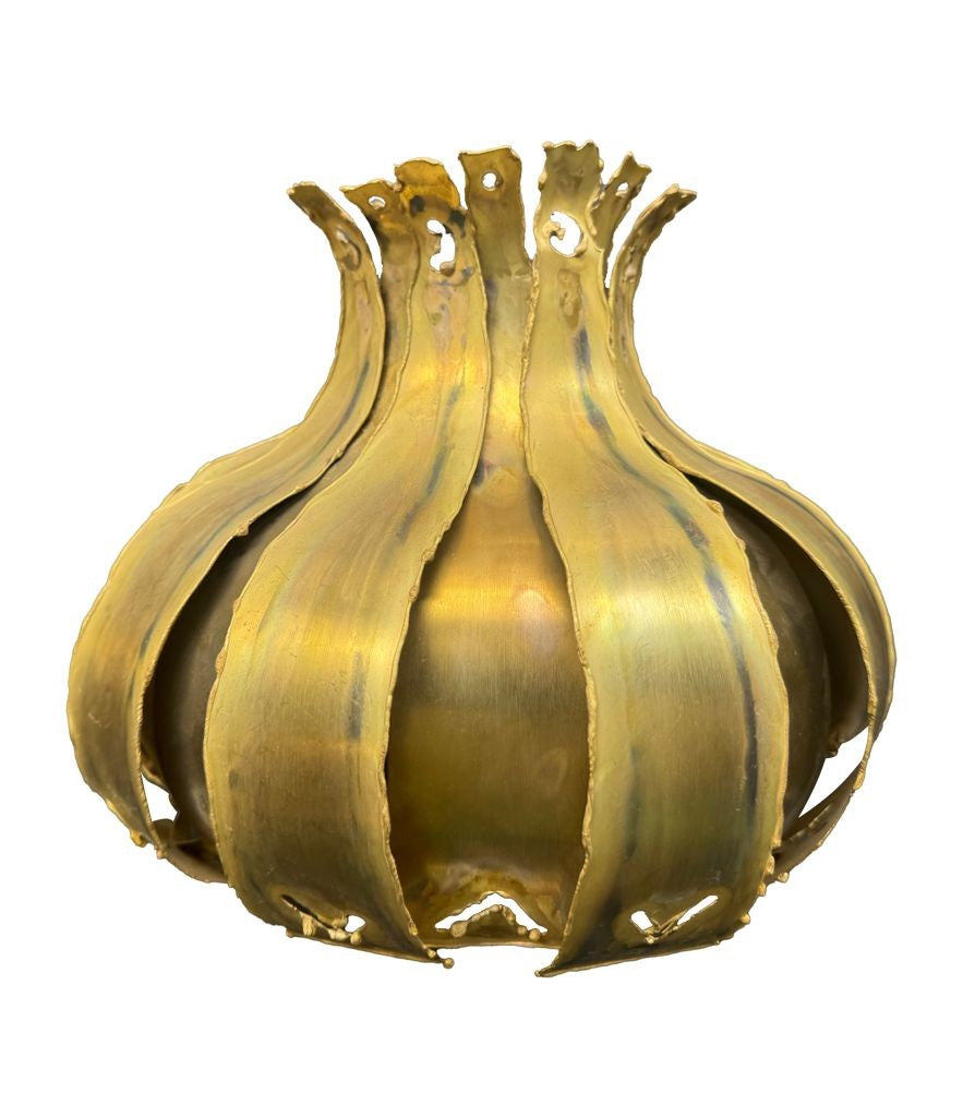 A pair of 1960s Holm Sorensen torch cut brass artichoke shaped wall sconces, with white enamel back plates and re-wired with new brass fittings.