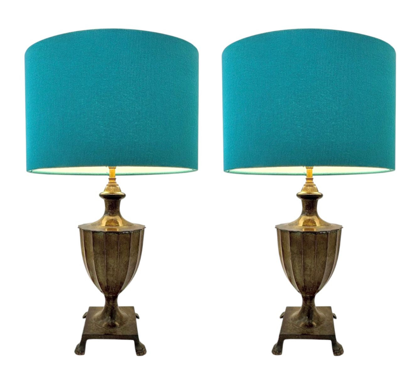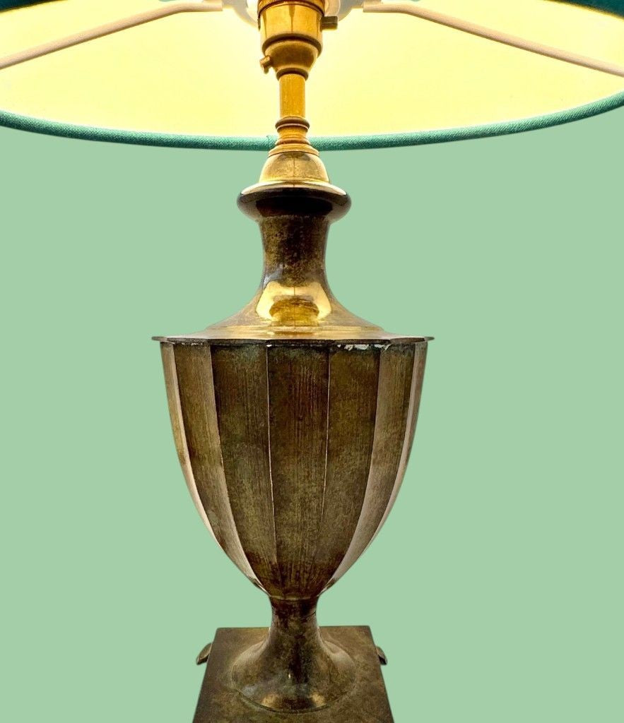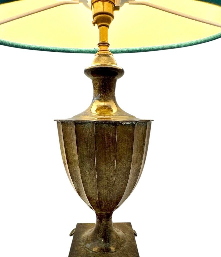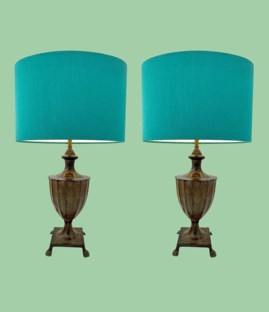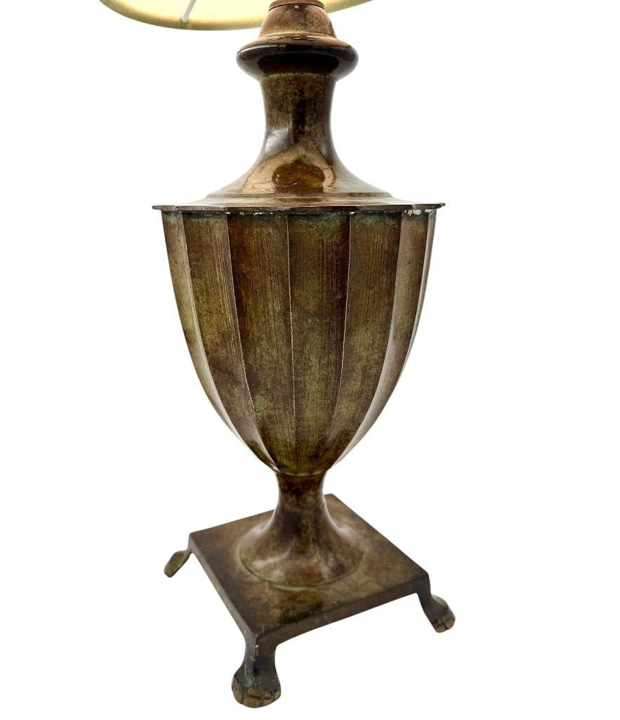 A pair of 1970s classical cast bronze lamps with verdigris finish. Each modelled as a classical urn mounted on square base with paw feet. Re wired with new brass fittings, antique gold cord flex and PAT tested. Dimensions without shades, shades not included but can be purchased separately. Contact for prices.