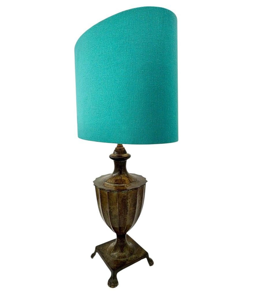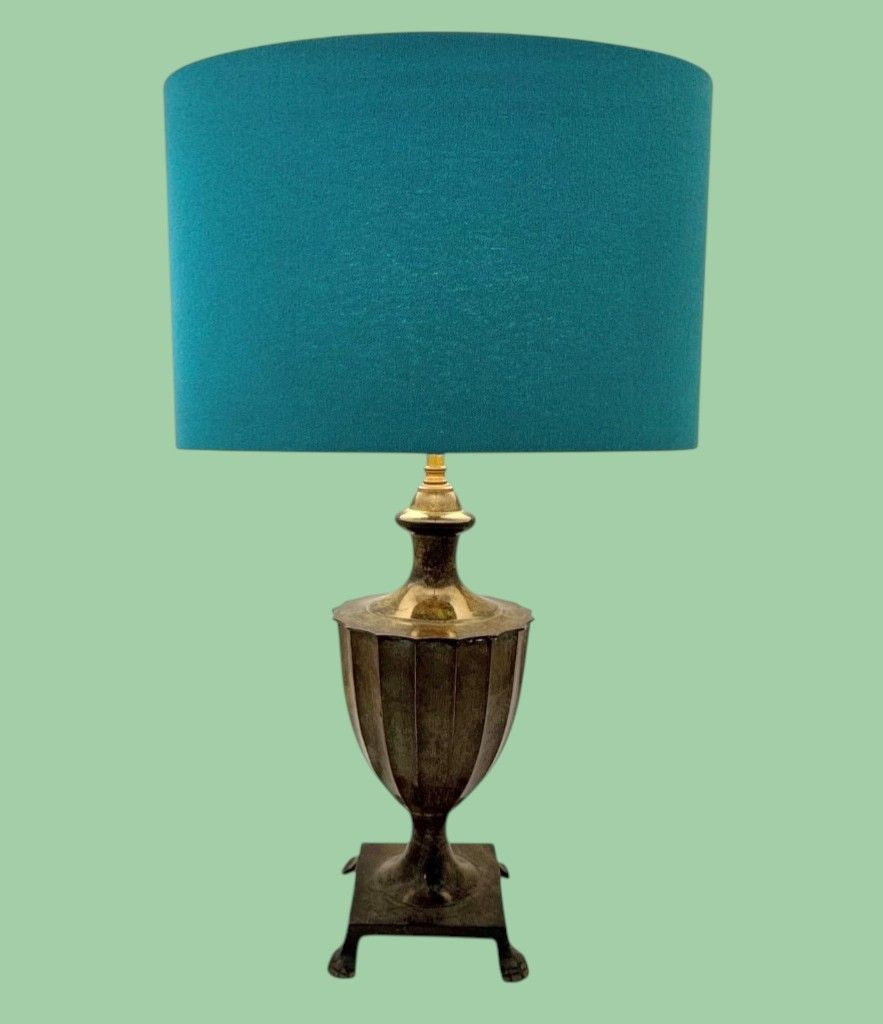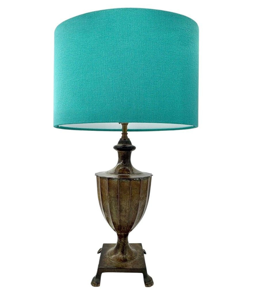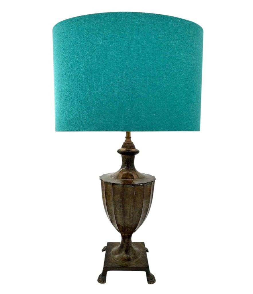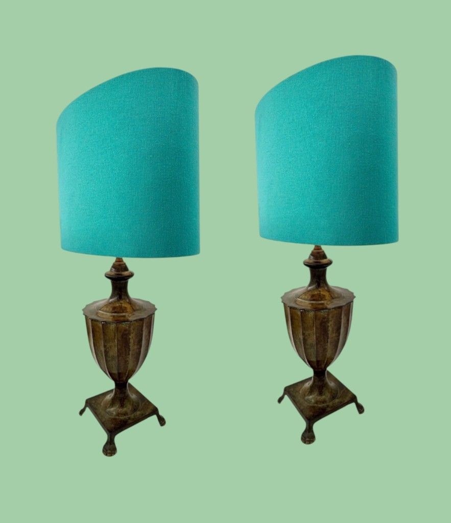 A pair of 1970s classical cast bronze lamps with verdigris finish. Each modelled as a classical urn mounted on square base with paw feet. Re wired with new brass fittings, antique gold cord flex and PAT tested. Dimensions without shades, shades not included but can be purchased separately. Contact for prices.