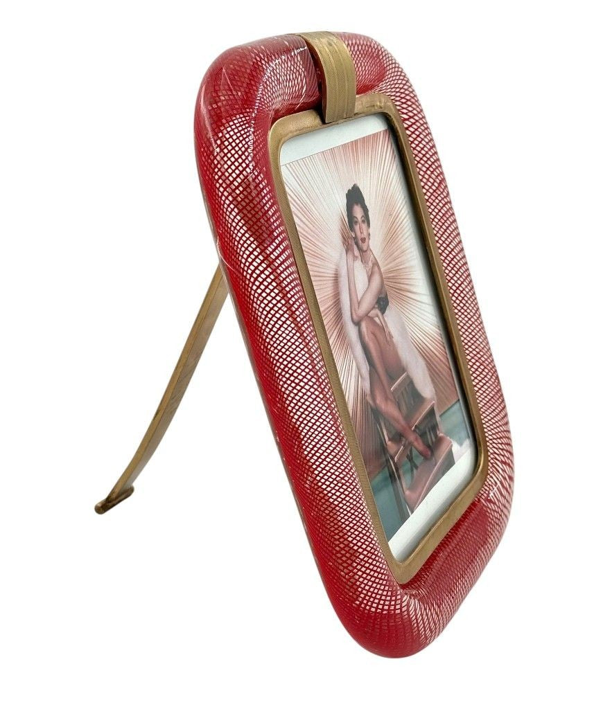 A rare 1930s Venini & Co Murano "Filigrana a Reticello" glass frame by Carlo Scarpa, The Murano glass frame has a brass, etched inner solid brass frame, with central etched collar and a beautifully designed solid brass stand that allows you to remove the stand to hang it on the wall. Stamped on the reverse of the brass stand "Venini, Murano, Made in Italy"