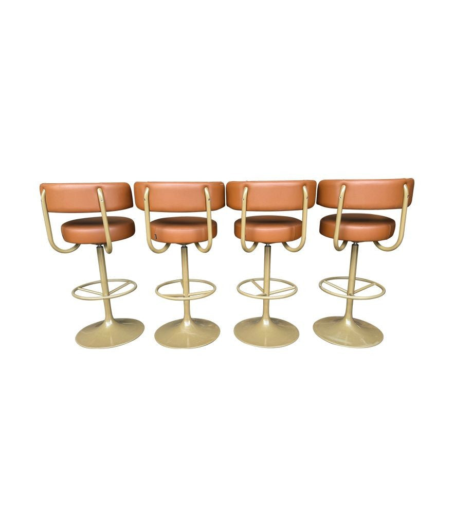 A set of four Börje Johanson “Jupiter” bar stools in cognac faux leather