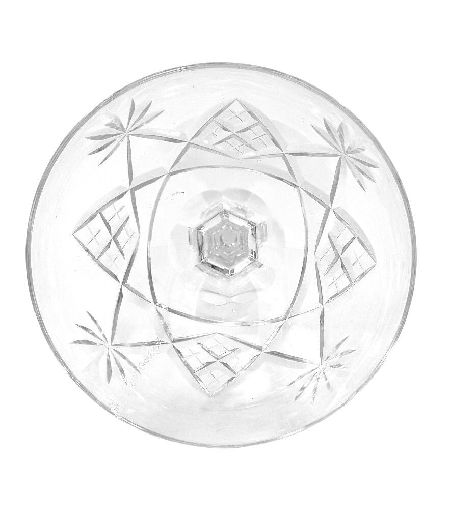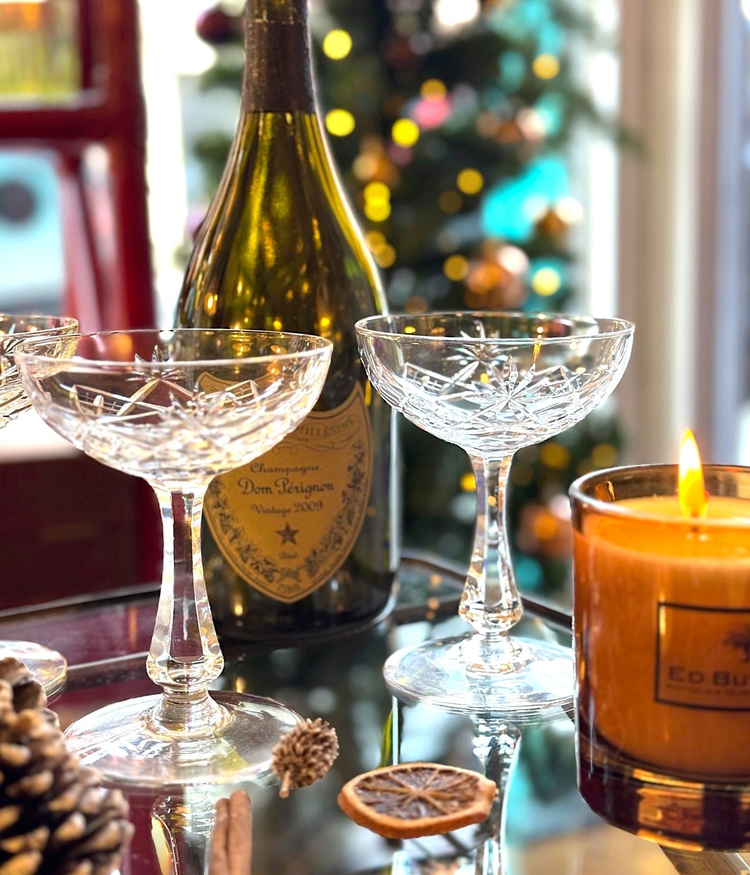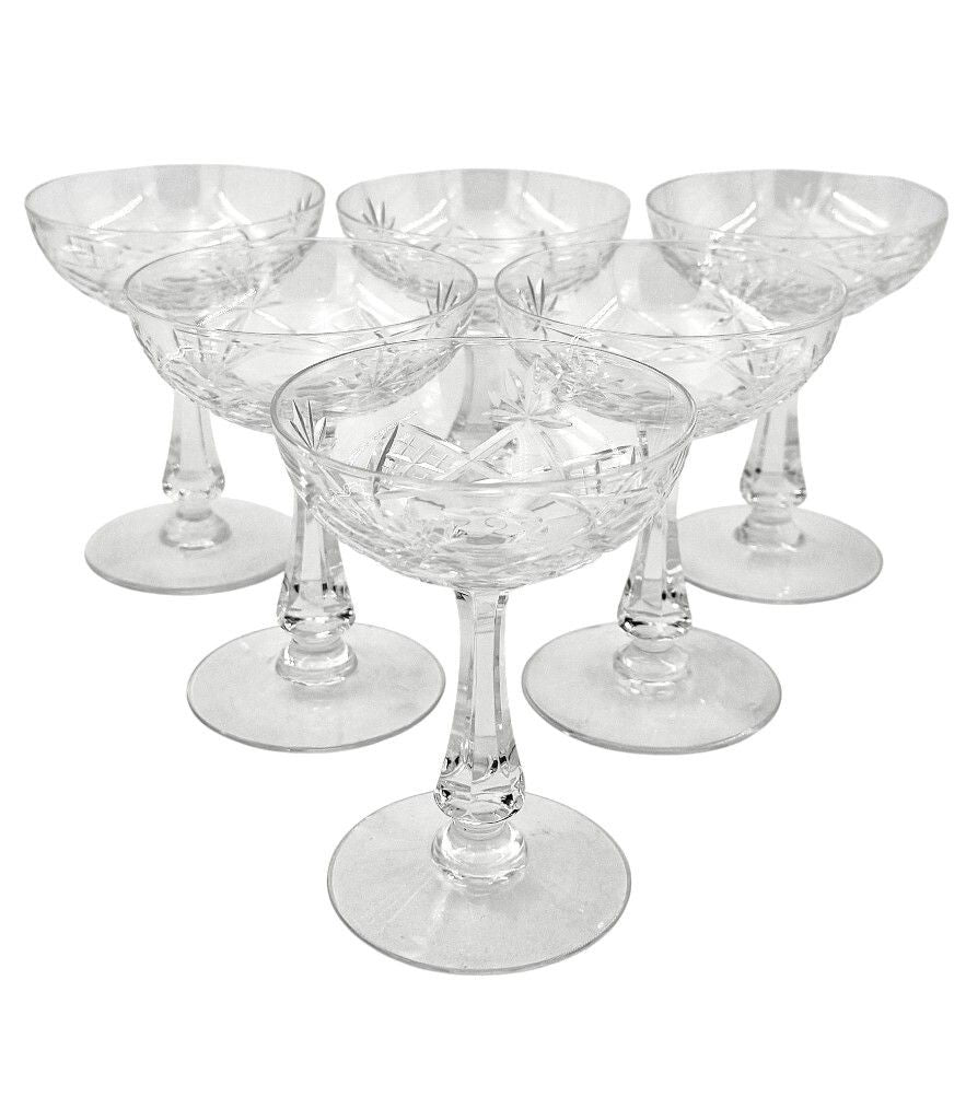 A set of six 1950s Val Saint Lambert "Lubin Annette" crystal champagne coupes, each with etched snowflake design and faceted shaped stem
