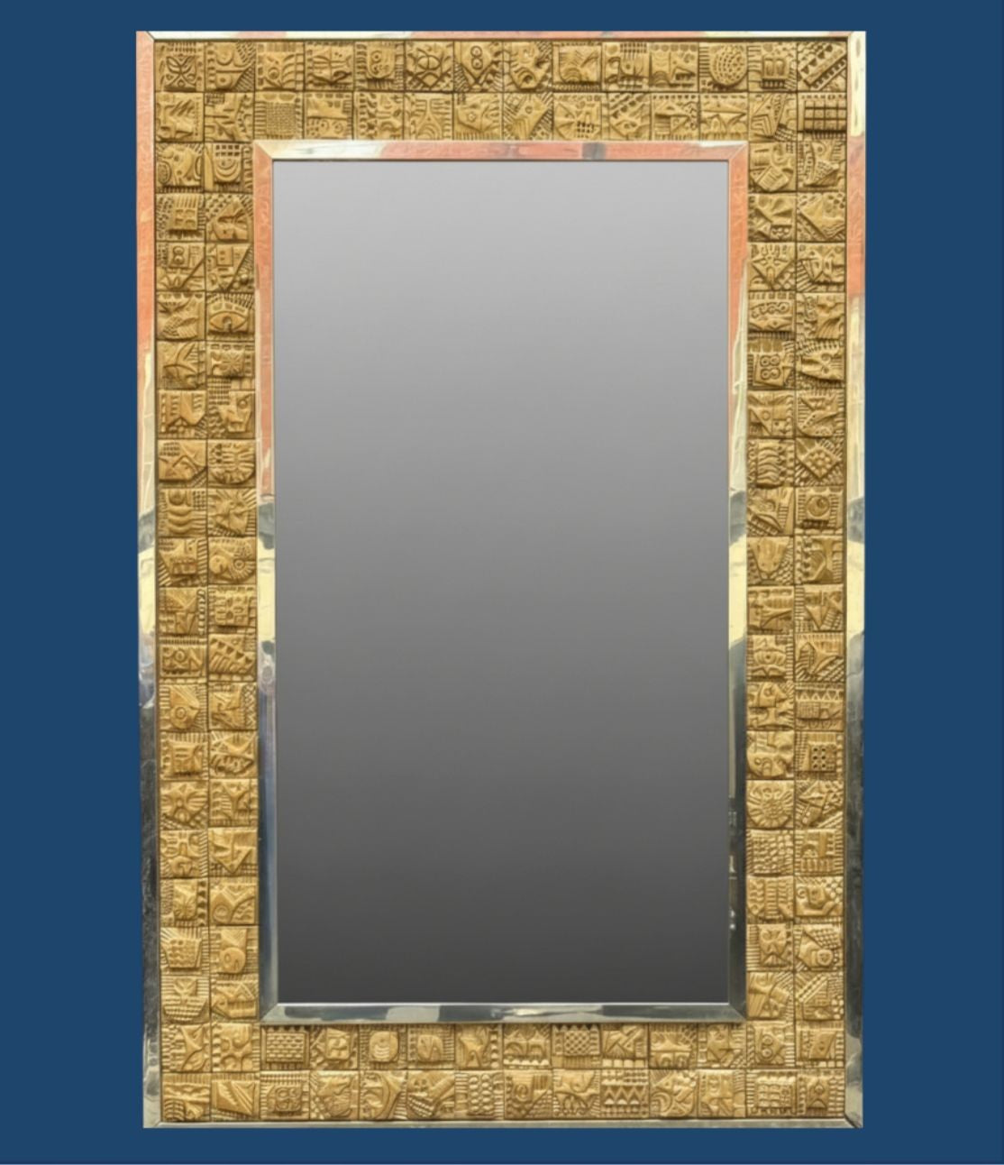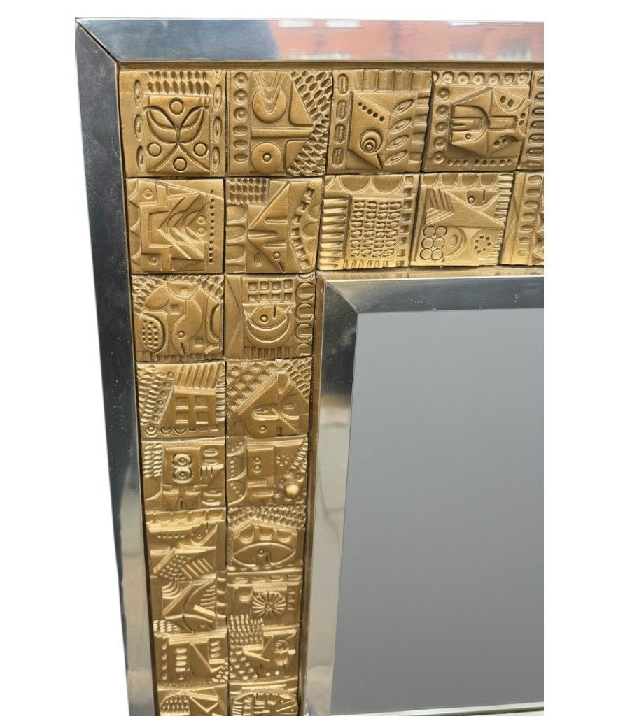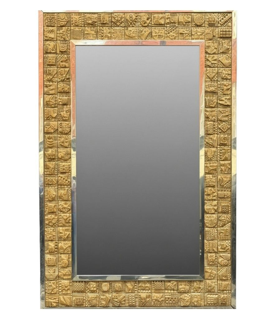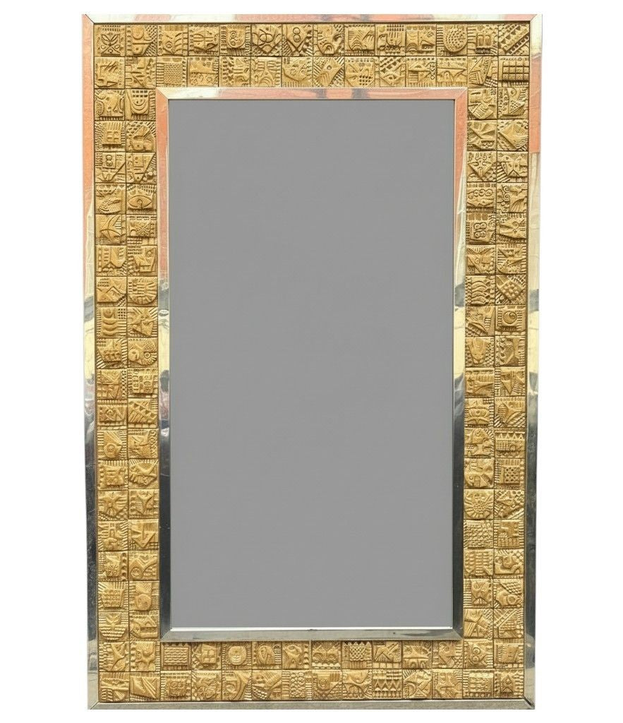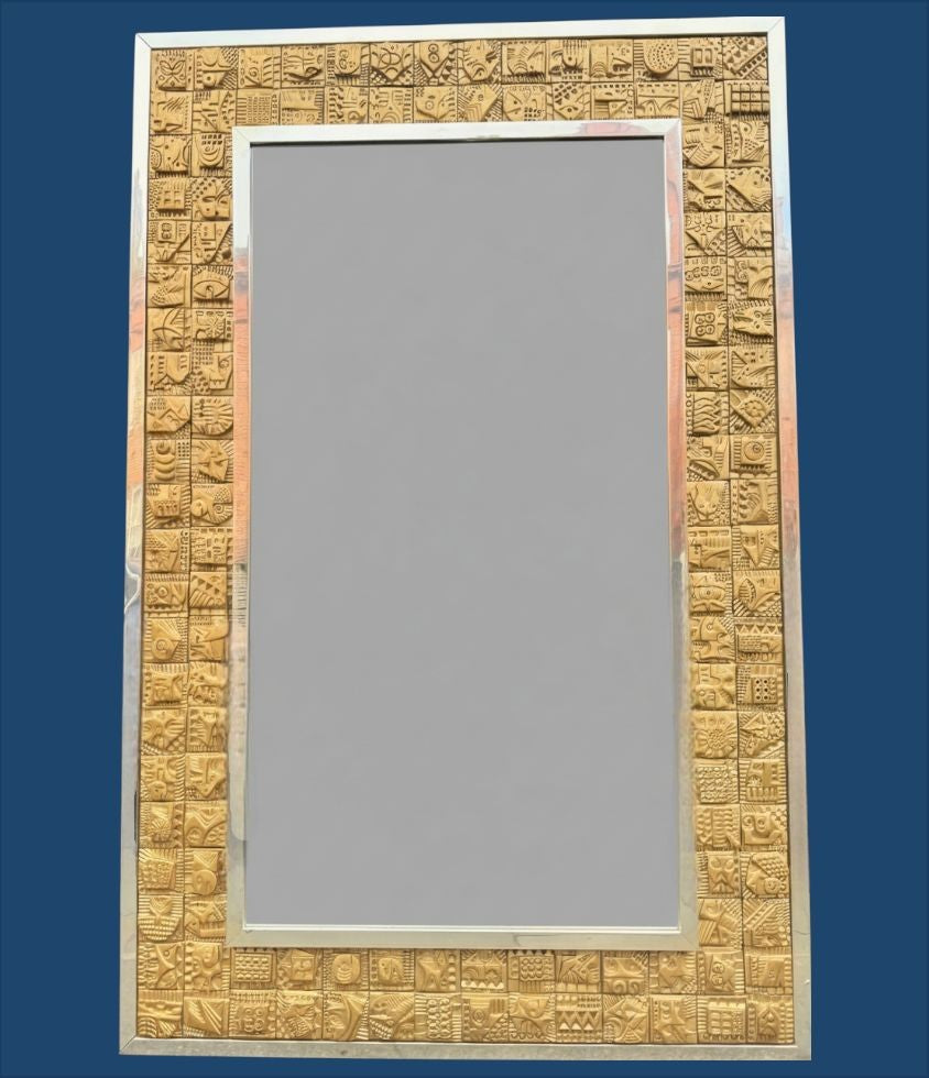 A unique 1960s handmade tiled mirror by English artist Ron Hitchins, with 128 totally unique handmade, sculptured terracotta tiles, each with his wonderful aztec style design and finish in gold colour. One of the tiles is signed "Ron Hitchins" and on the reverse is signed by the artist " An Original work of art, each tile individually hand sculptured bottom right hand tile signed Ron Hitchins"