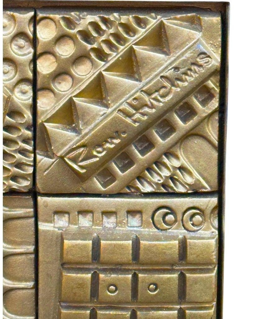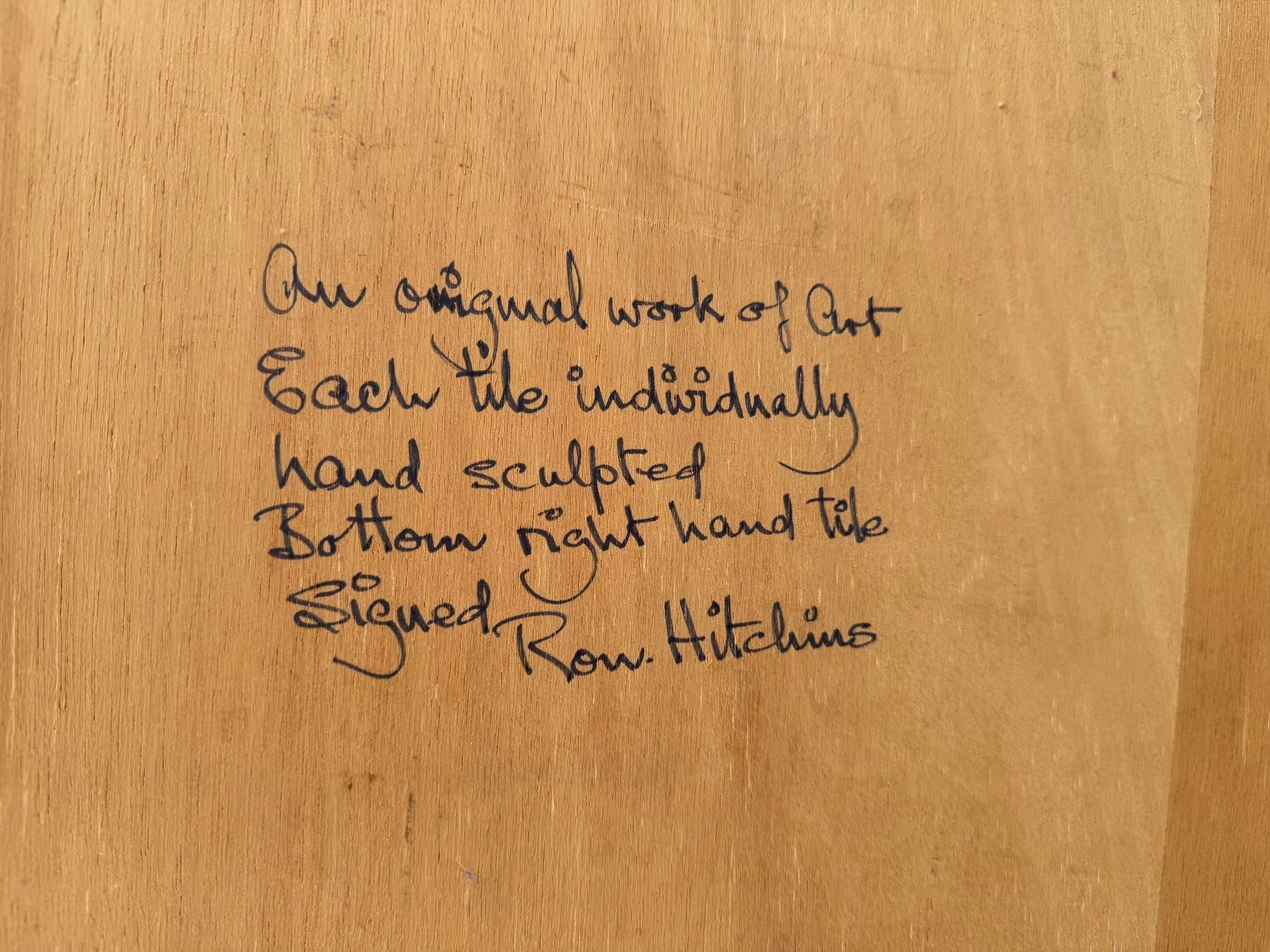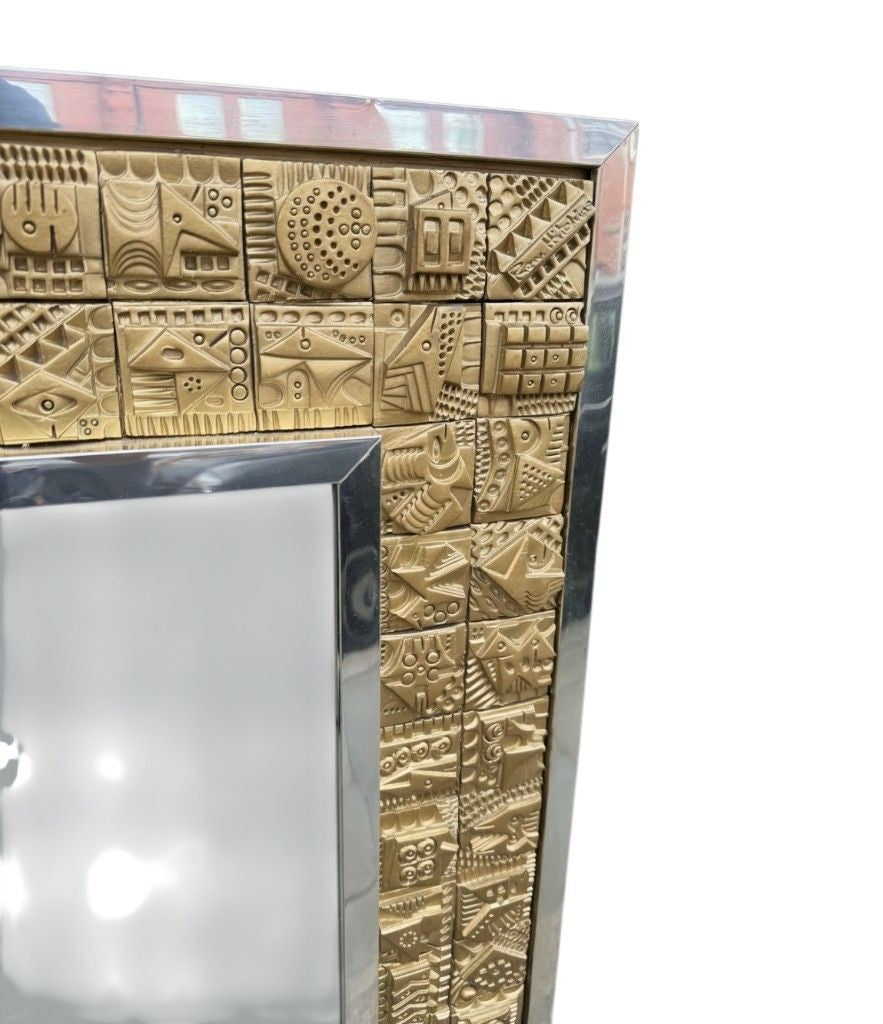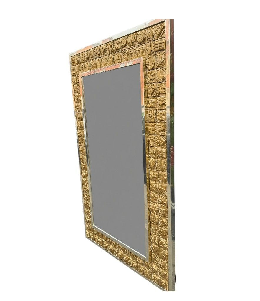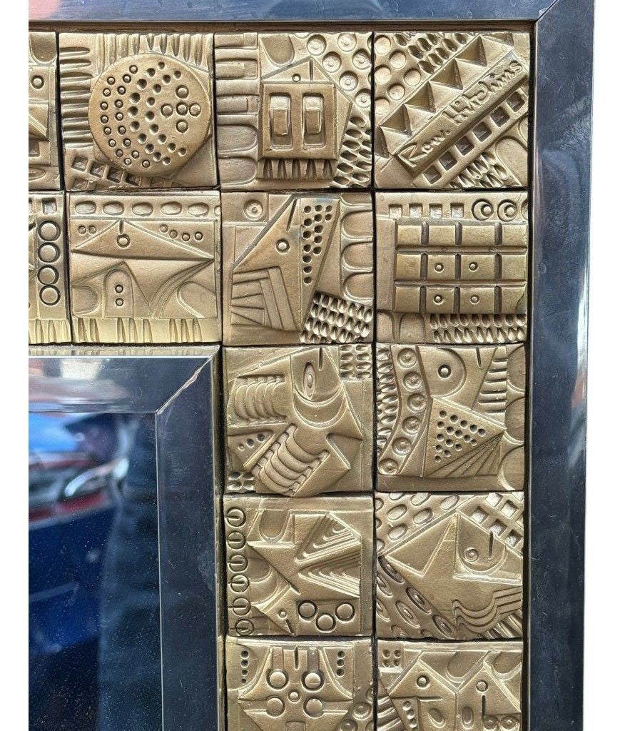 A unique 1960s handmade tiled mirror by English artist Ron Hitchins, with 128 totally unique handmade, sculptured terracotta tiles, each with his wonderful aztec style design and finish in gold colour. One of the tiles is signed "Ron Hitchins" and on the reverse is signed by the artist " An Original work of art, each tile individually hand sculptured bottom right hand tile signed Ron Hitchins"