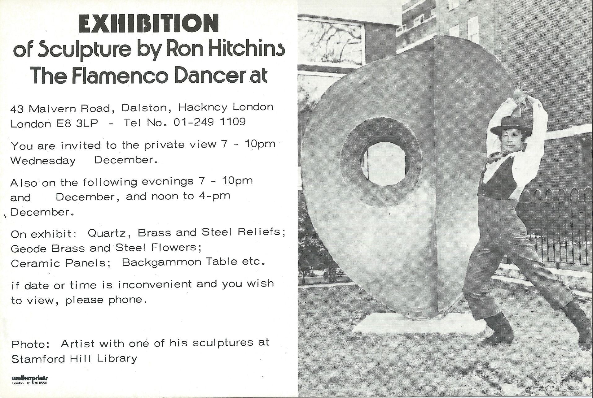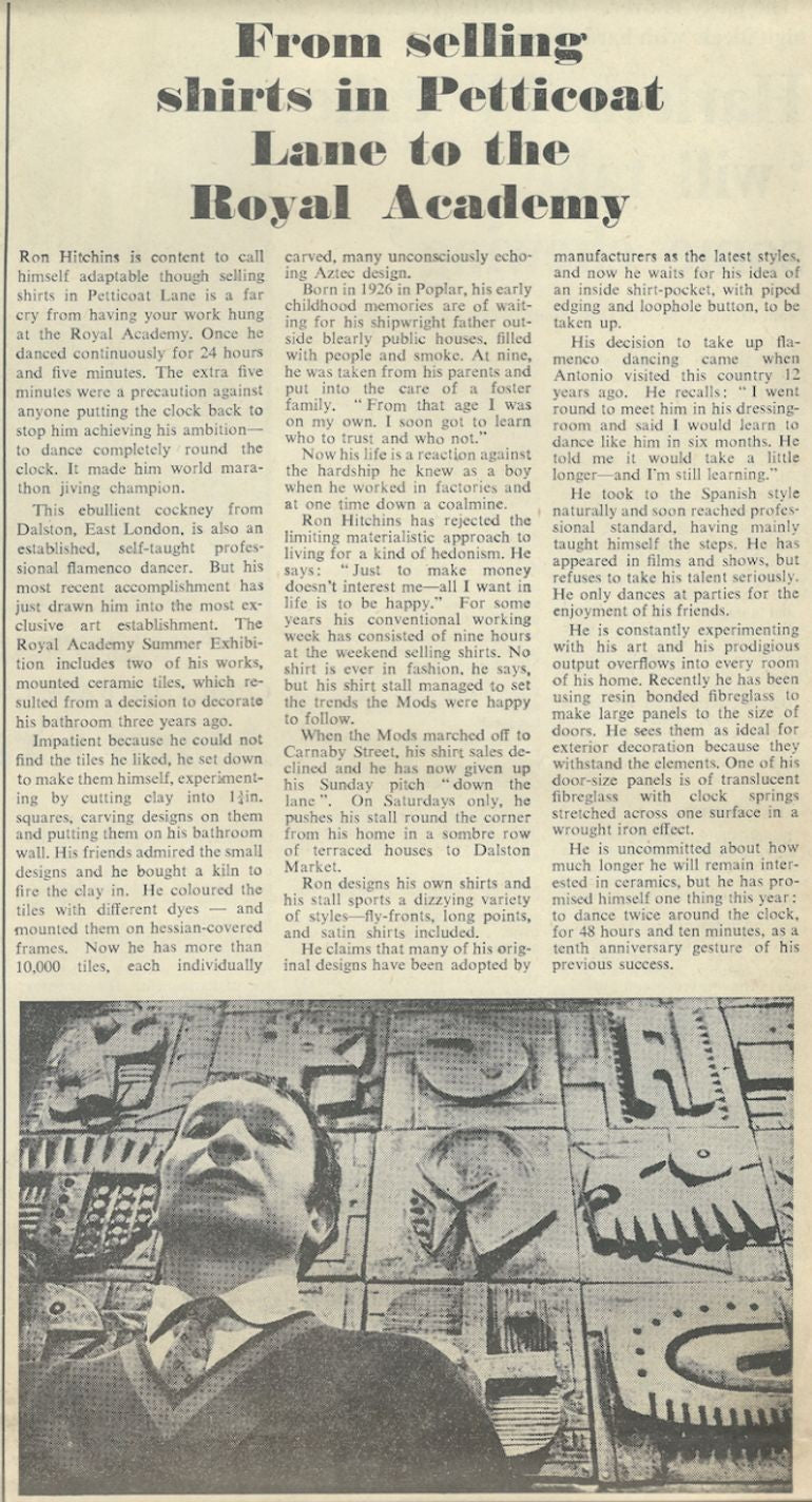 He also he also worked with fibreglass. His designs were often inspired by foreign design influences, notably Aztec. He made some large beautiful sculptural pieces, most of which hung all over his house, both inside and out. Although much loved as an artist, Hitchins was first and foremost known as an avid Flamenco dancer. He almost single-handedly introduced London to this form of dancing in the 1950s and 60s and until his death in 2019 he remained an active member of the Flamenco Dance scene. Claudine Roux, Andrew Tullis and Lucy Cash directed a short film about his life called ‘Made in Hackney’.