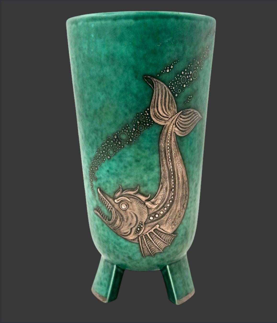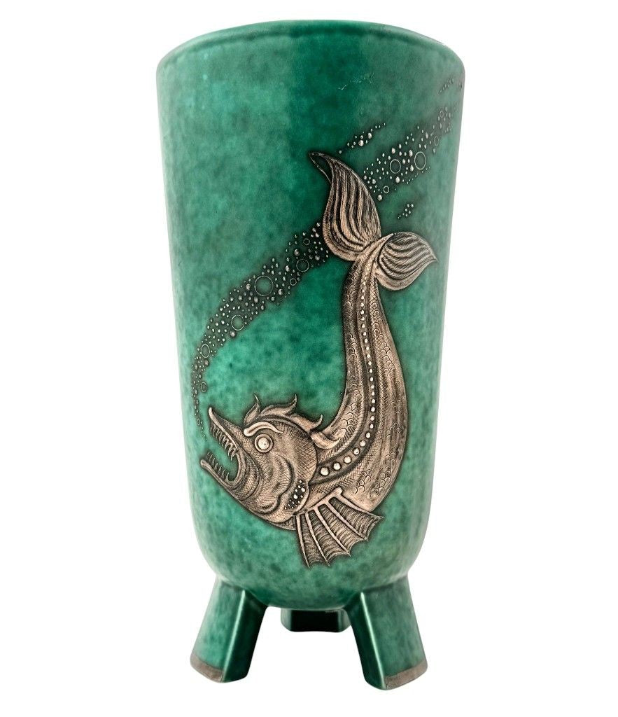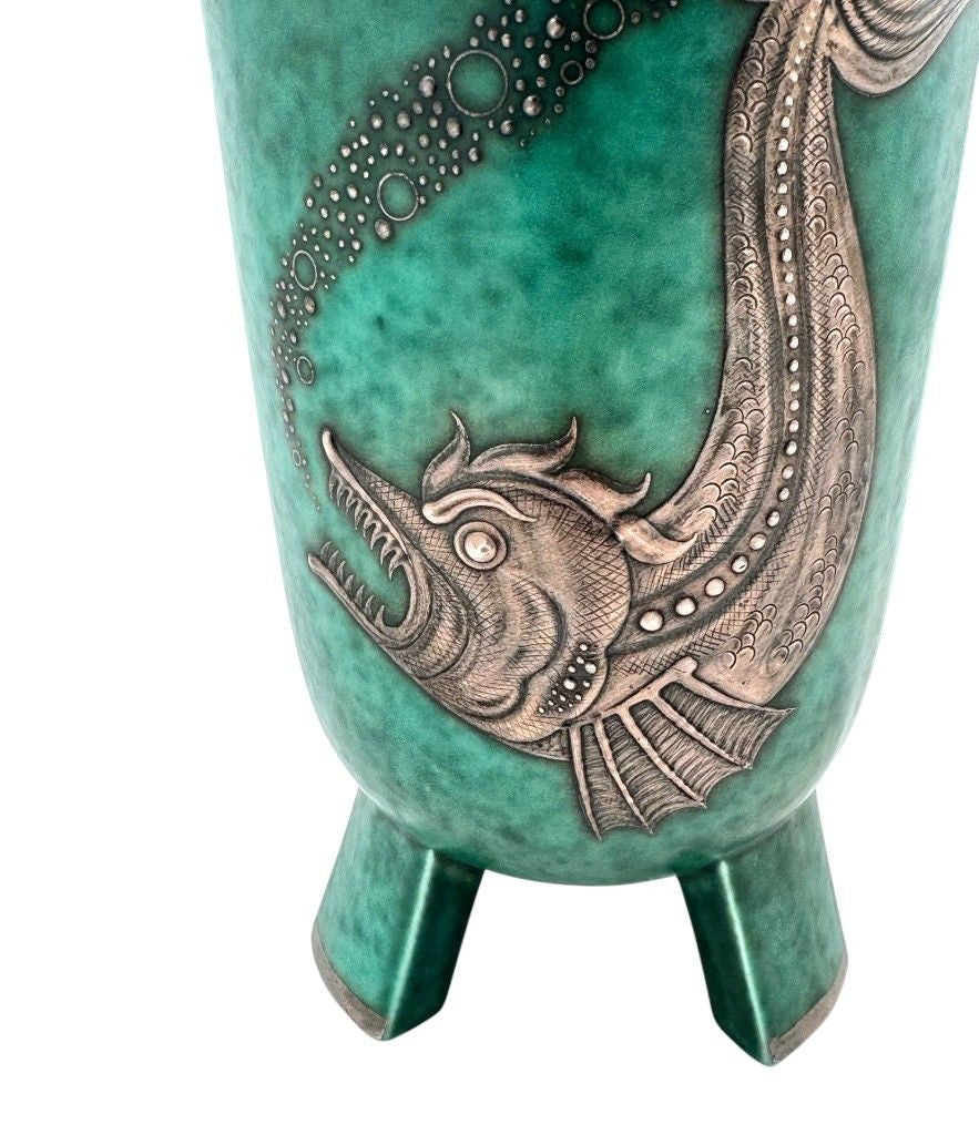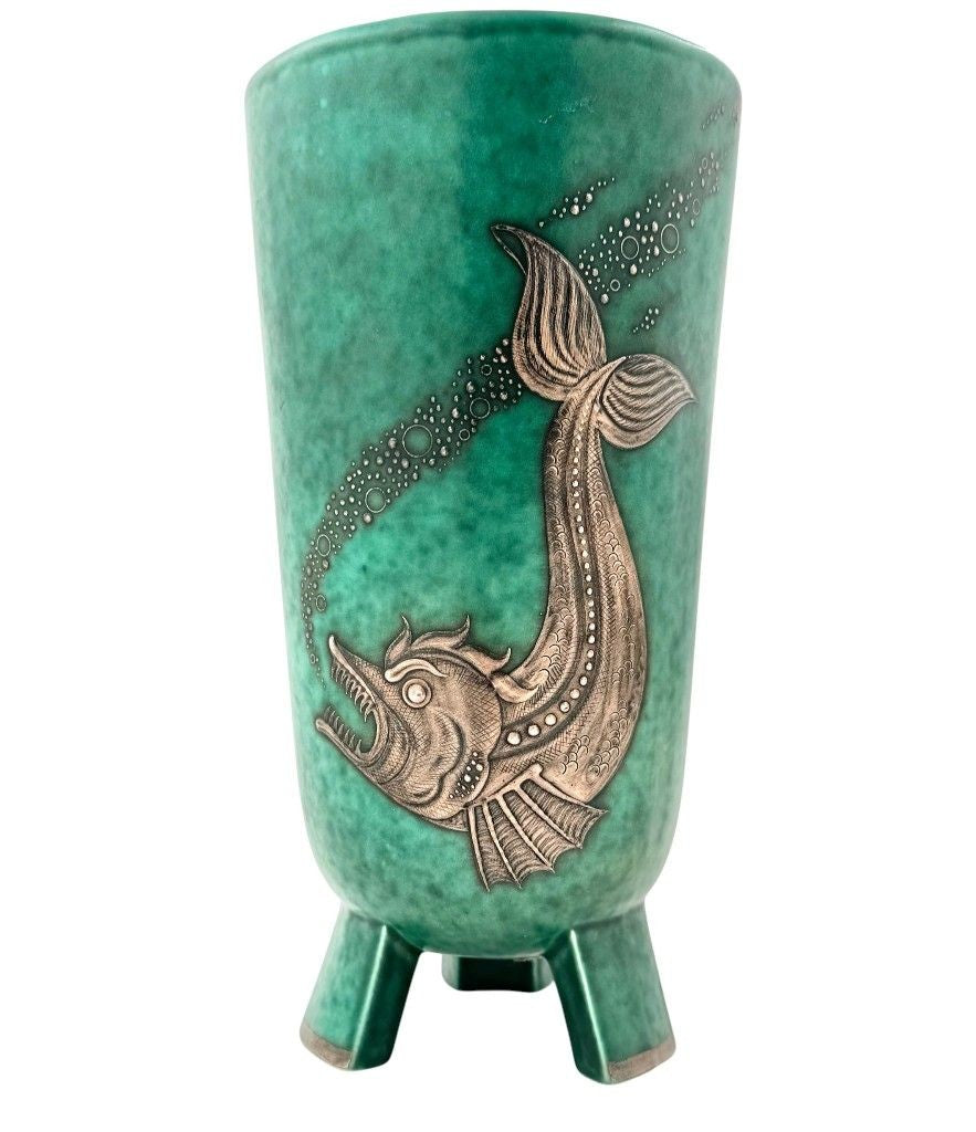A lovely Art Deco 1930s three legged stoneware vase by Wilhelm Kåge, for Gustavsberg, Sweden. Designed with the iconic mottled green base, which was produced by copper oxide and decorated with a mythological fish with a string of bubbles rising up to the rim, all in the iconic silvered, hand painted and chiselled finish. Stamped on the base with orignal Gustavsberg sticker.