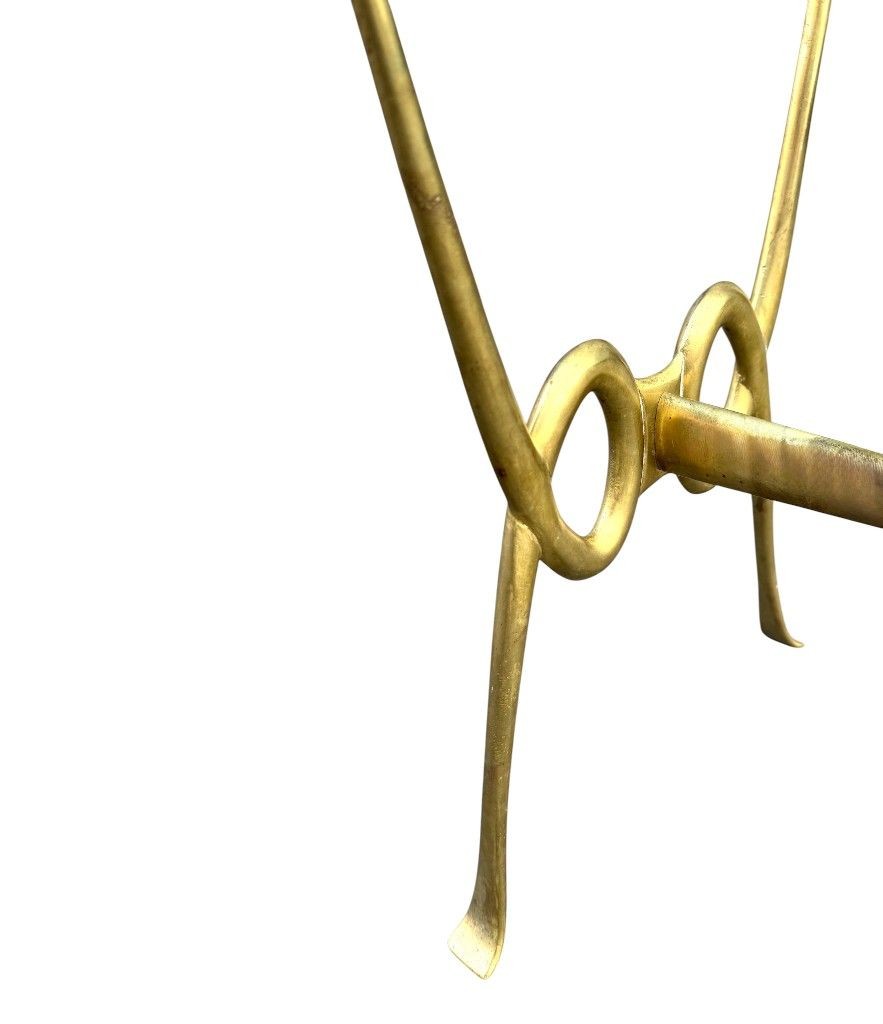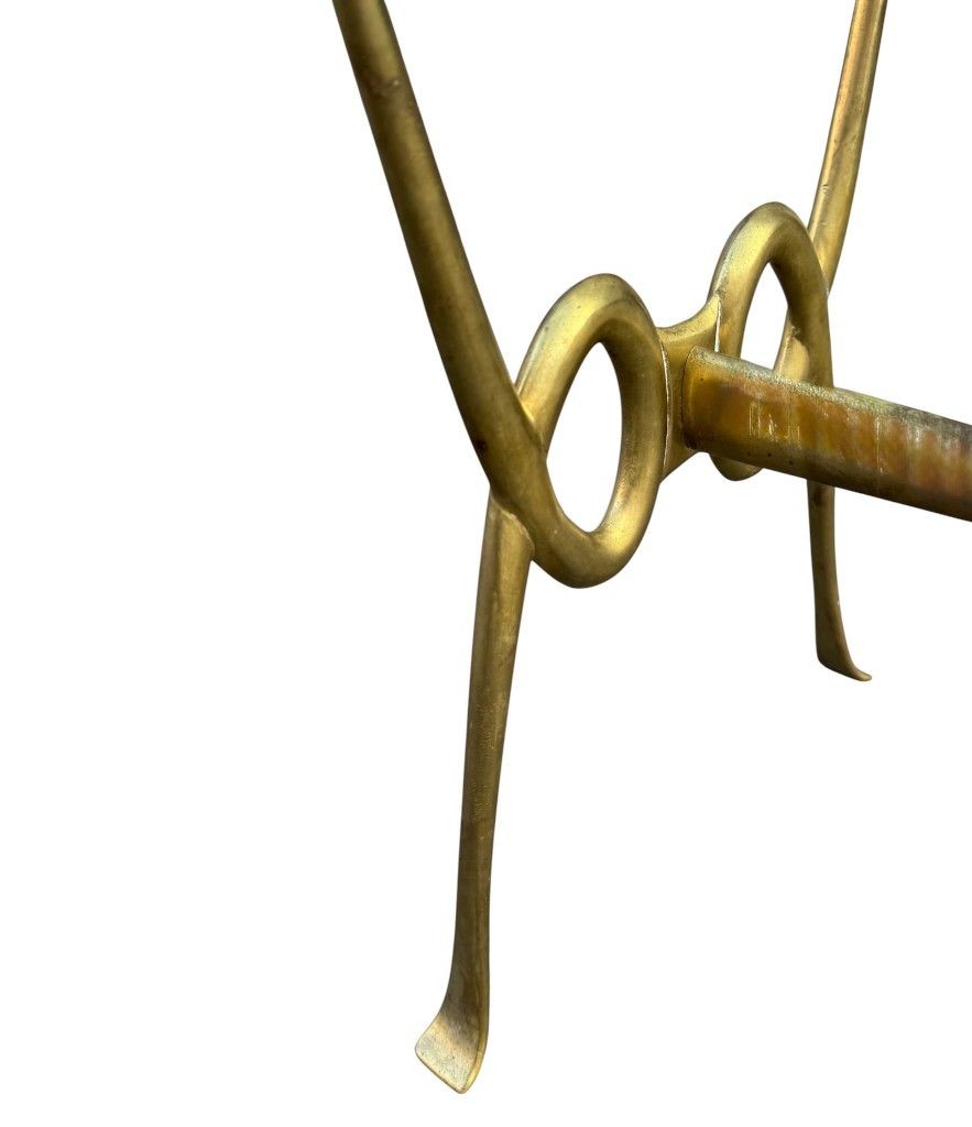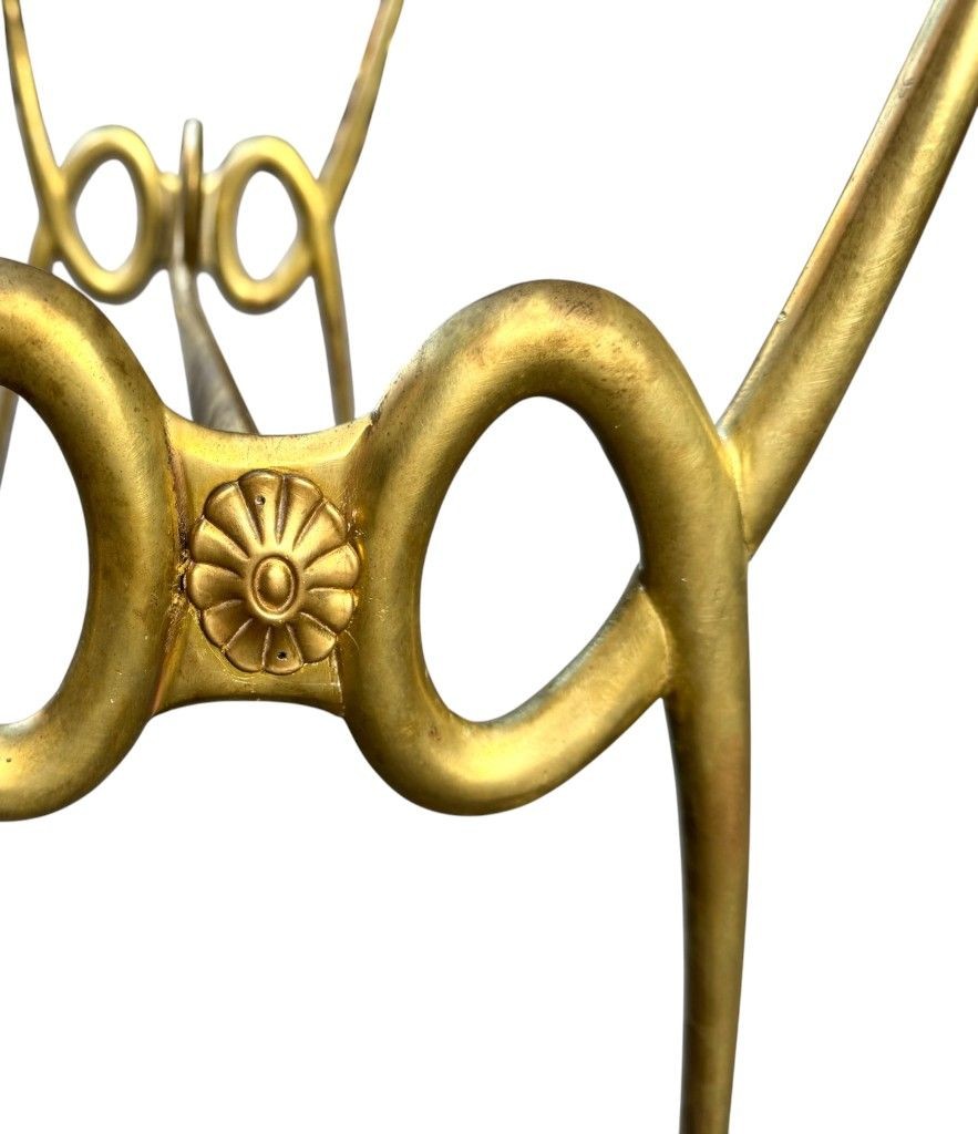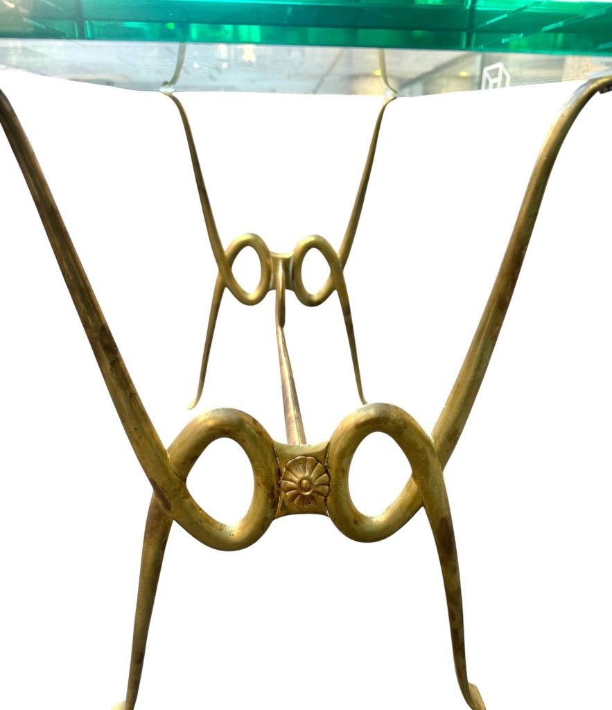 An Italian 1950s brass cocktail table by Janetti, Florence. With ornate cast brass base with floral roundel on each end and orignal thick 2cm green glass top.