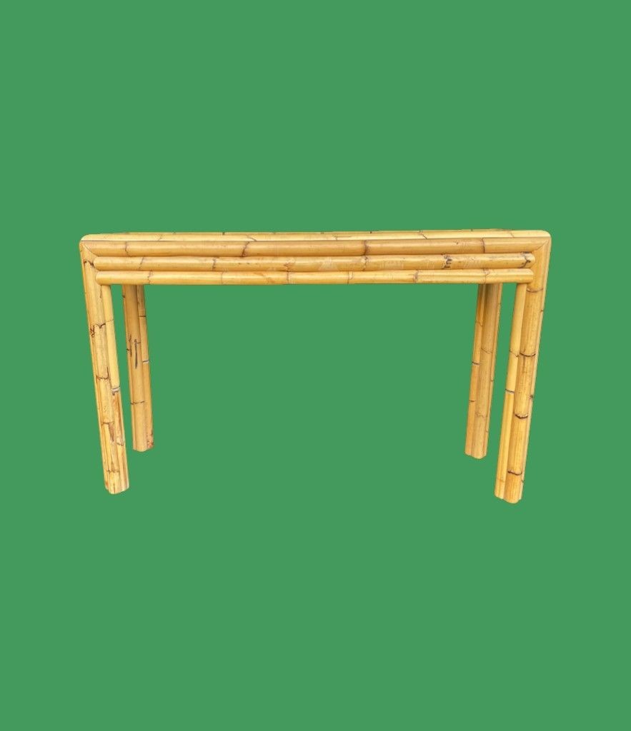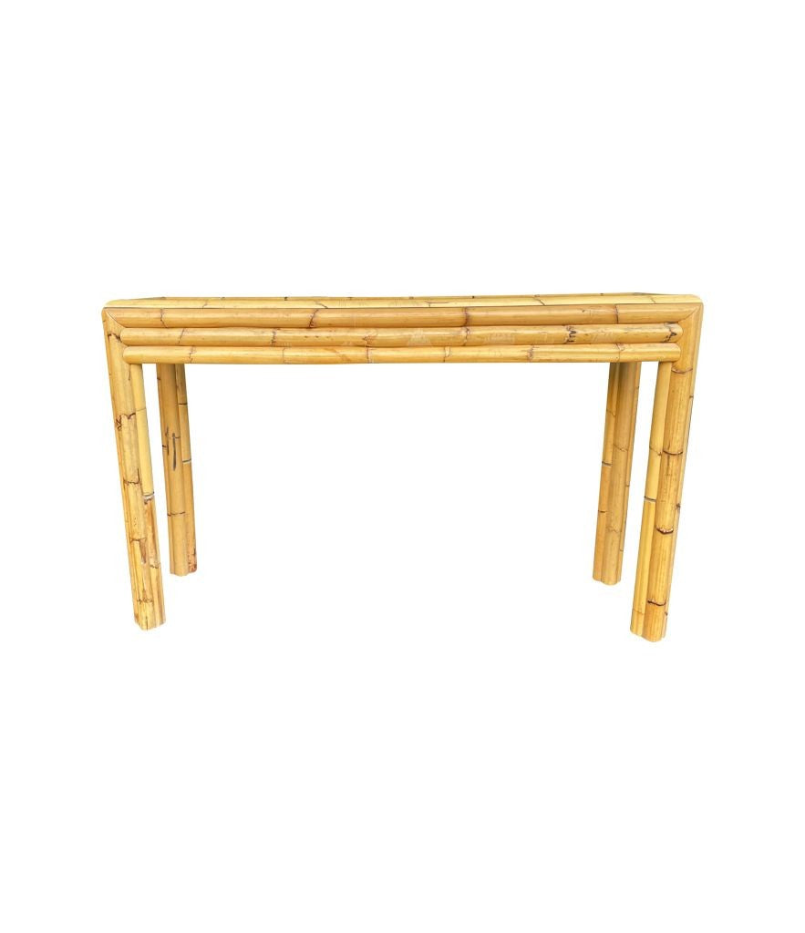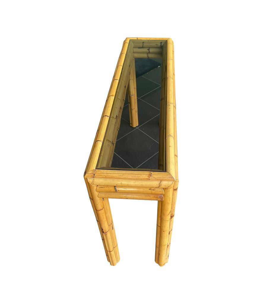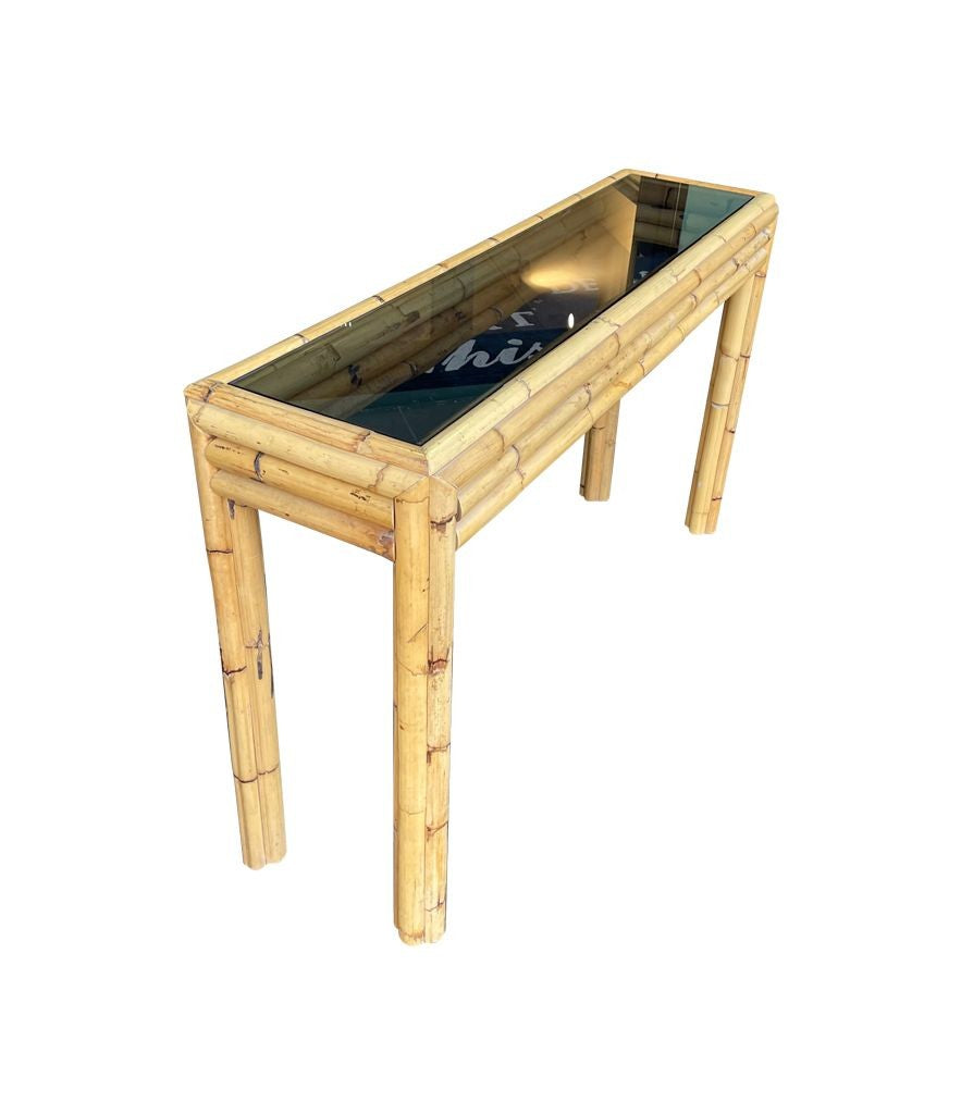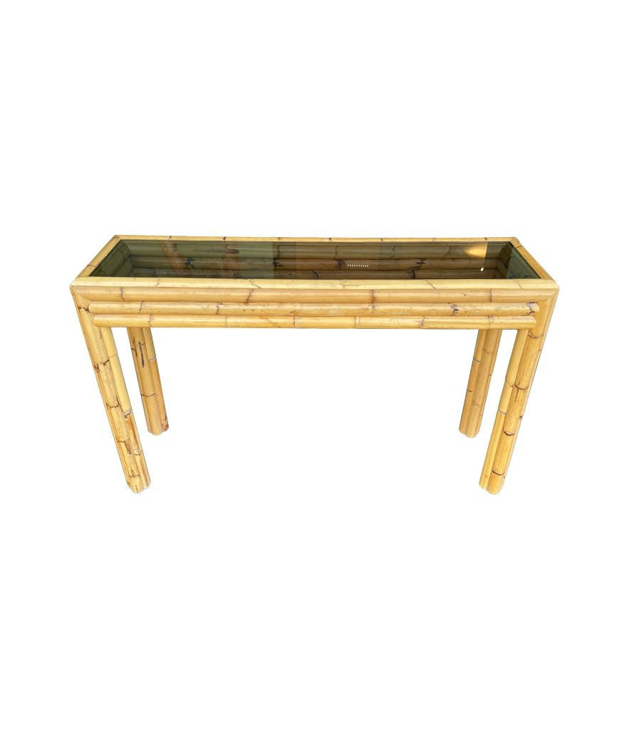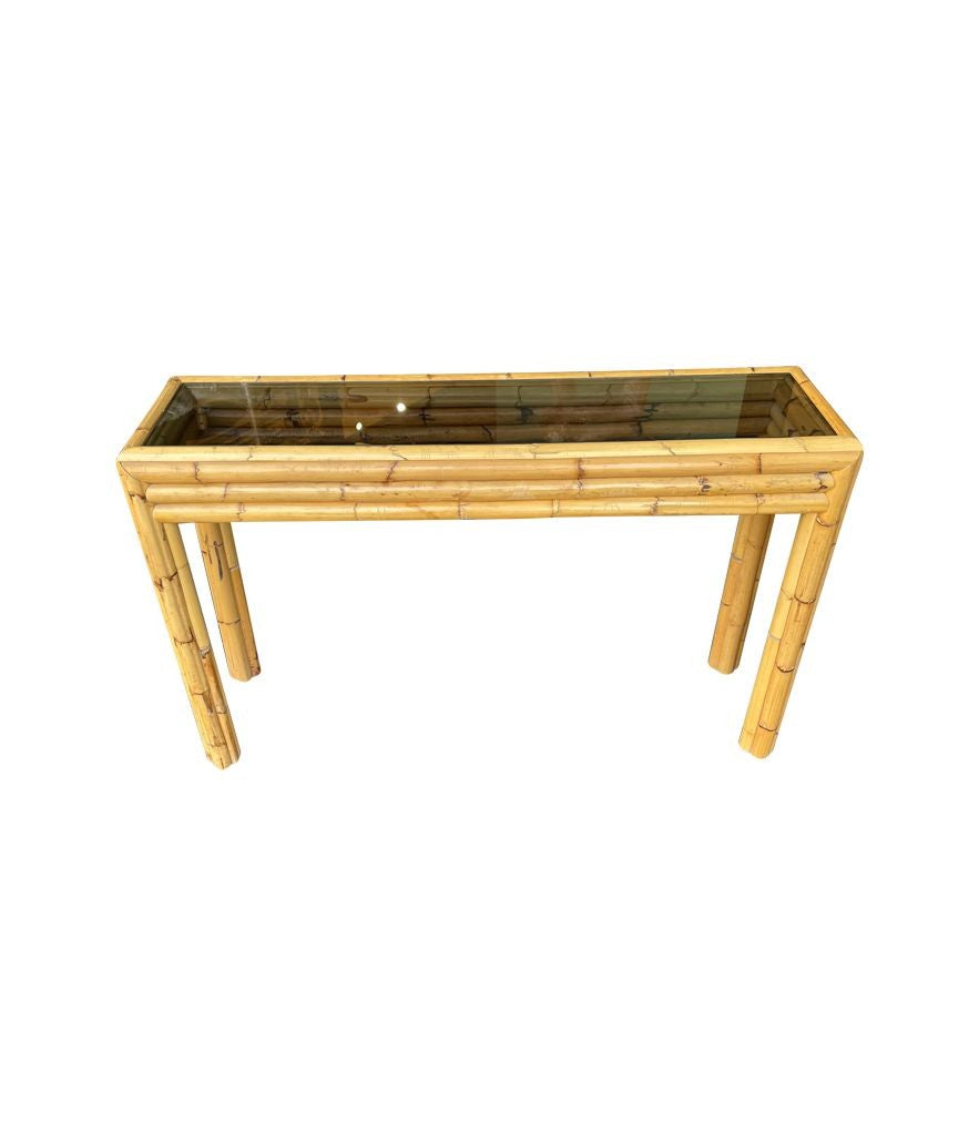 An Italian 1970s chunky bamboo console table attributed to Vivai Del Sud with orignal smoked glass top
