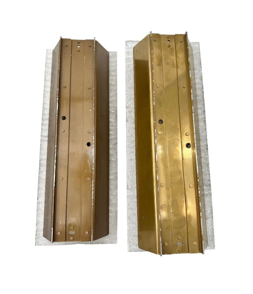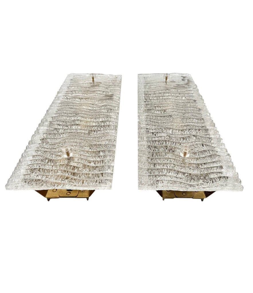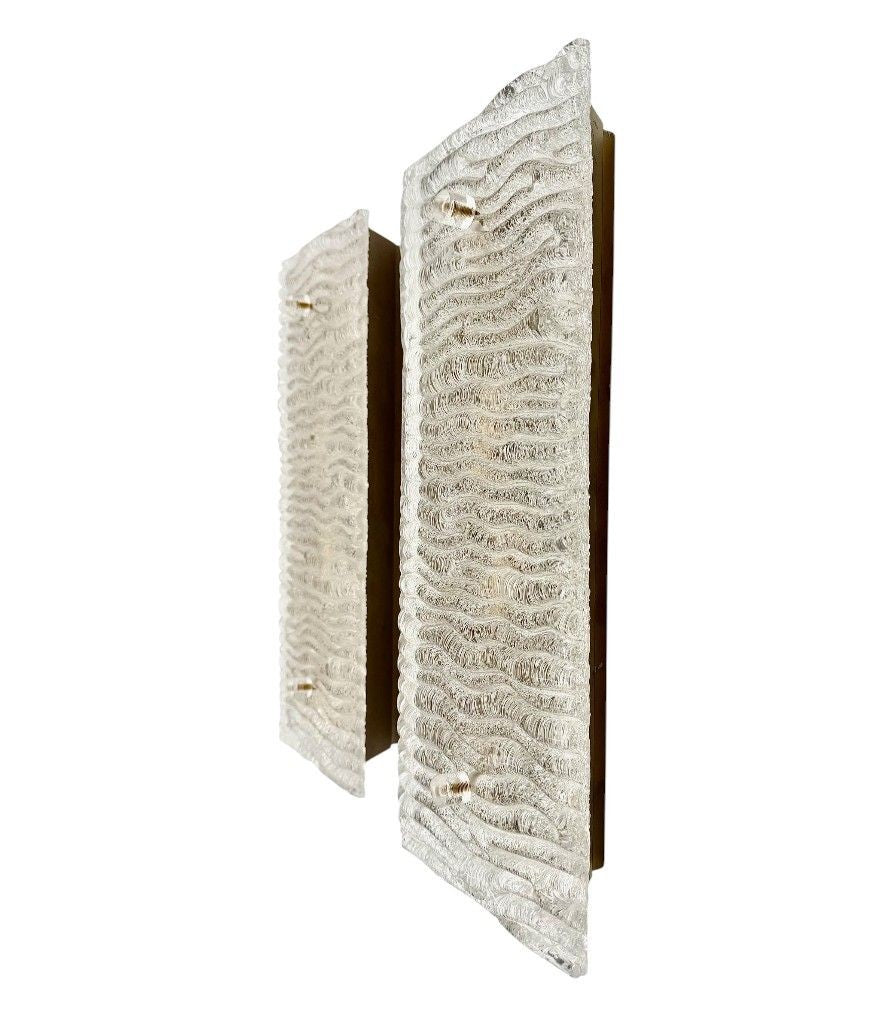 A pair of large 1970s "Ice Glass" wall lights by Leutchens, each with two light fittings, mounted on brass back plate. Rewire with new fittings and PAT tested