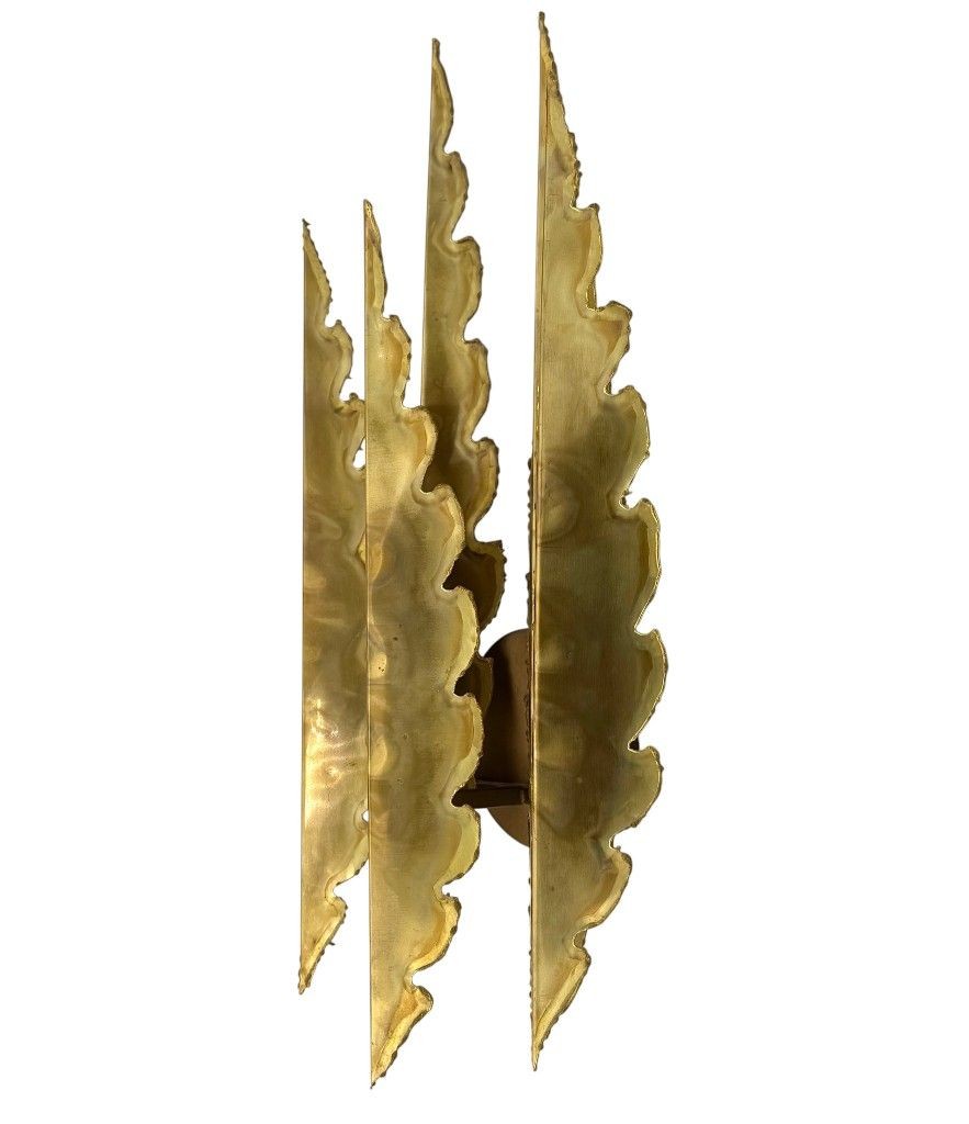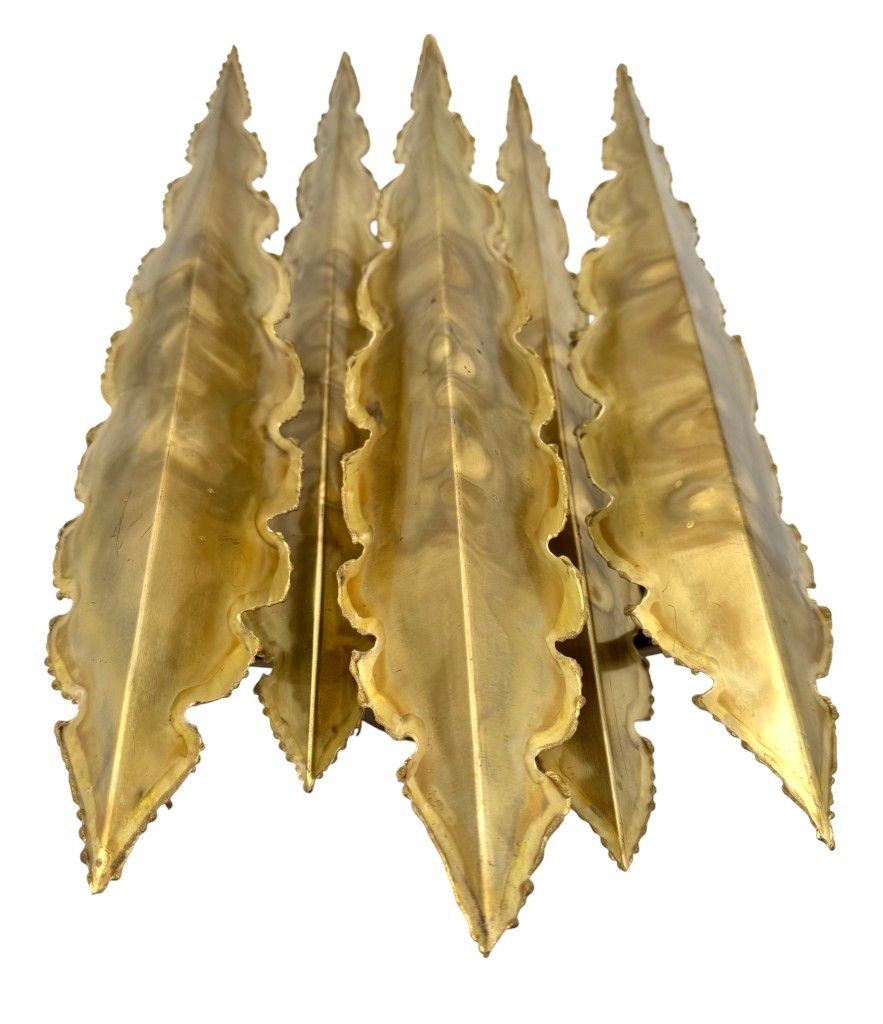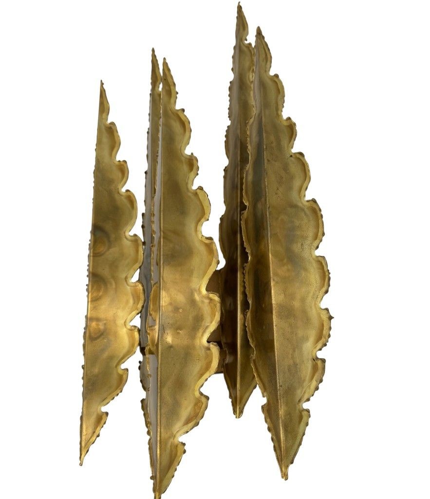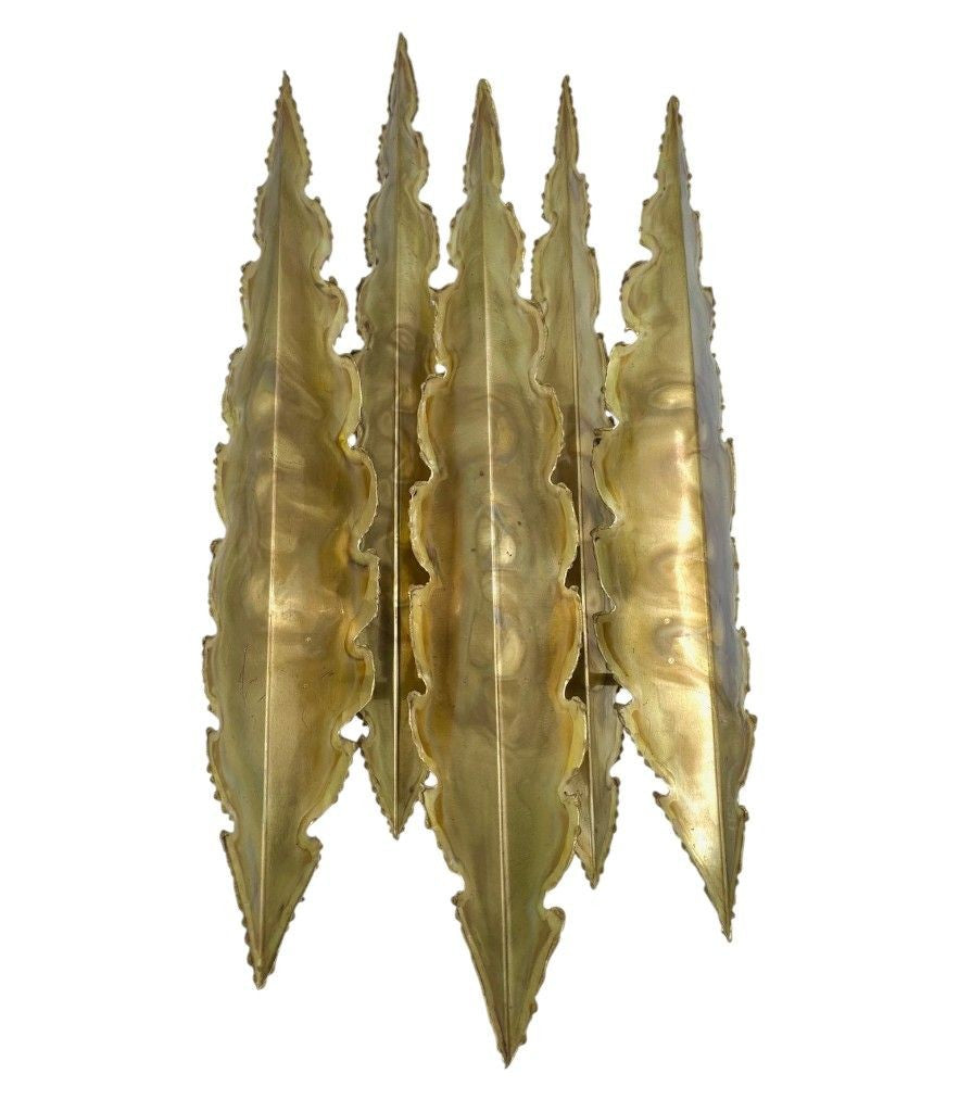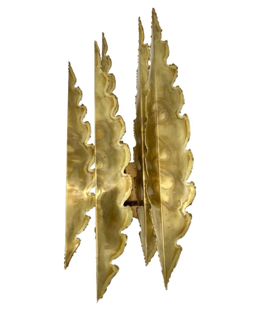 A pair of large 1960s 5 frond, torch cut brass wall sconces by Holm Sorensen. Each with three light fittings behind the brutalist fronds. Re wired with new brass fittings and PAT tested