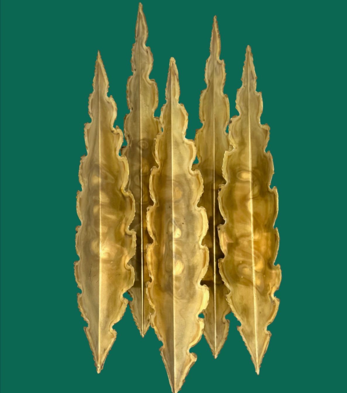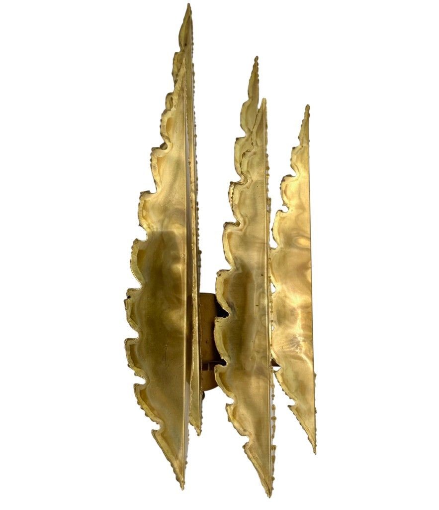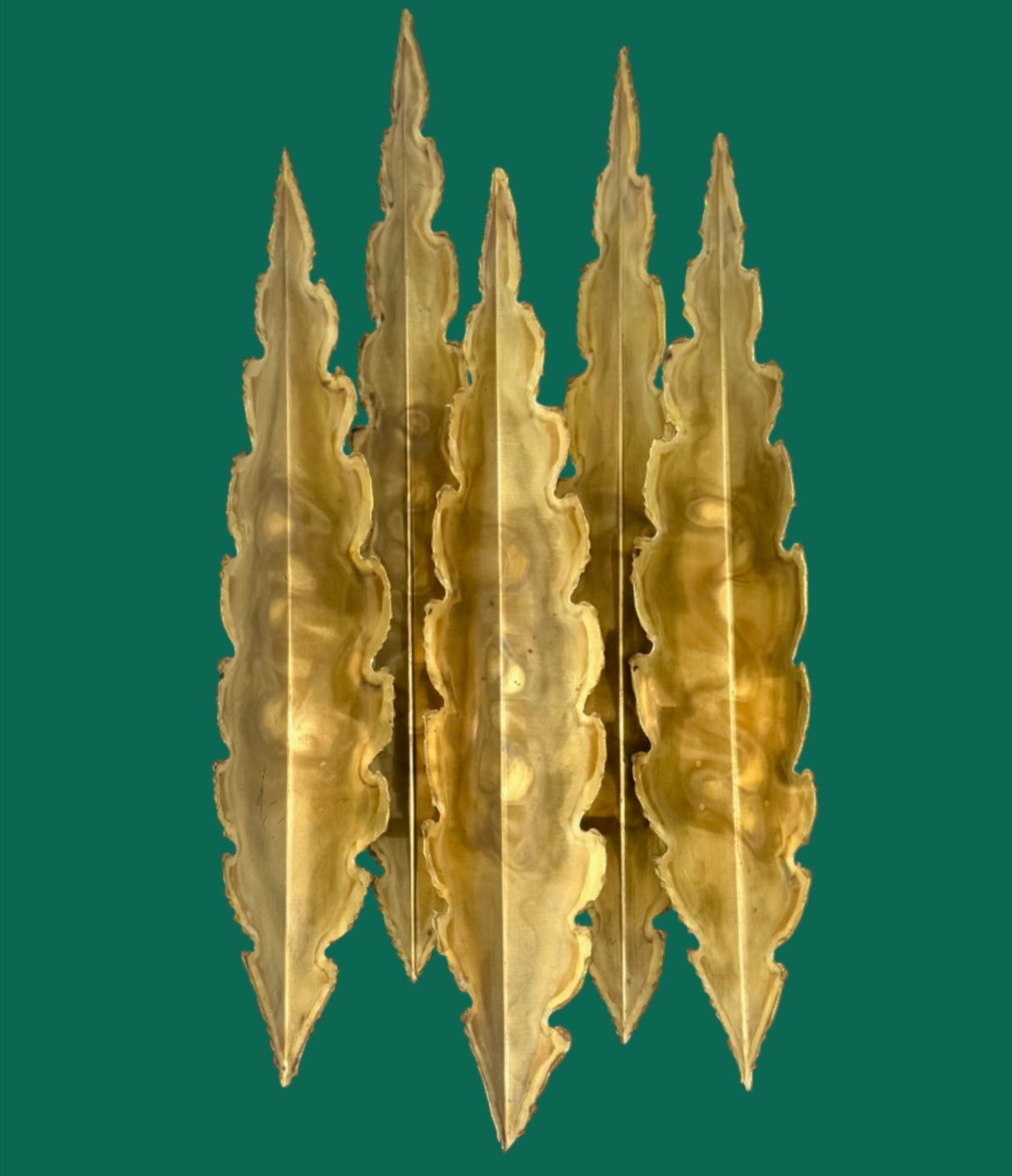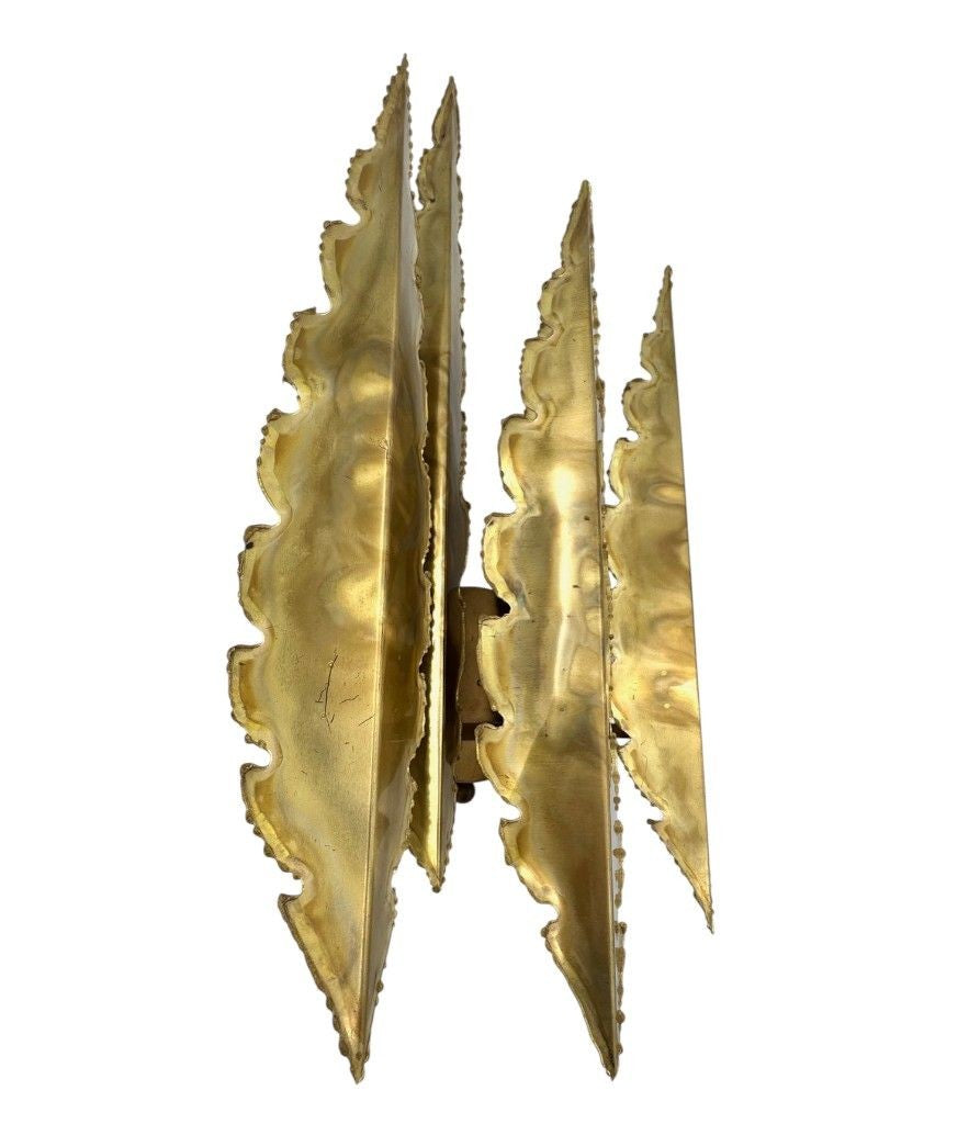 A pair of large 1960s 5 frond, torch cut brass wall sconces by Holm Sorensen. Each with three light fittings behind the brutalist fronds. Re wired with new brass fittings and PAT tested