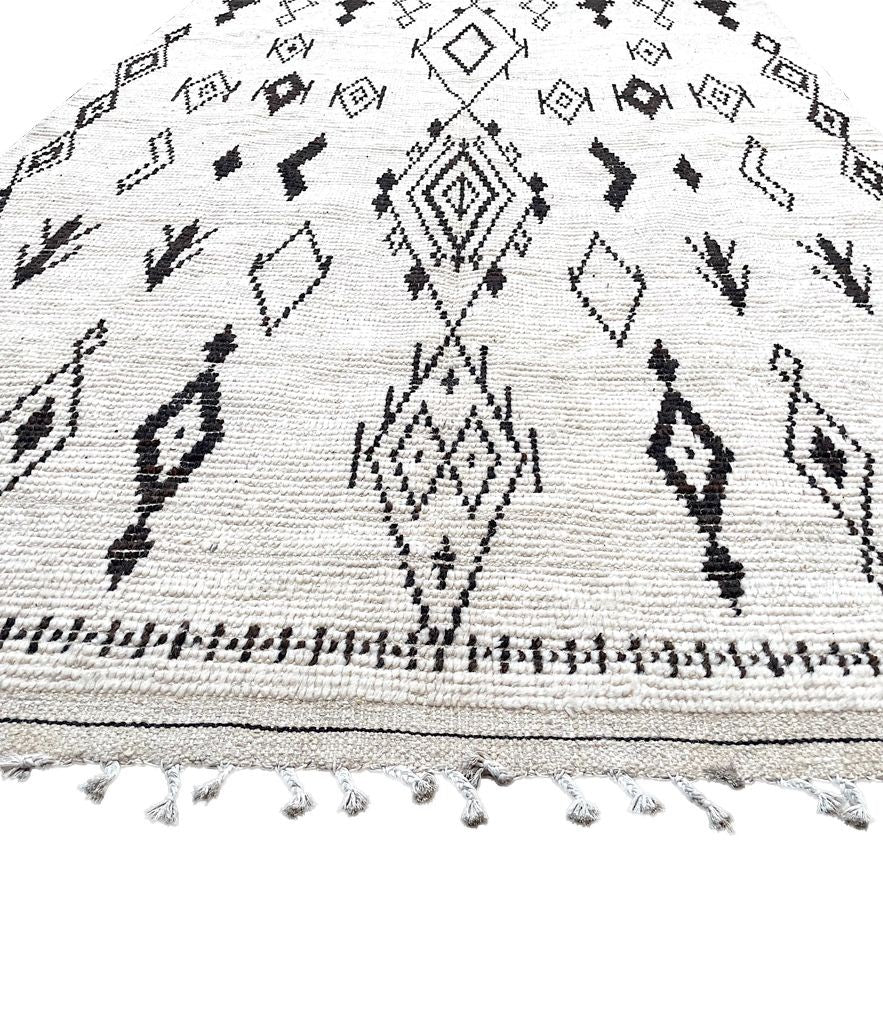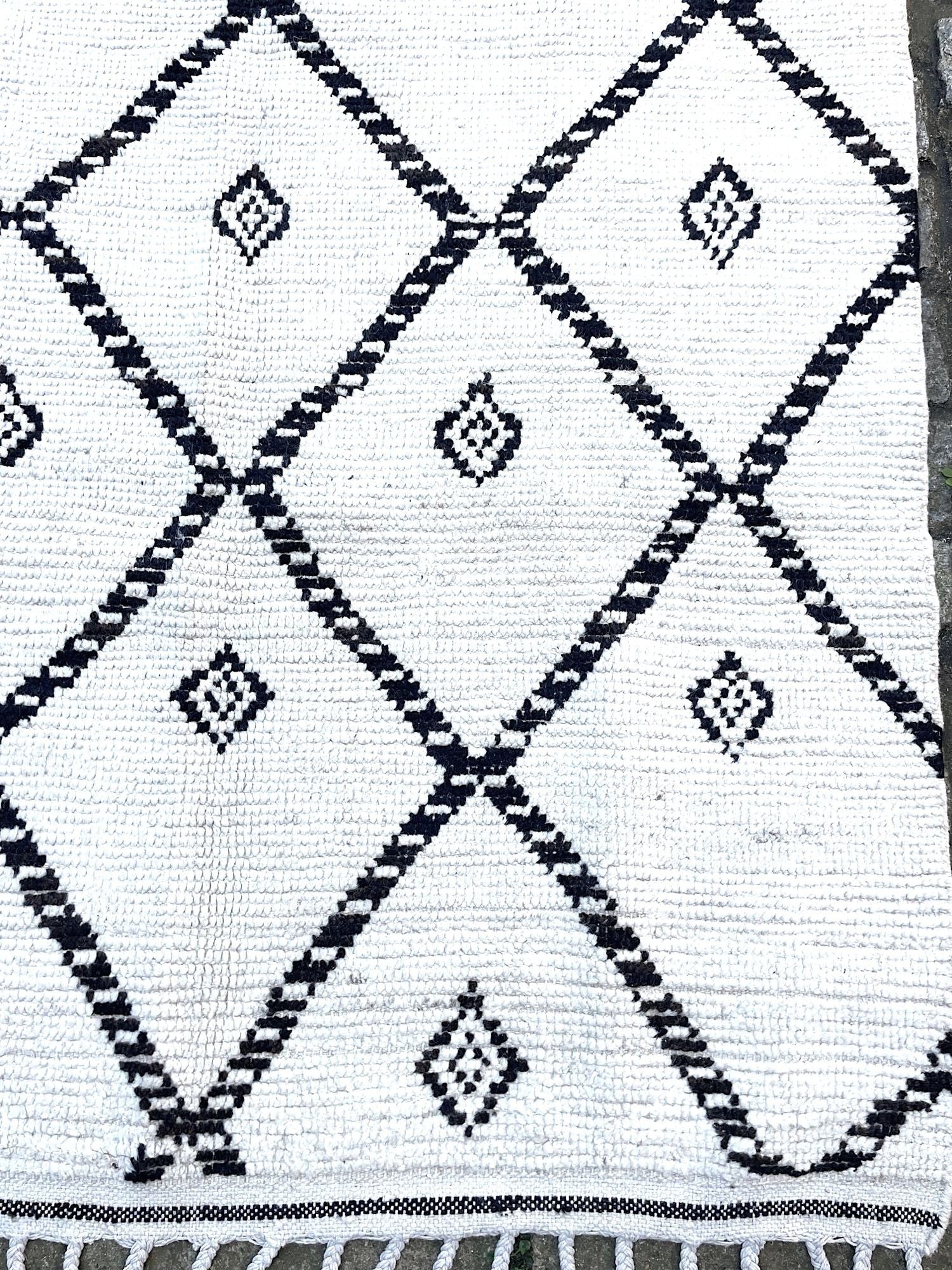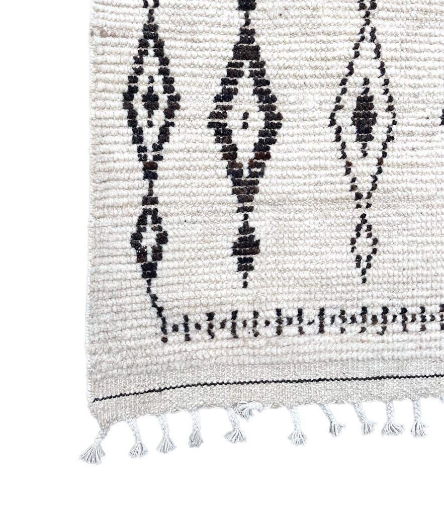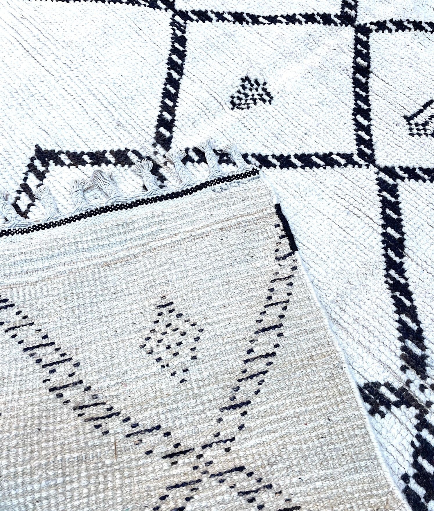 A vintage handwoven Moroccan berber rug with tribal diamond and line pattern, in black and white handwoven wool by the Beni Ouarian tribe. A wonderful geometric design with woven wool tassels on each end..