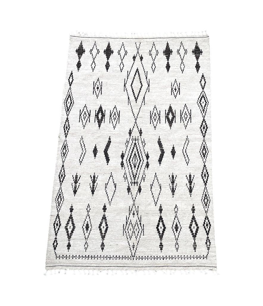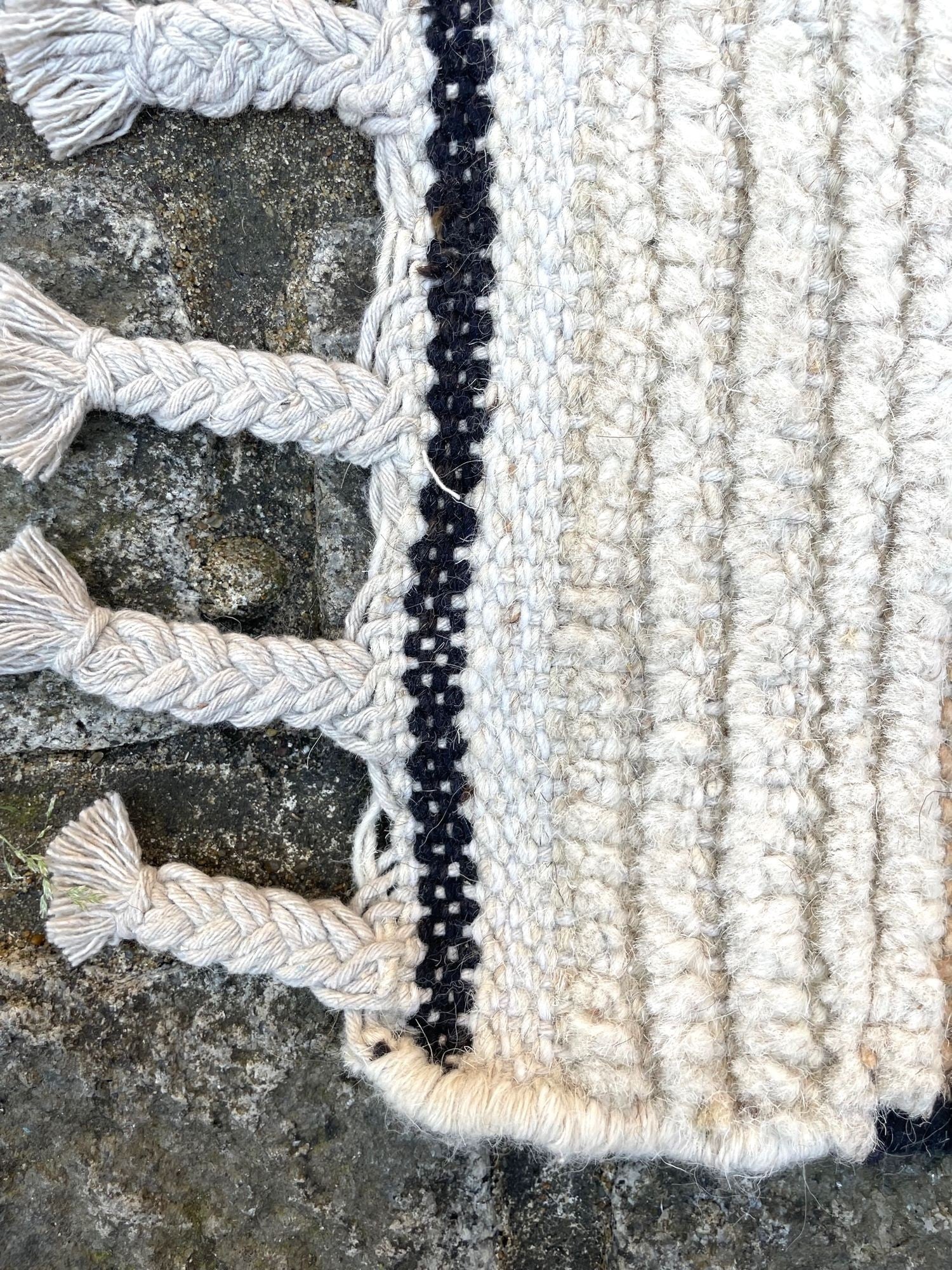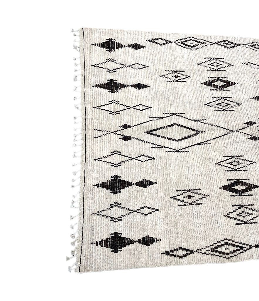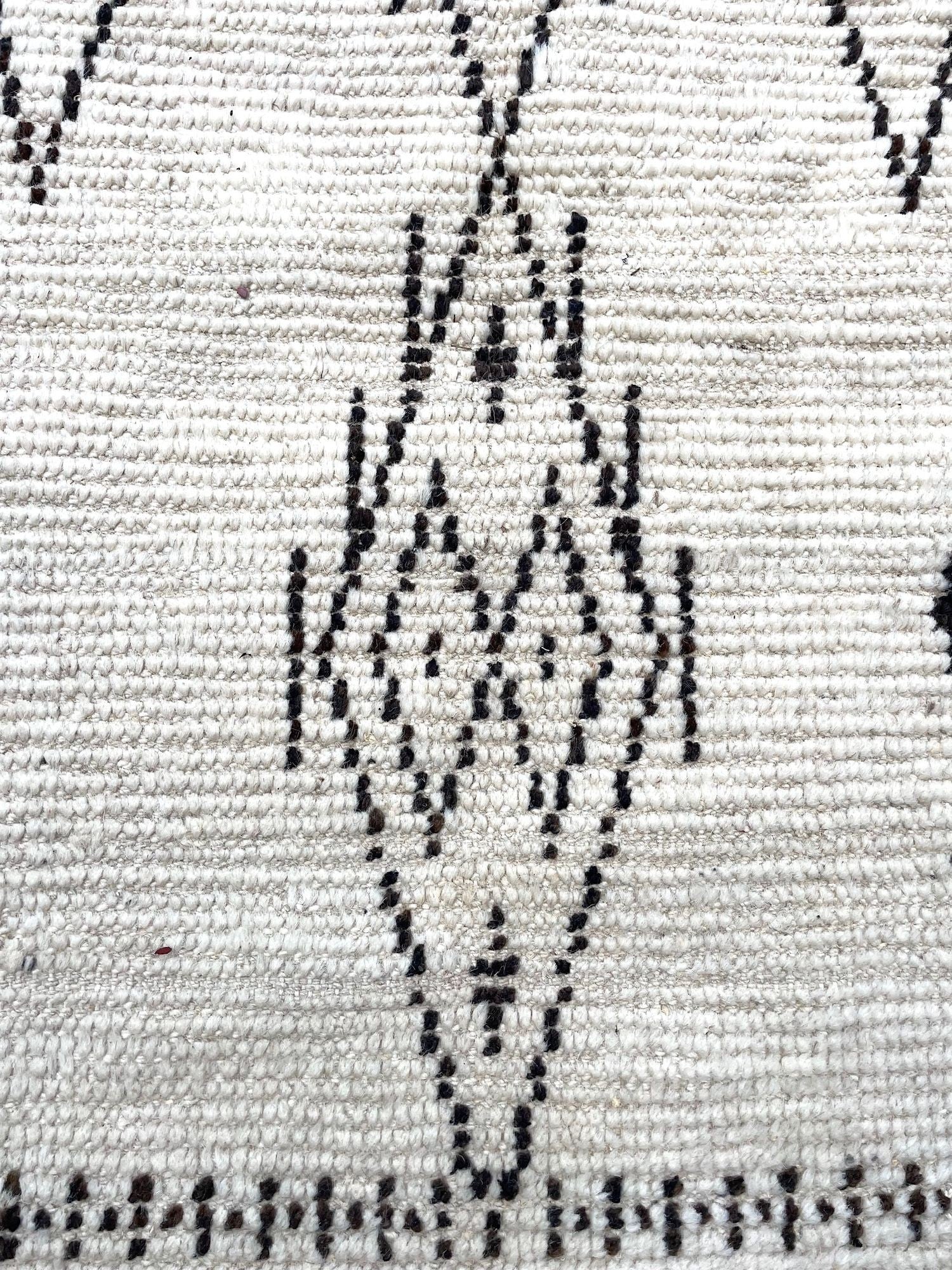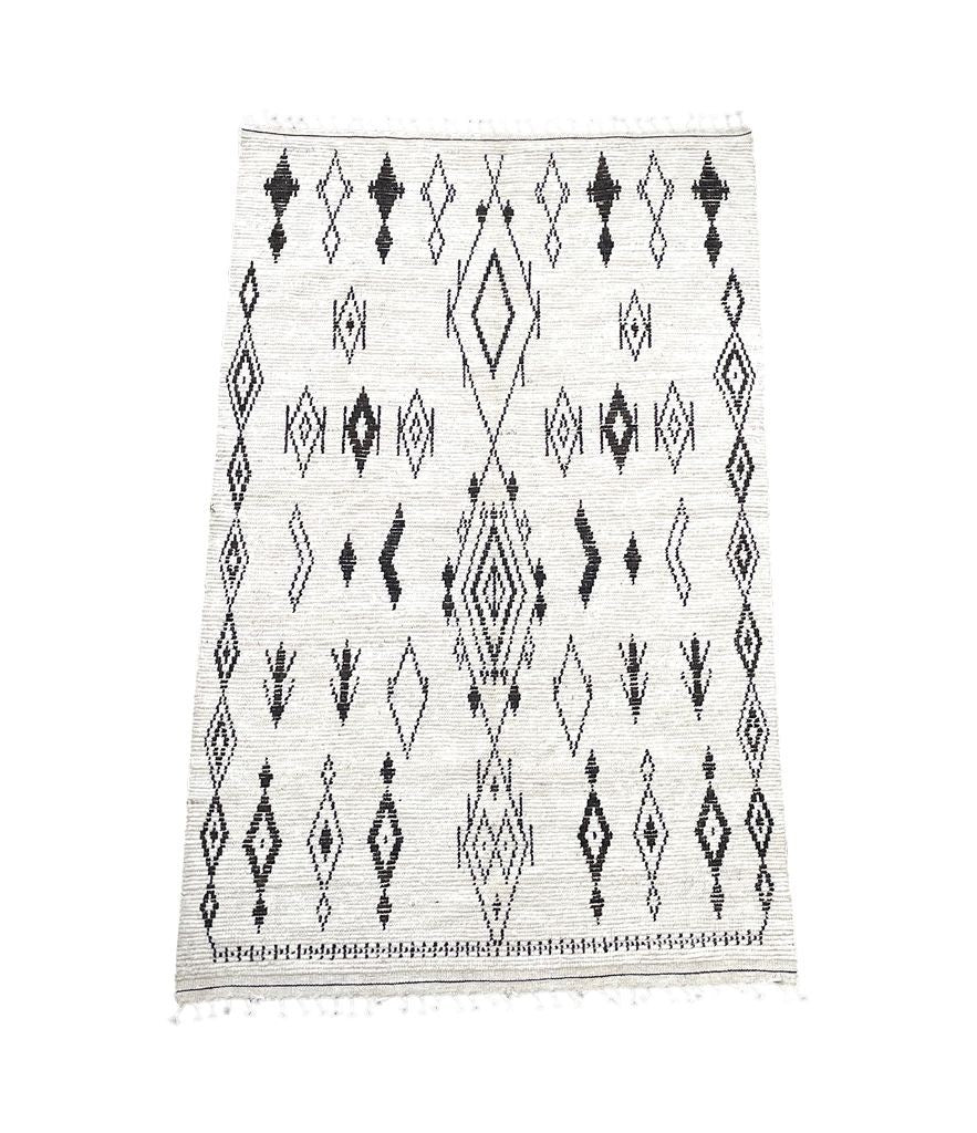 A vintage handwoven Moroccan berber rug with tribal diamond and line pattern, in black and white handwoven wool by the Beni Ouarian tribe. A wonderful geometric design with woven wool tassels on each end..
