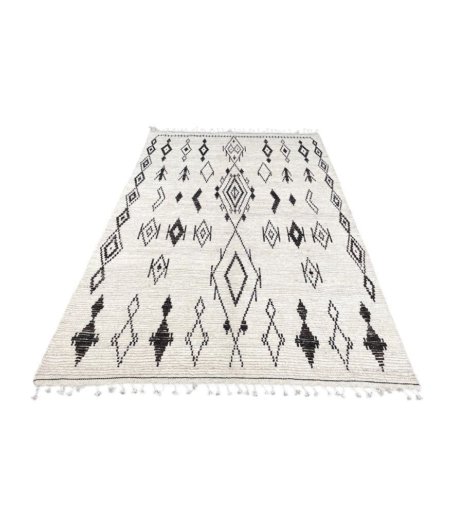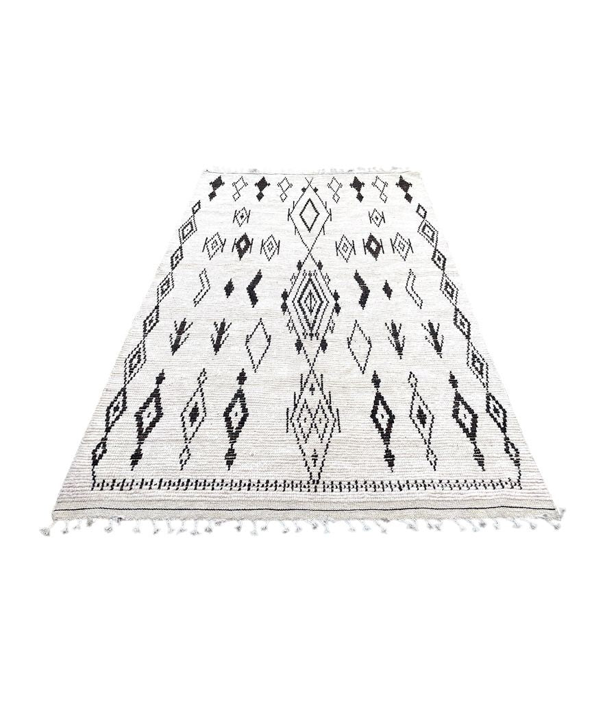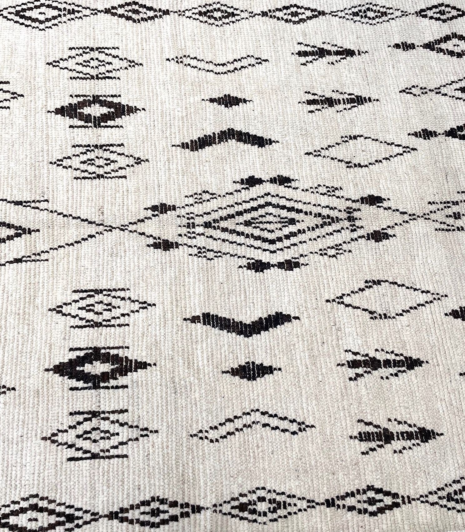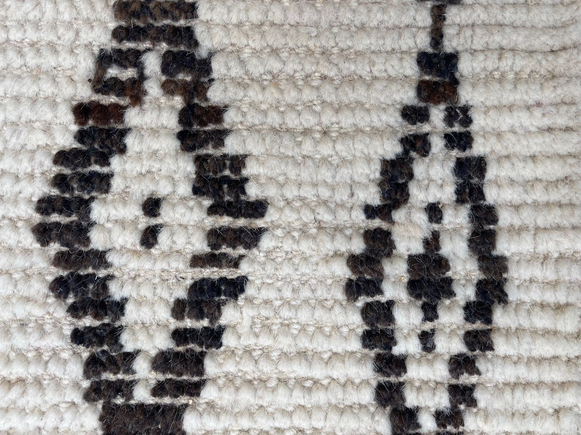 A vintage handwoven Moroccan berber rug with tribal diamond and line pattern, in black and white handwoven wool by the Beni Ouarian tribe. A wonderful geometric design with woven wool tassels on each end..